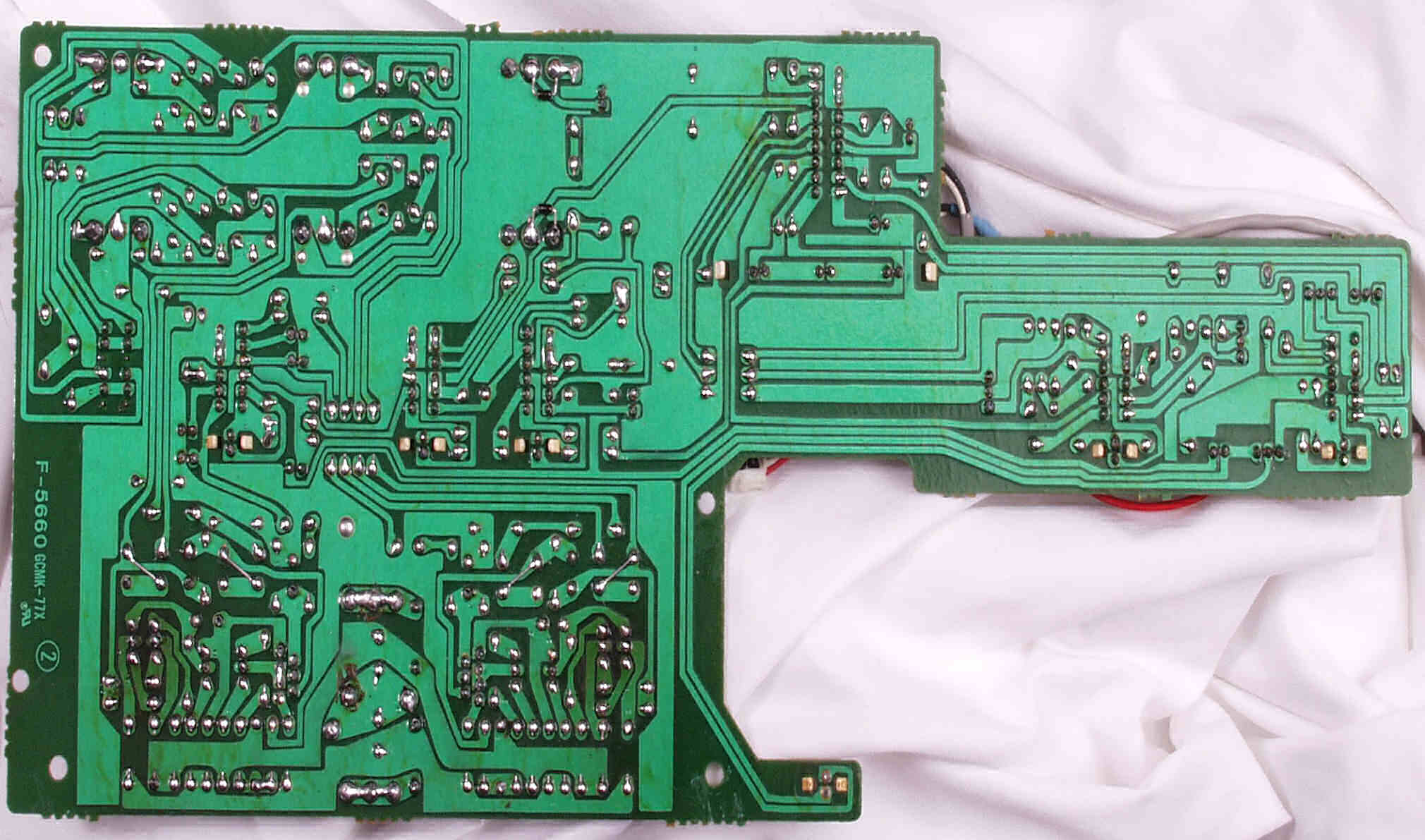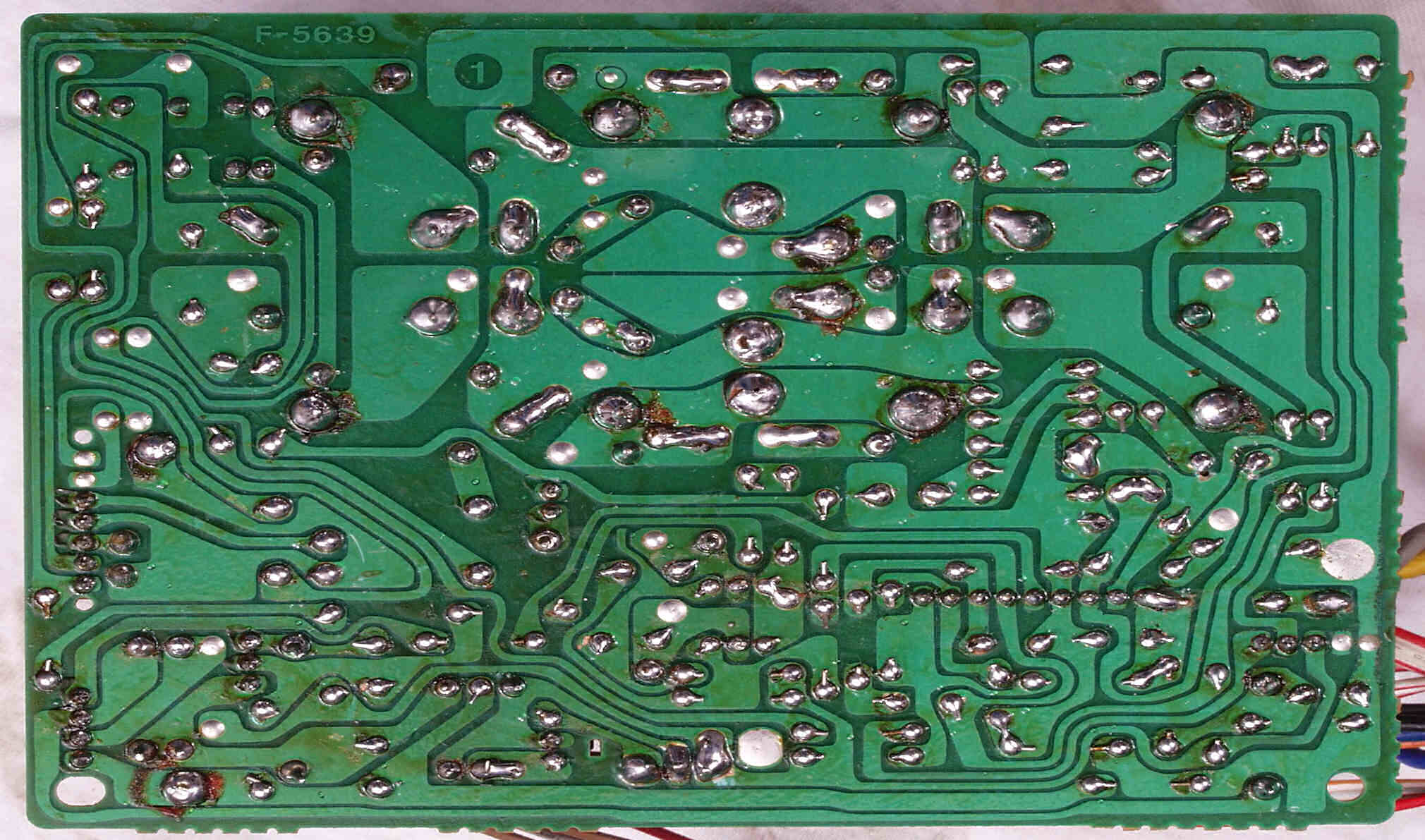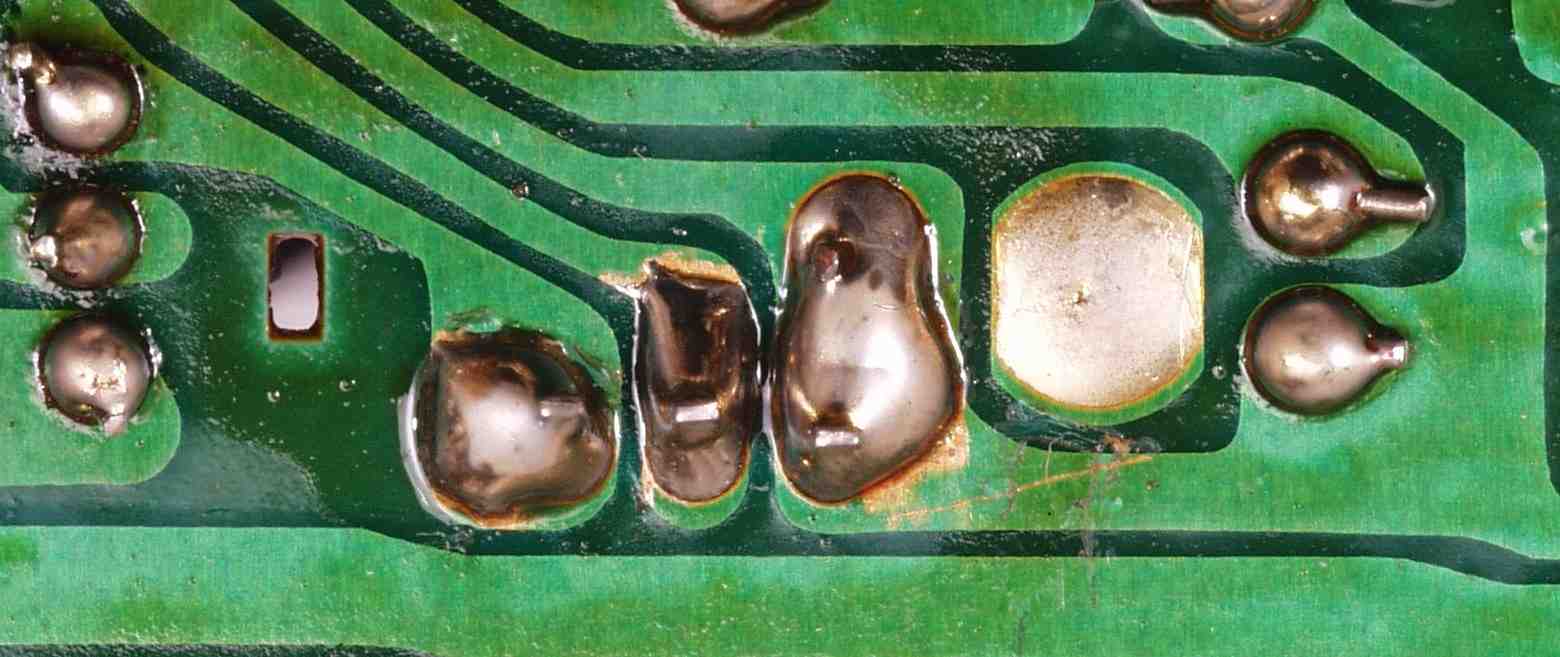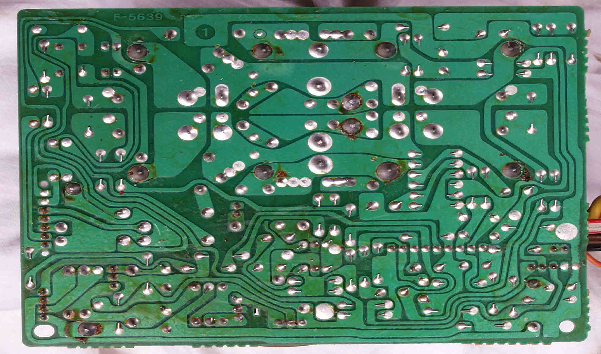 CG4. 修理後(ハンダ補正) 電源基板裏  全ての半田をやり修す、写真では5ヶ所残っているが、この跡補正
