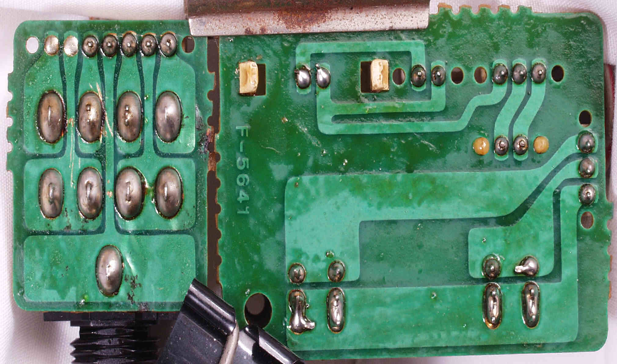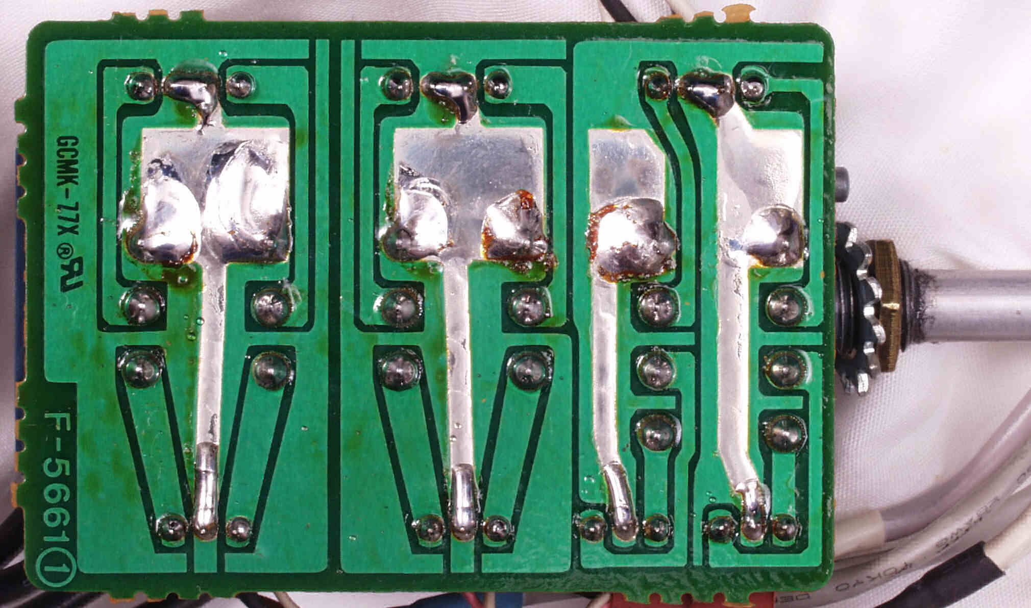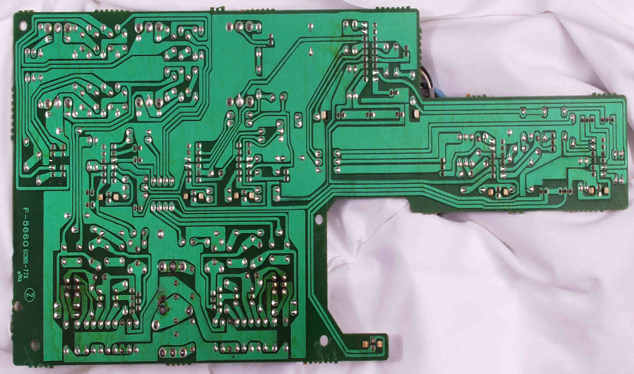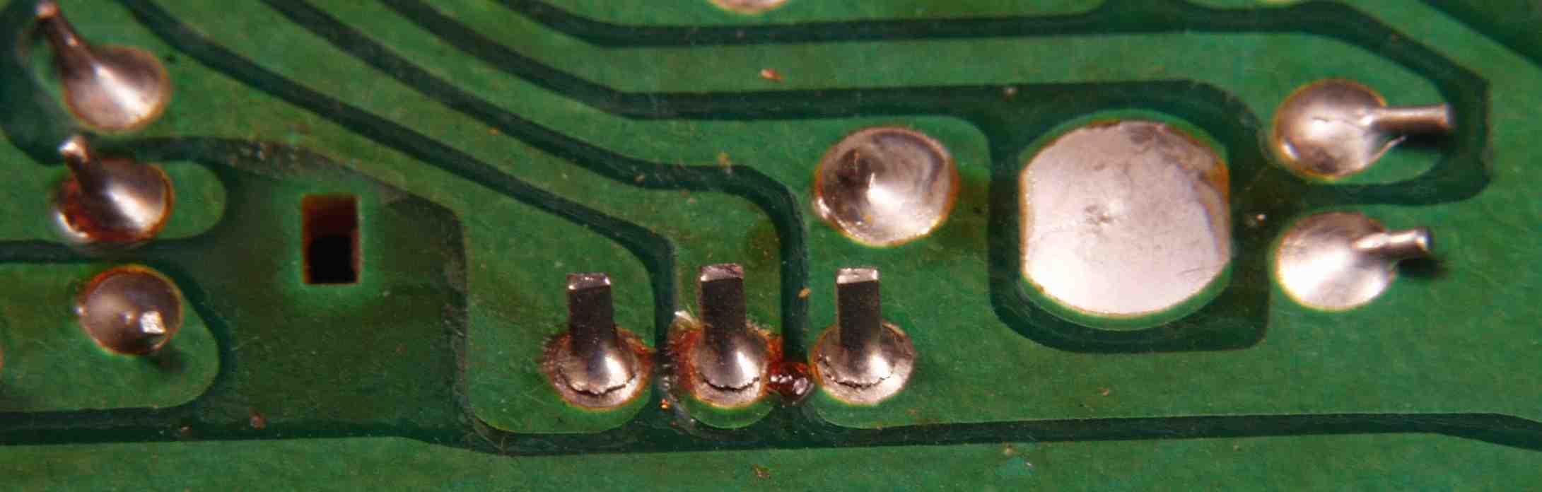 CG4. 修理後(ハンダ補正) 電源基板裏  全ての半田をやり修す、写真では5ヶ所残っているが、この跡補正