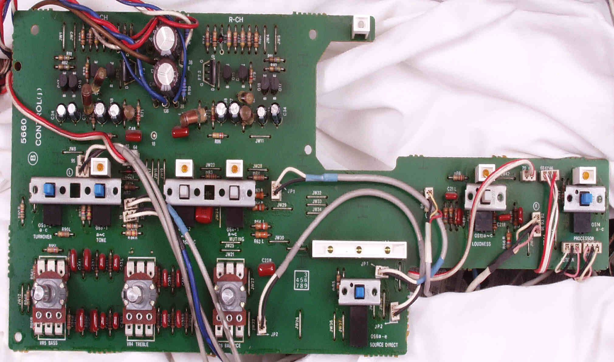 CE4. 修理後 R側終段基板 半固定VR4個、初段FET(電界効果トランジスター)、電解コンデンサ−16個交換