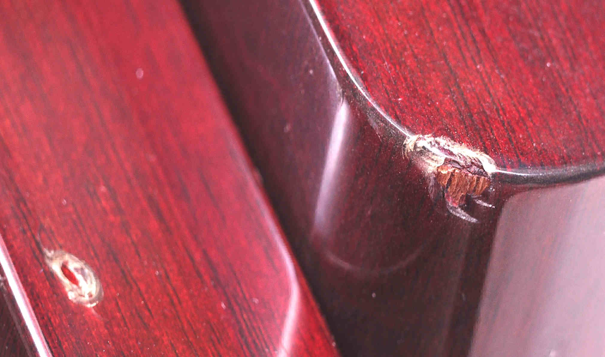 CJ1. 修理前 側面木パネルの割れ(ヒビ)、この位の内に補修すると良い、ほっておくとドンドン広がる
