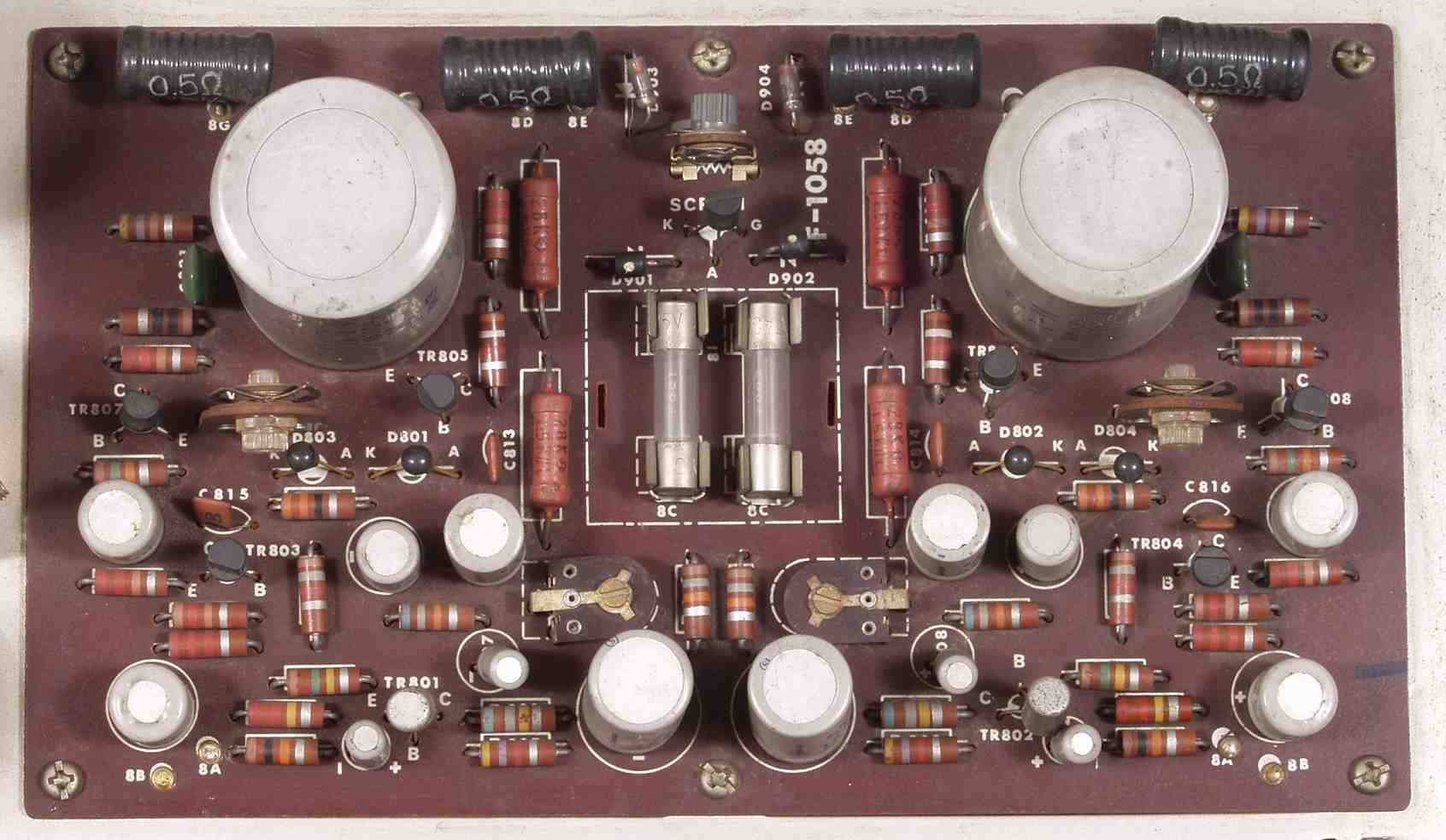 C−1B. 修理後 ドライブ基板 バランス・バイアス調整用半固定VR5個、電解コンデンサー18個、TR(トランジスタ−)8個交換