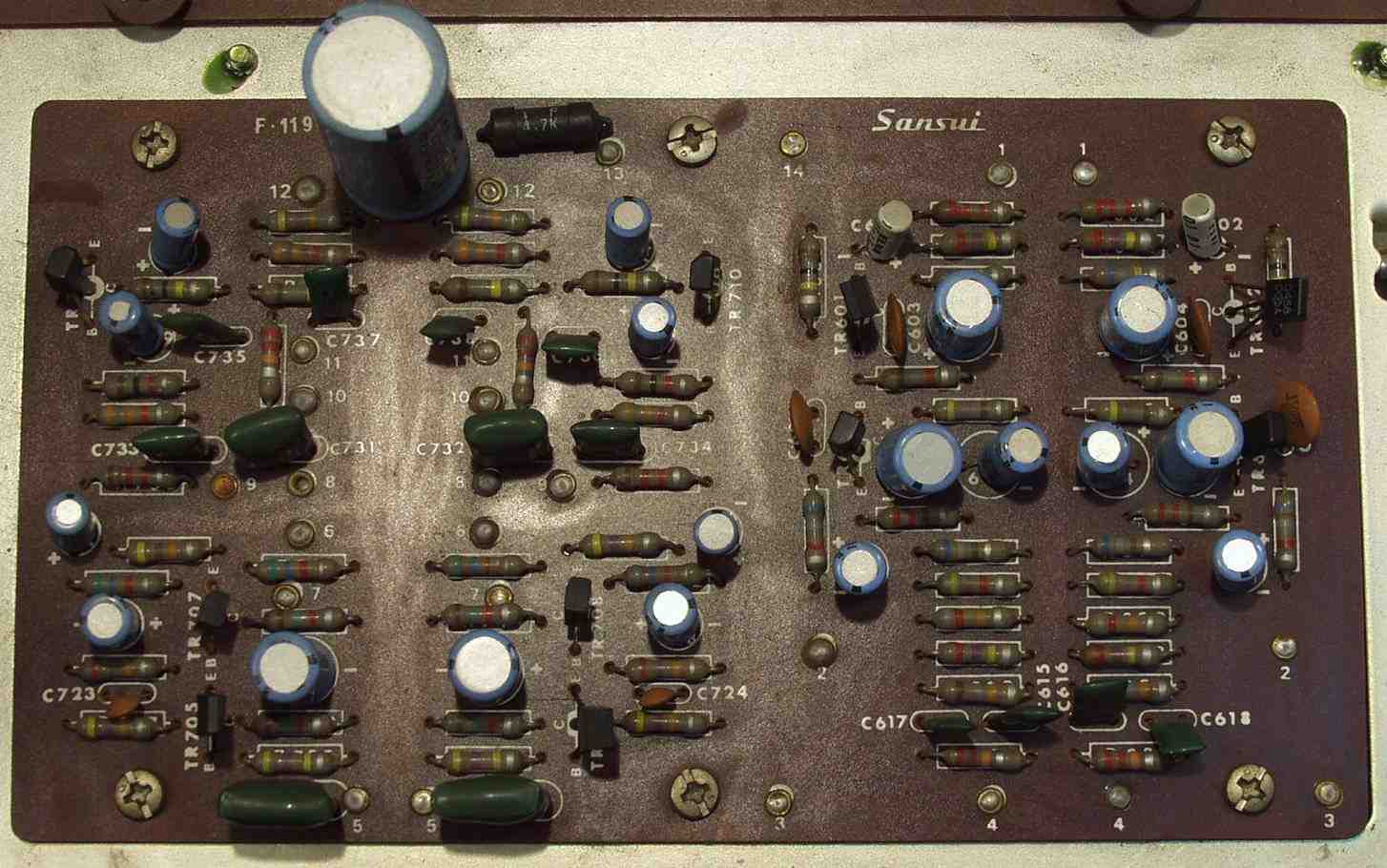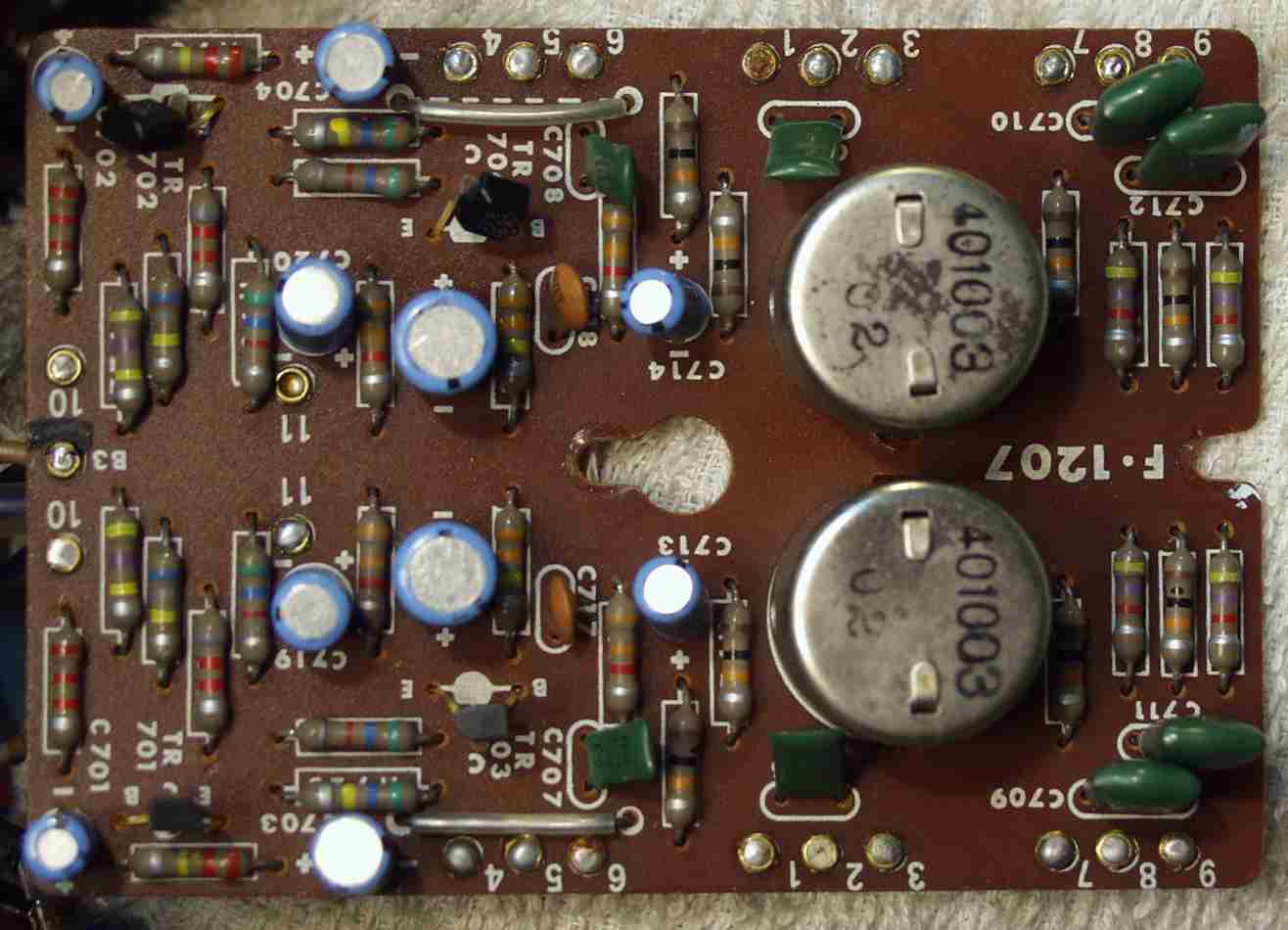 | C−5B. 修理後 EQ−AMP 電解コンデンサー21個 フイルムコンデンサー2個 TR(トランジスター)4個交換 | ||||||||||||||||||||||||||||||||||||||||||||||||||||||||||