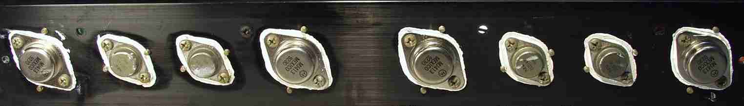| C. 修理状況 C−1A. 修理前 上から見る。 大=終段トランジスター、 中=ドライブ・トランジスター 熱でシリコングリスが流れ出し殆ど無い |