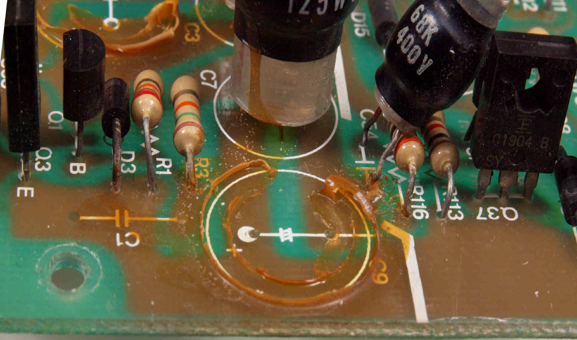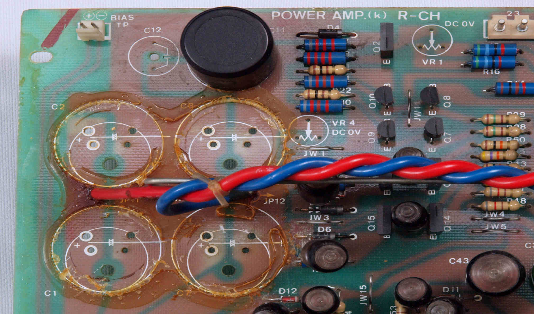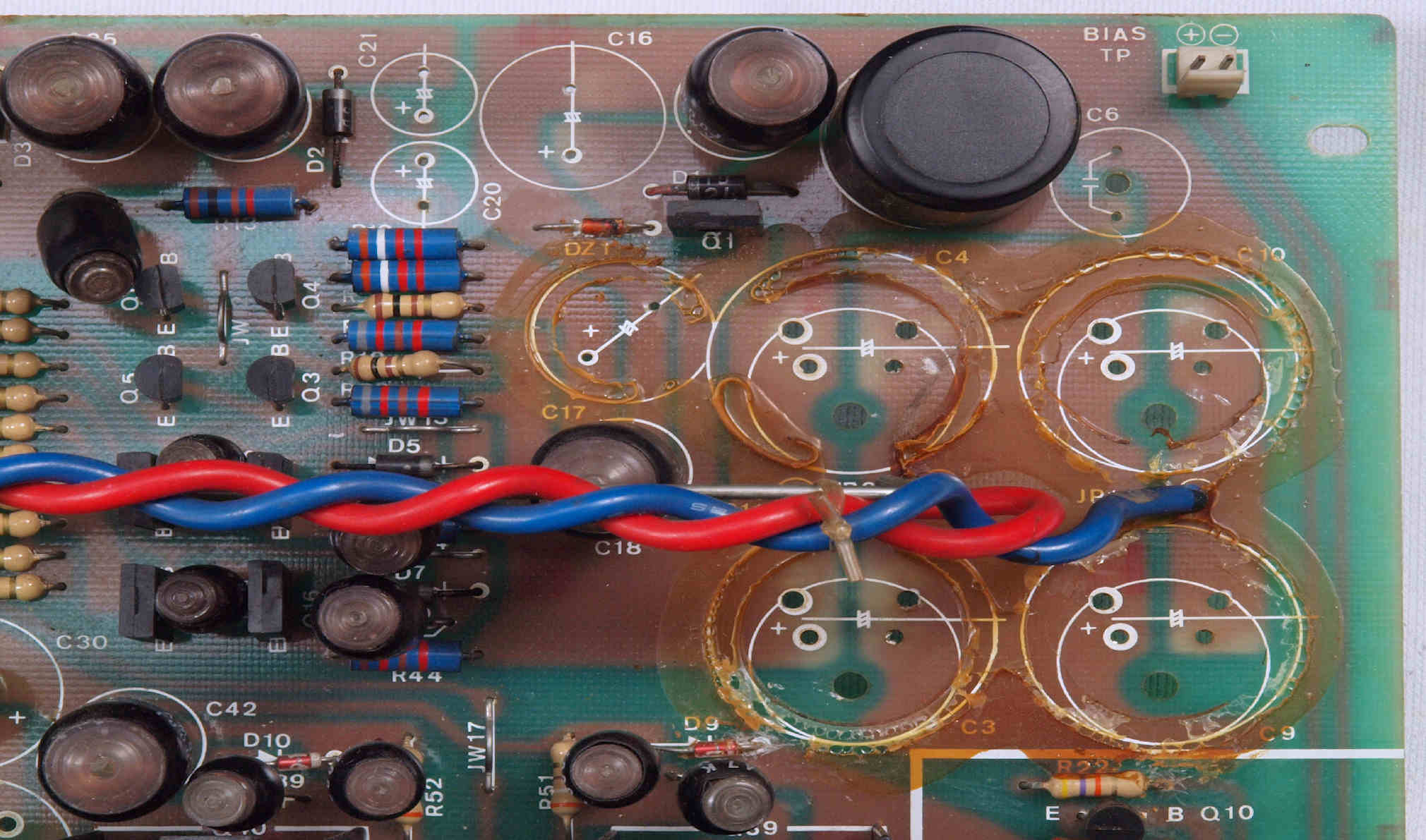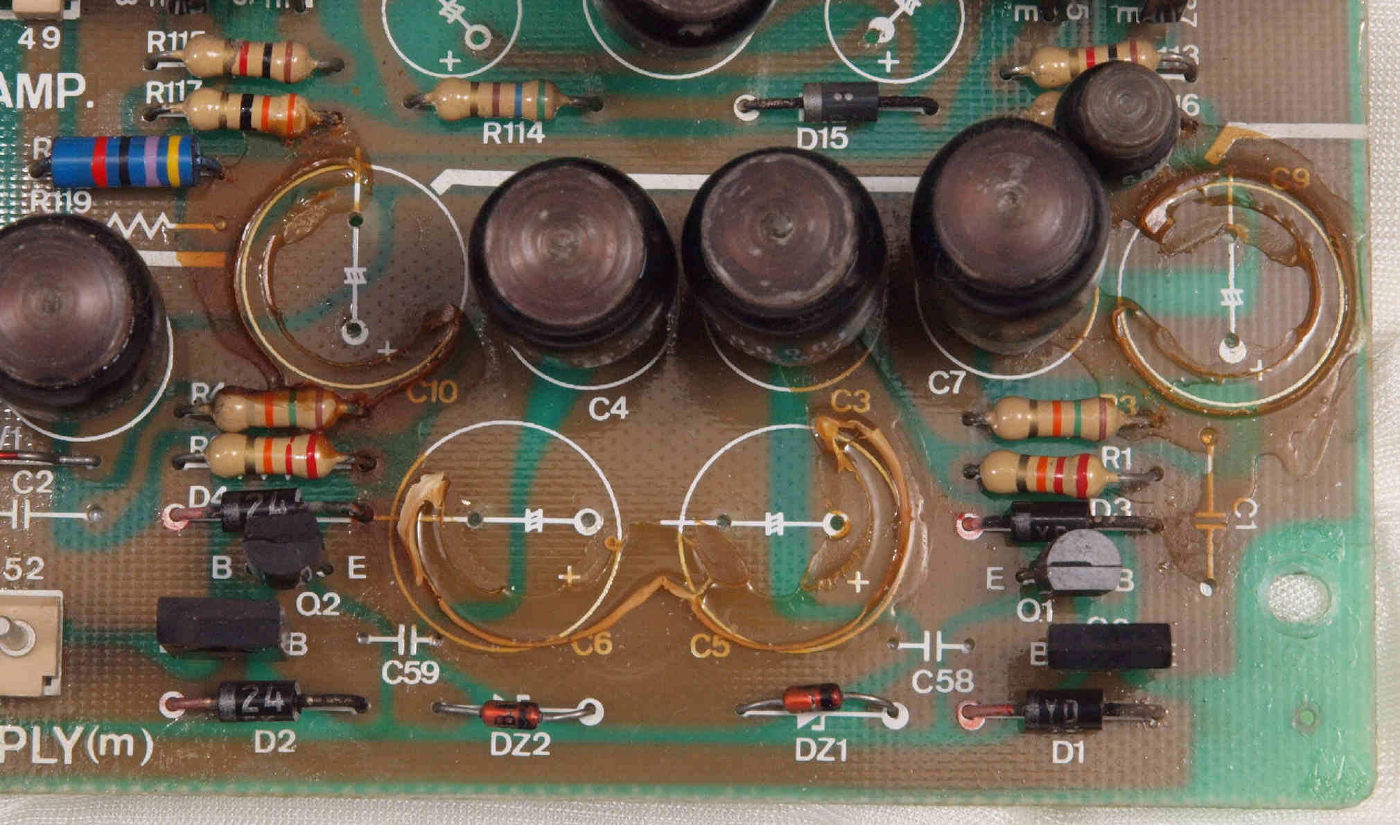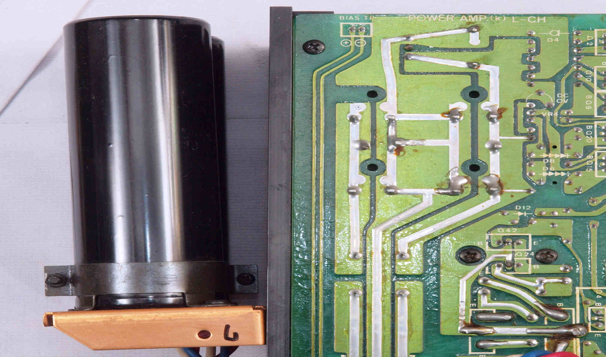 | C134. 修理中 R側AMP基板、電解コンデンサー固定用の接着材2、当時は溶媒にトルエンが使用されており、銅を腐食する。 | ||||||||||||||||||||||||||||||