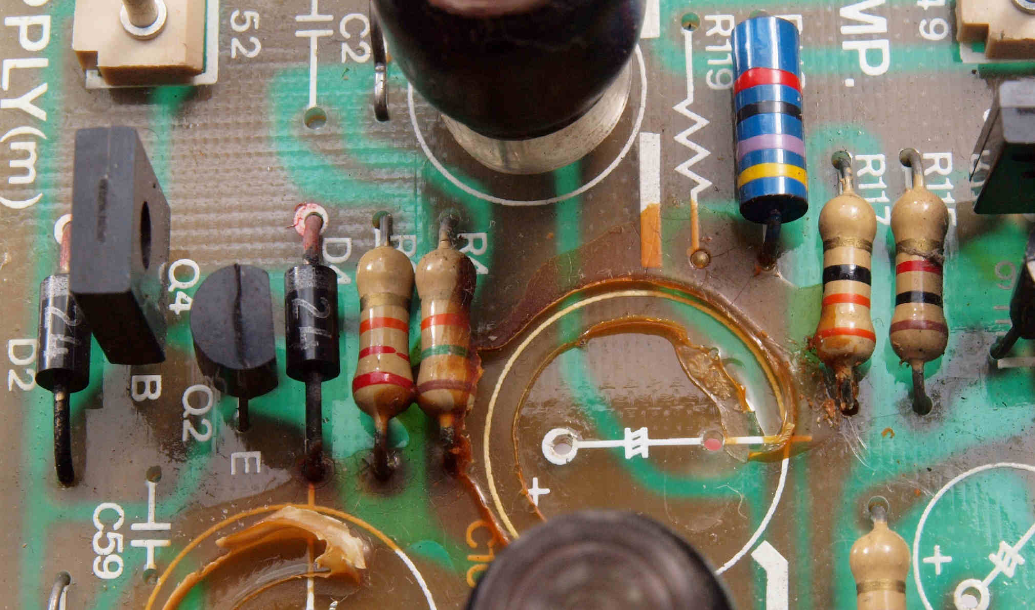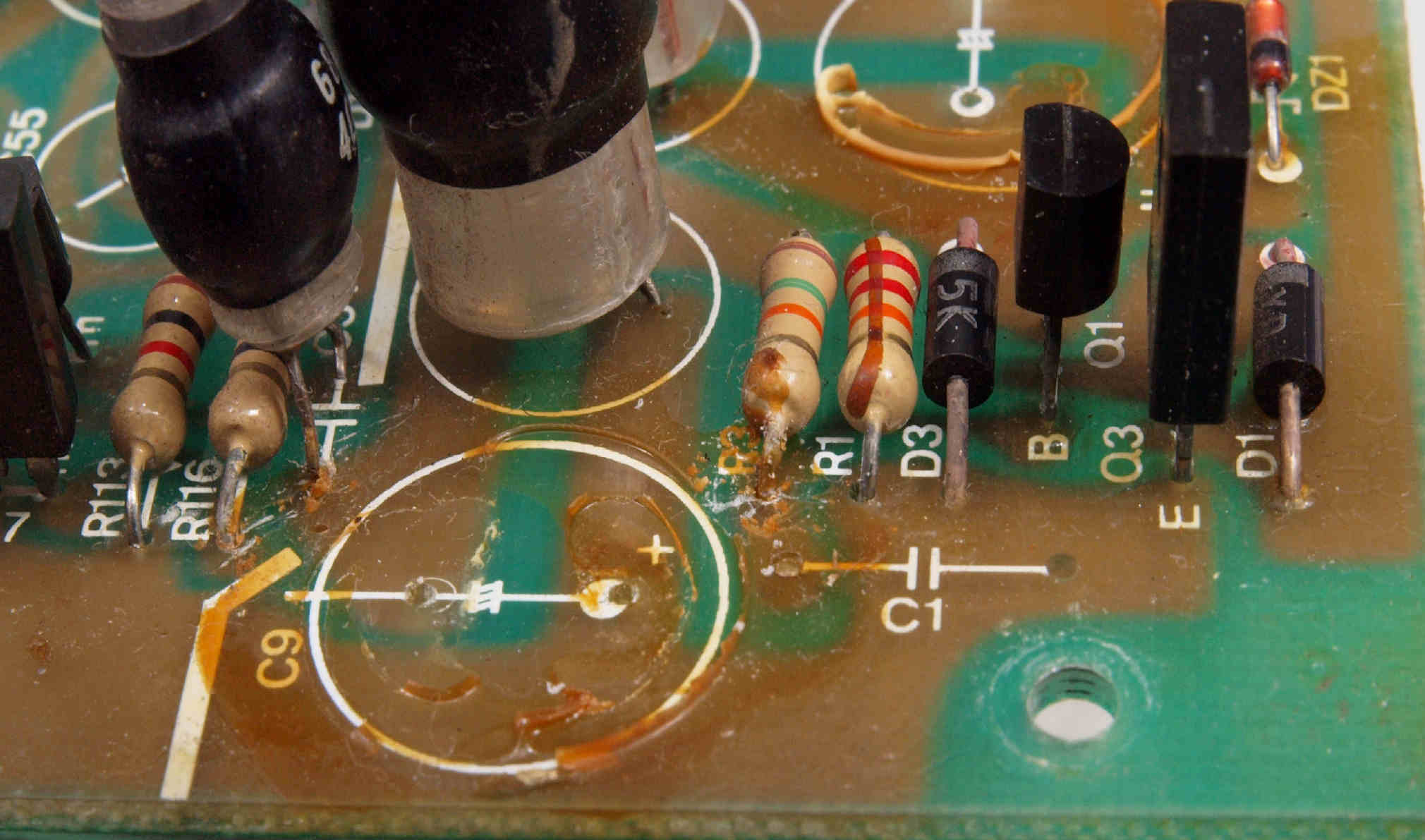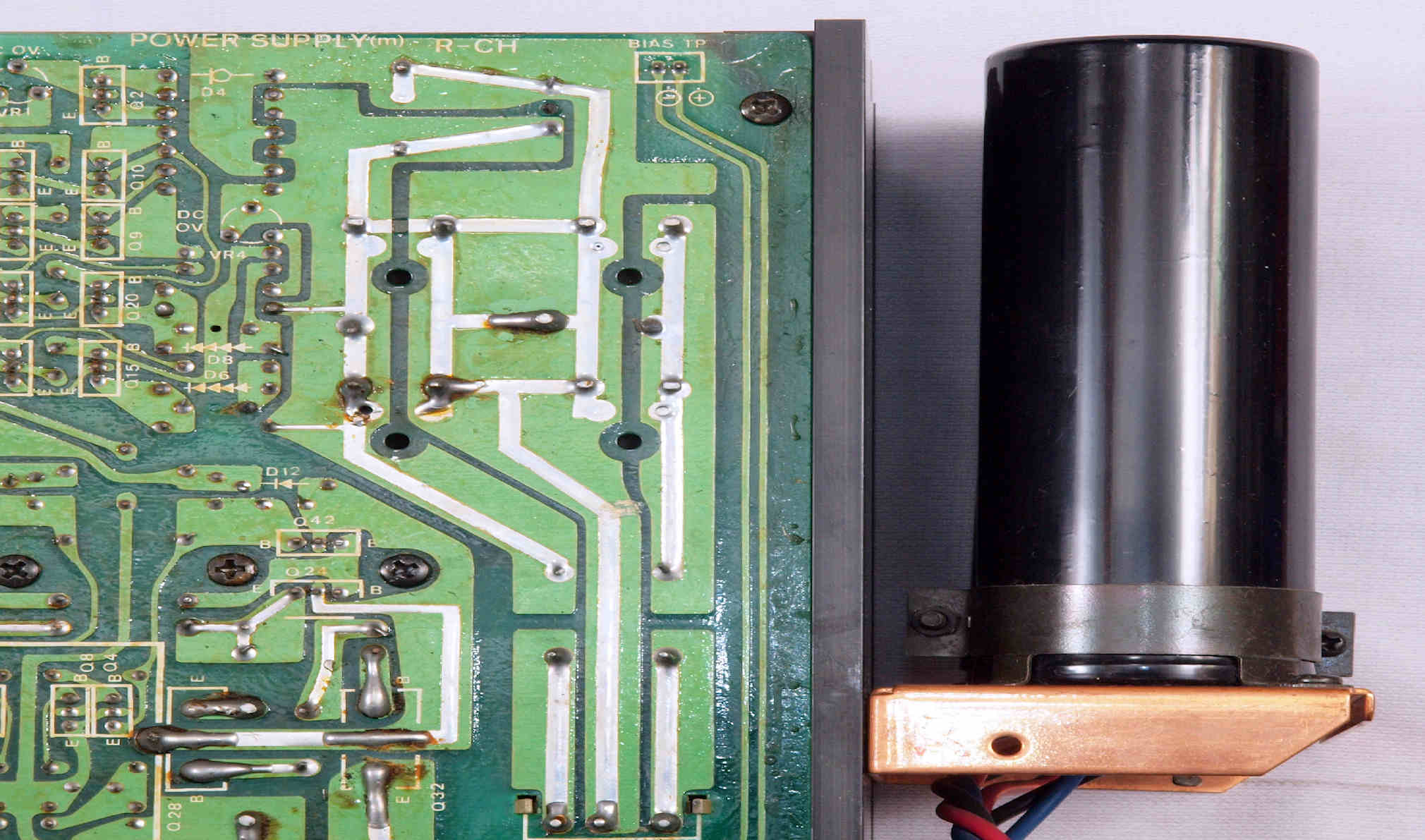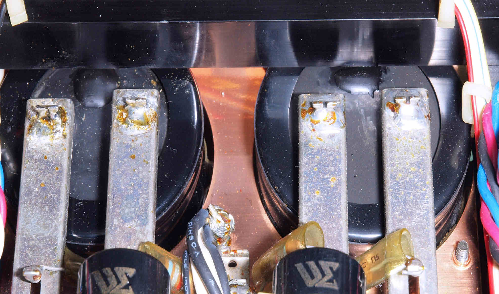 | C134. 修理中 R側AMP基板、電解コンデンサー固定用の接着材2、当時は溶媒にトルエンが使用されており、銅を腐食する。 | ||||||||||||||||||||||||||||||