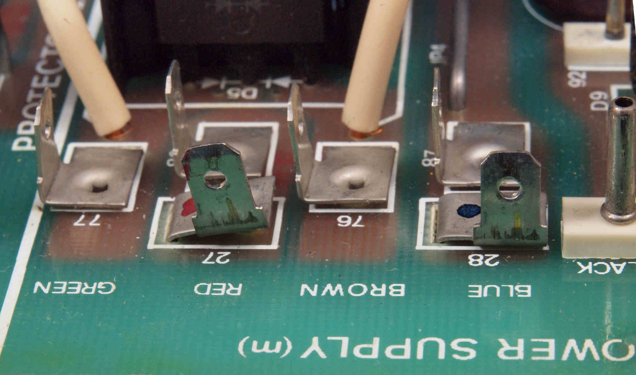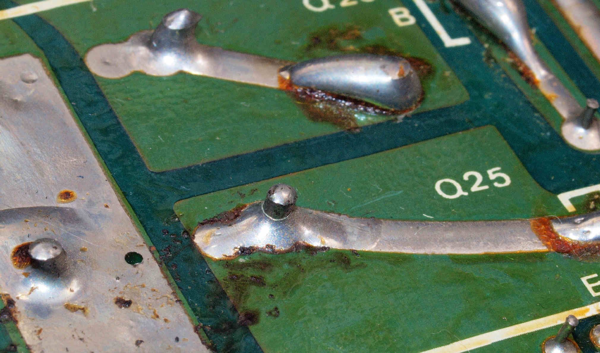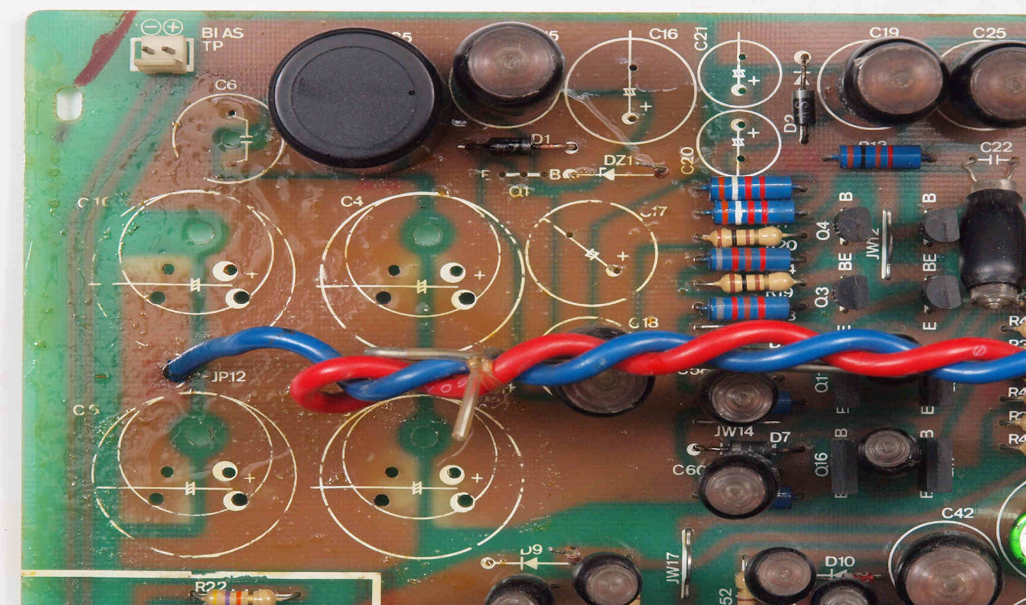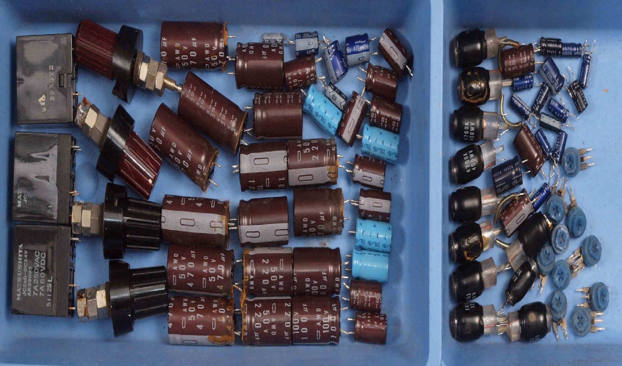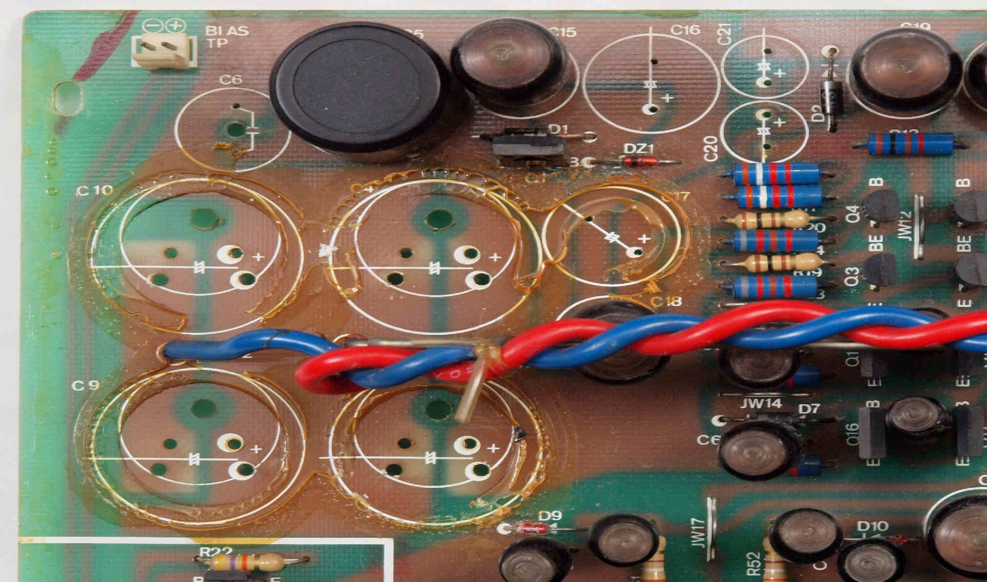 | C134. 修理中 R側AMP基板、電解コンデンサー固定用の接着材2、当時は溶媒にトルエンが使用されており、銅を腐食する。 | ||||||||||||||||||||||||||||||