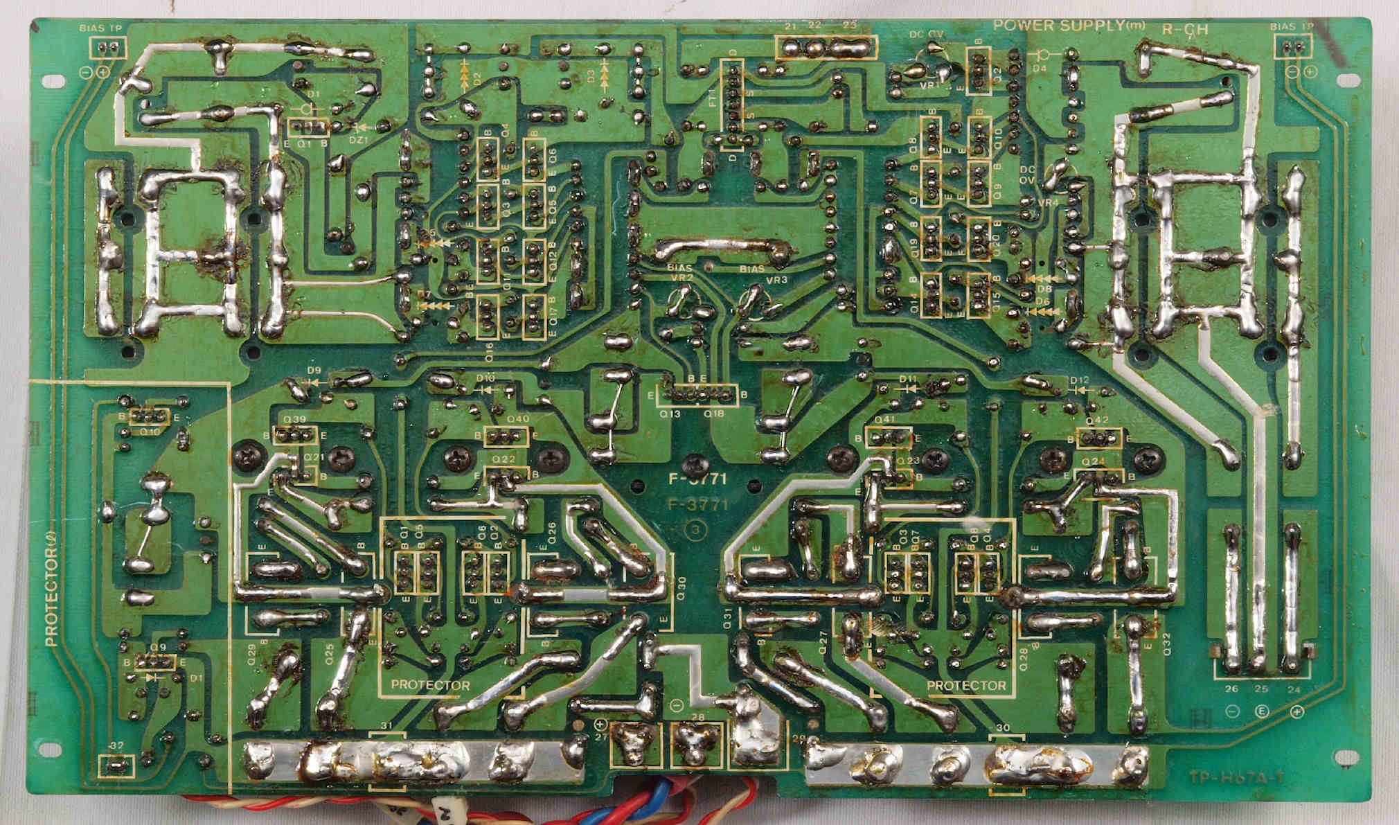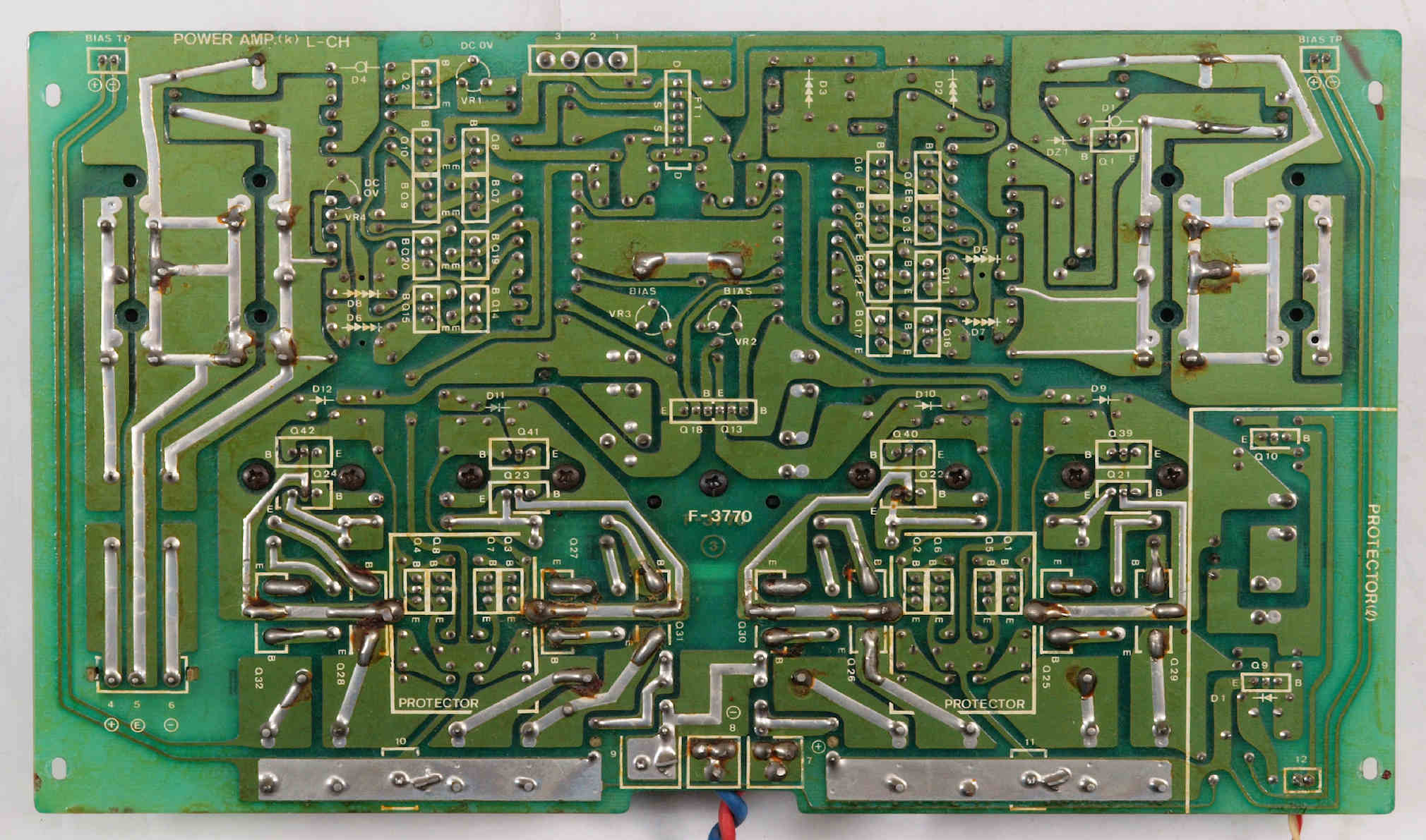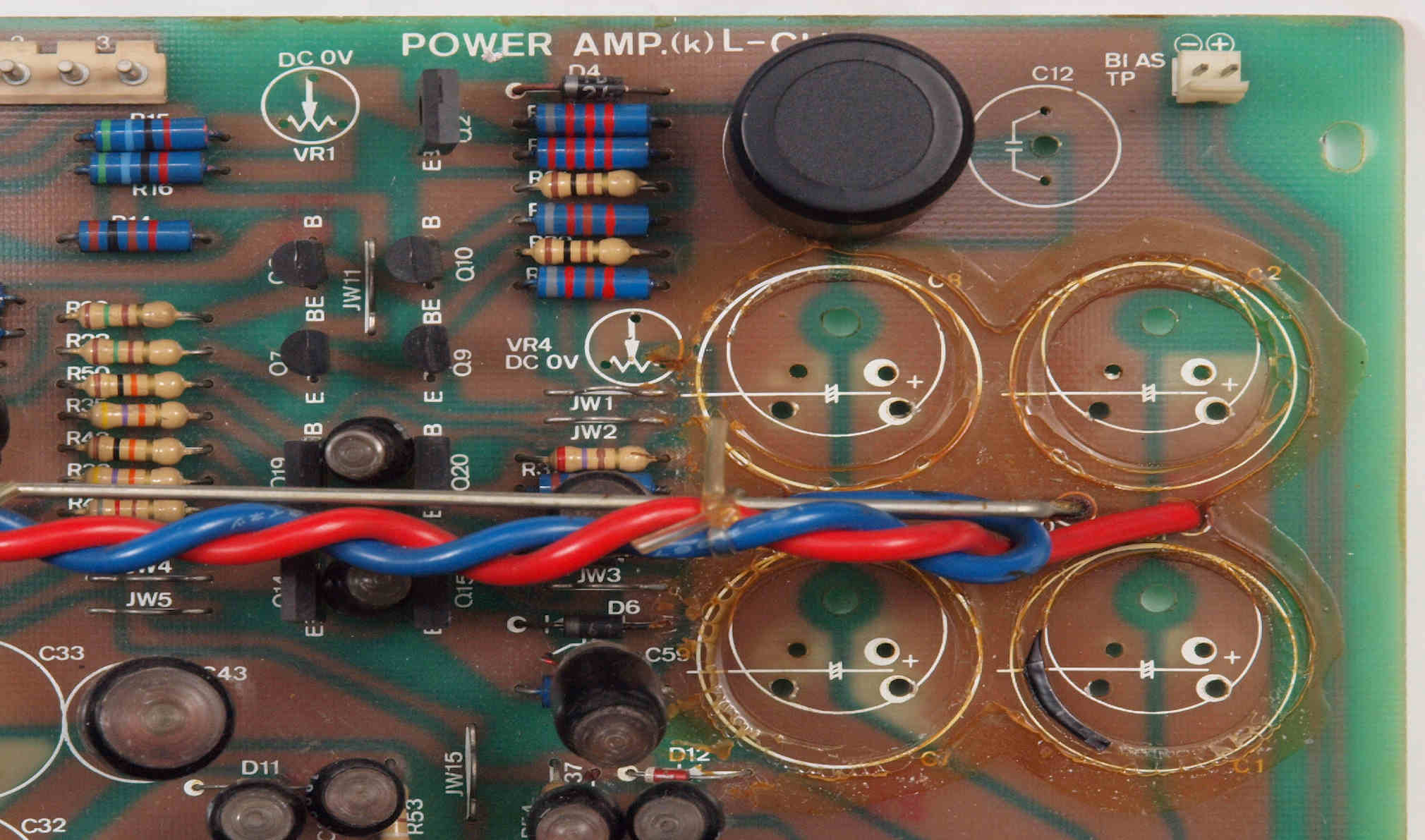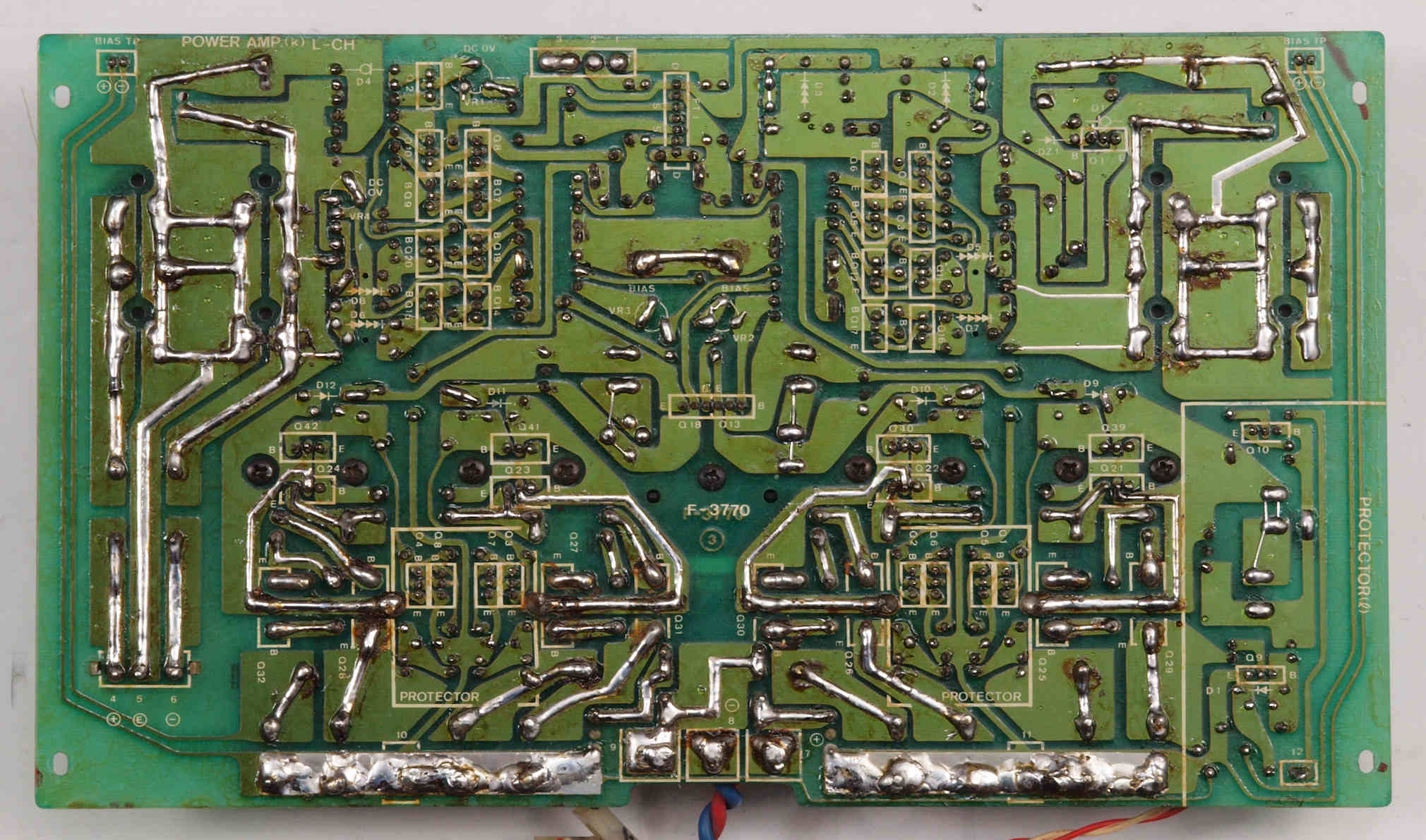 | C132. 修理中 R側AMP基板、電解コンデンサー固定用の接着材、当時は溶媒にトルエンが使用されており、銅を腐食する。 | ||||||||||||||||||||||||||||||