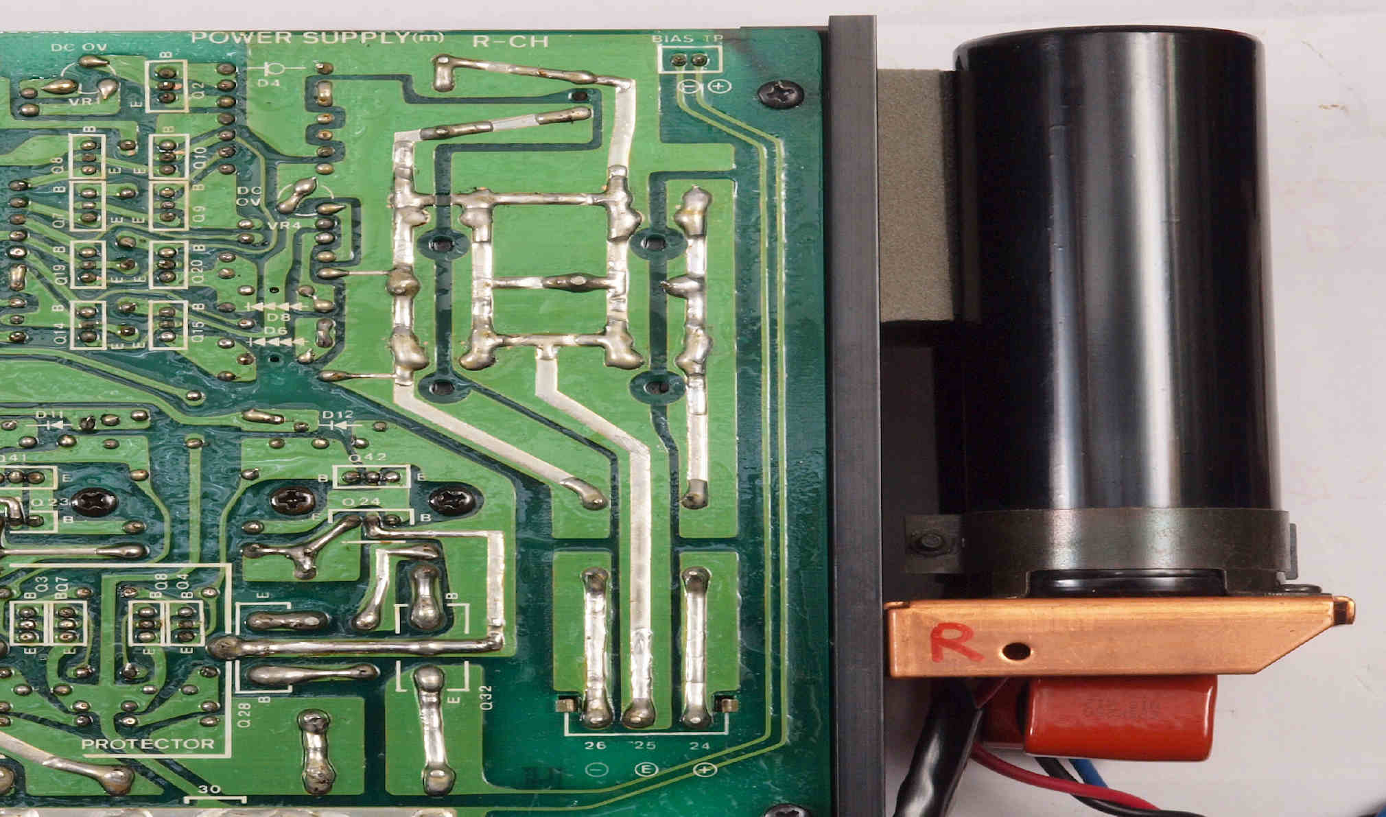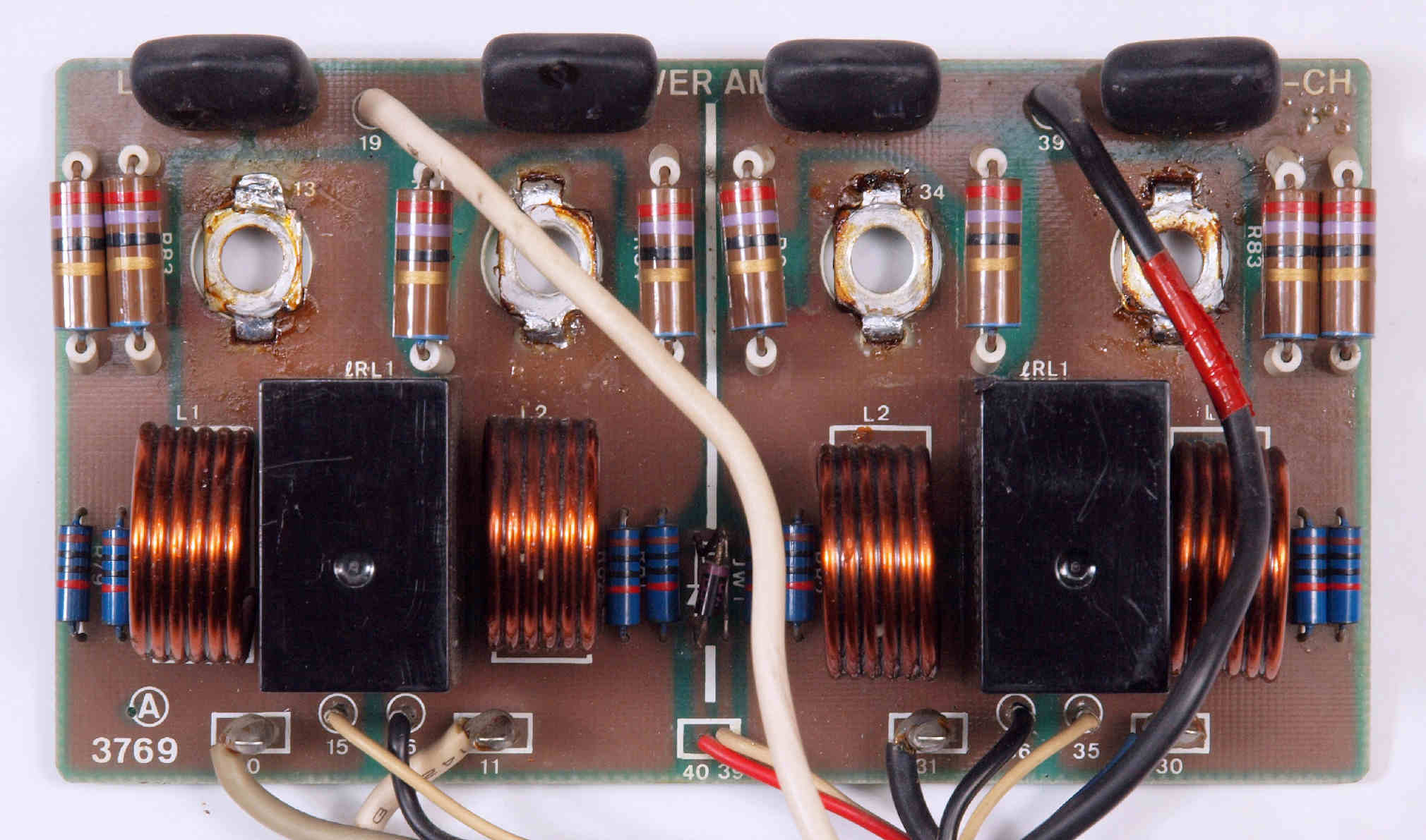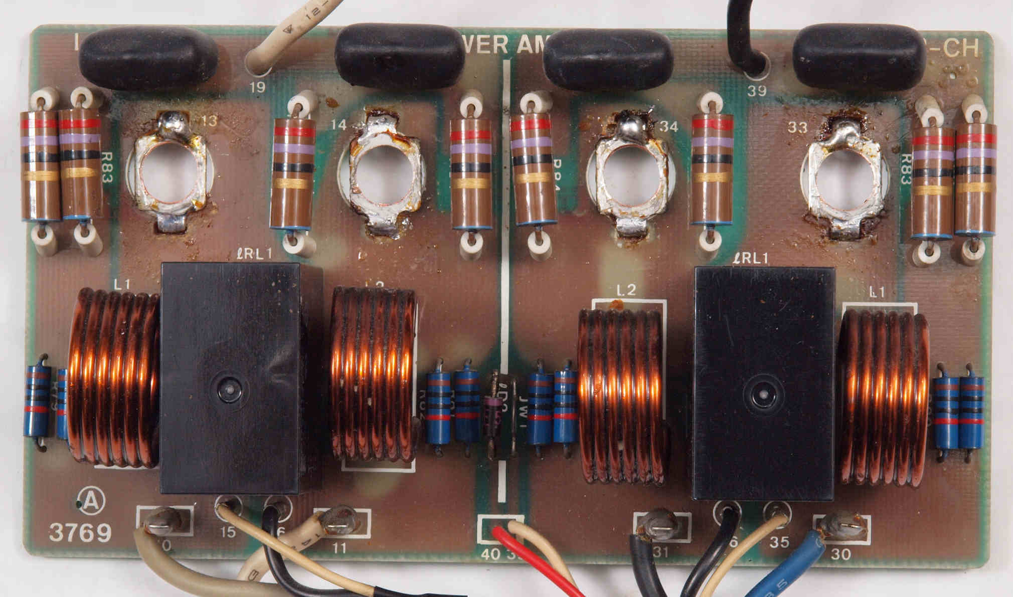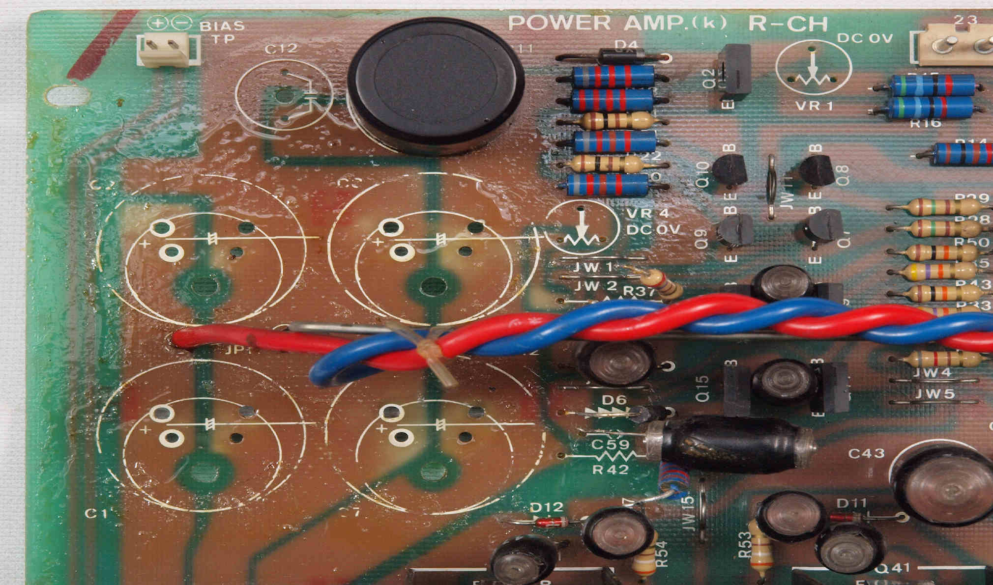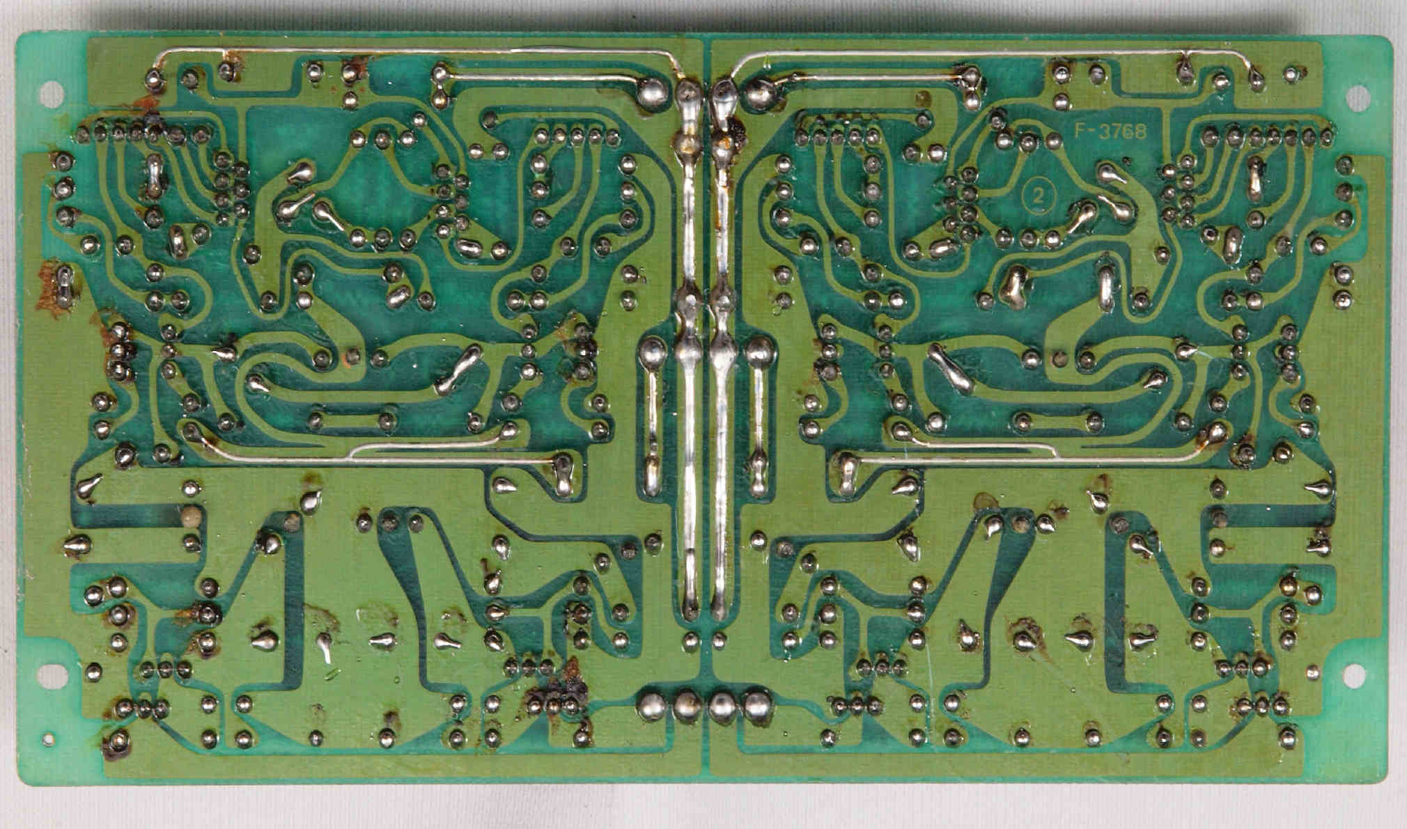 | C132. 修理中 R側AMP基板、電解コンデンサー固定用の接着材、当時は溶媒にトルエンが使用されており、銅を腐食する。 | ||||||||||||||||||||||||||||||
