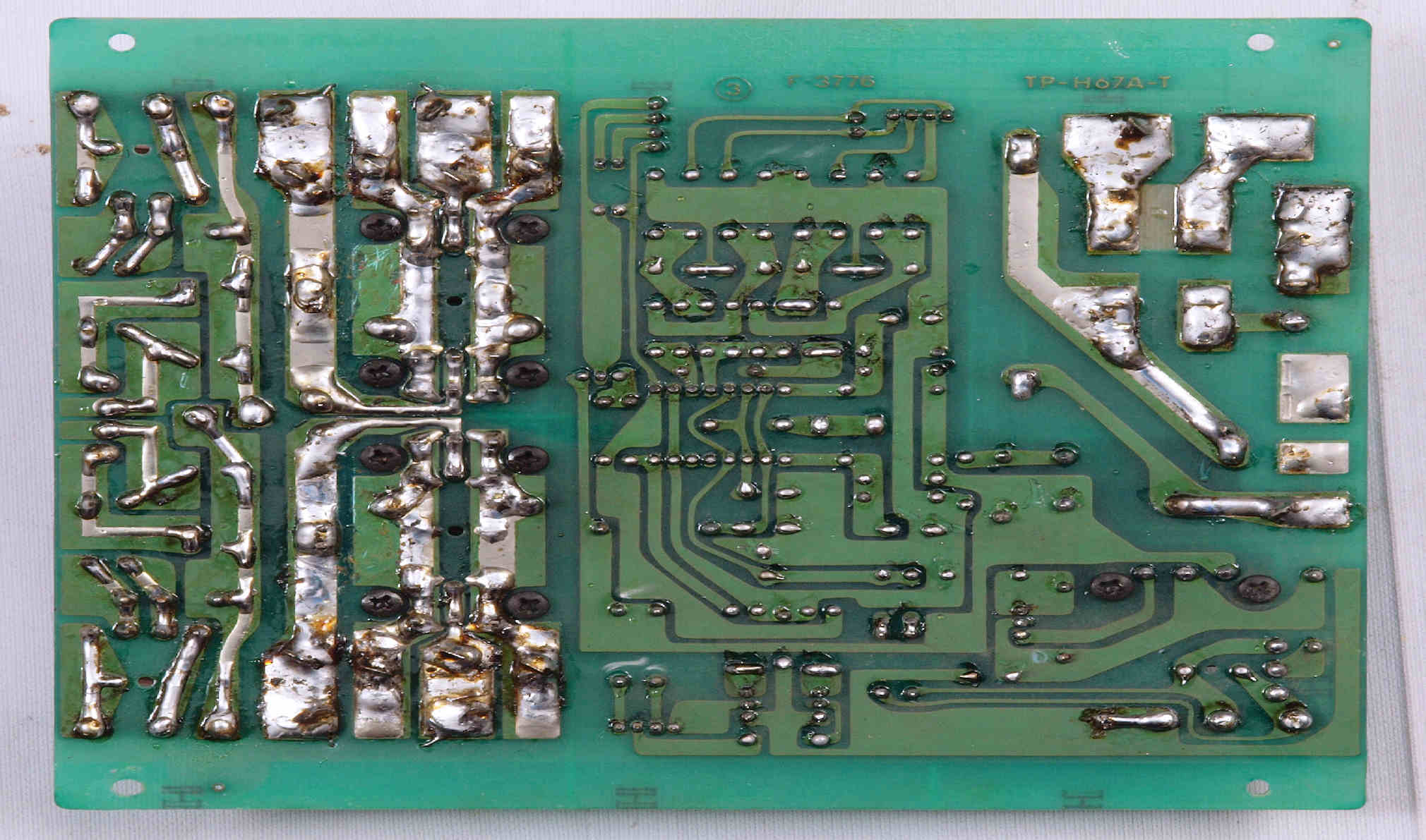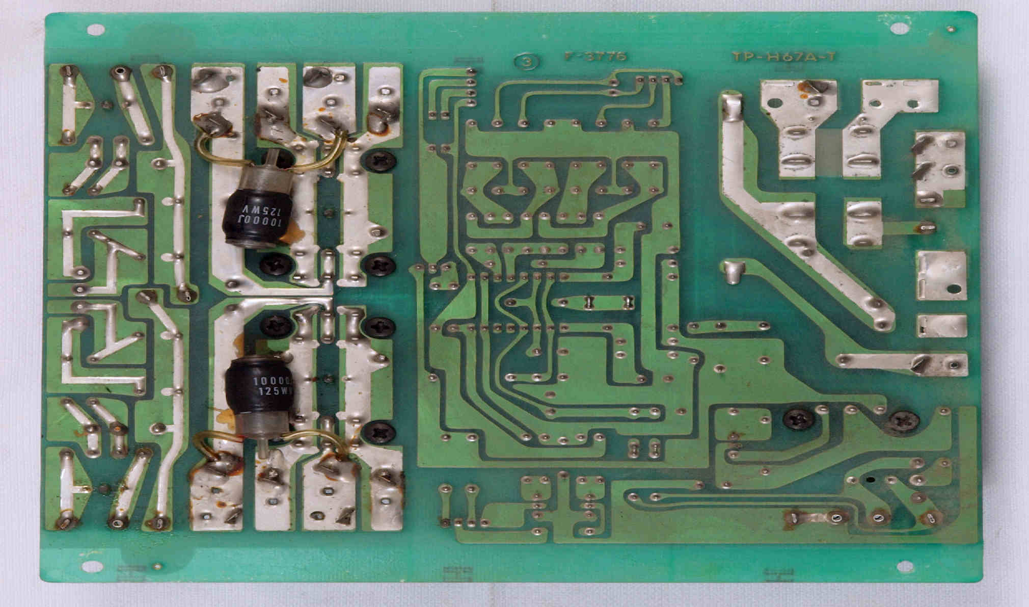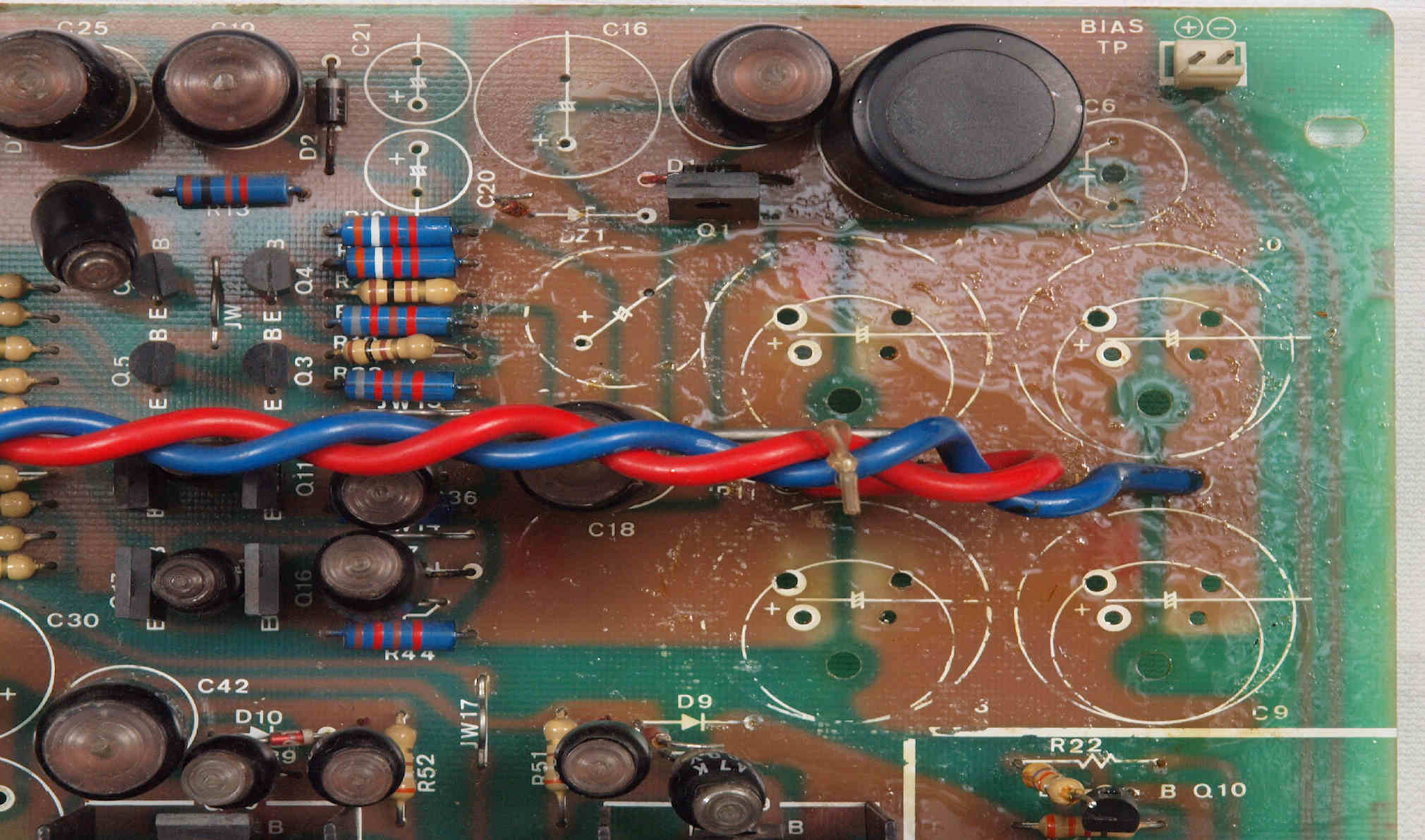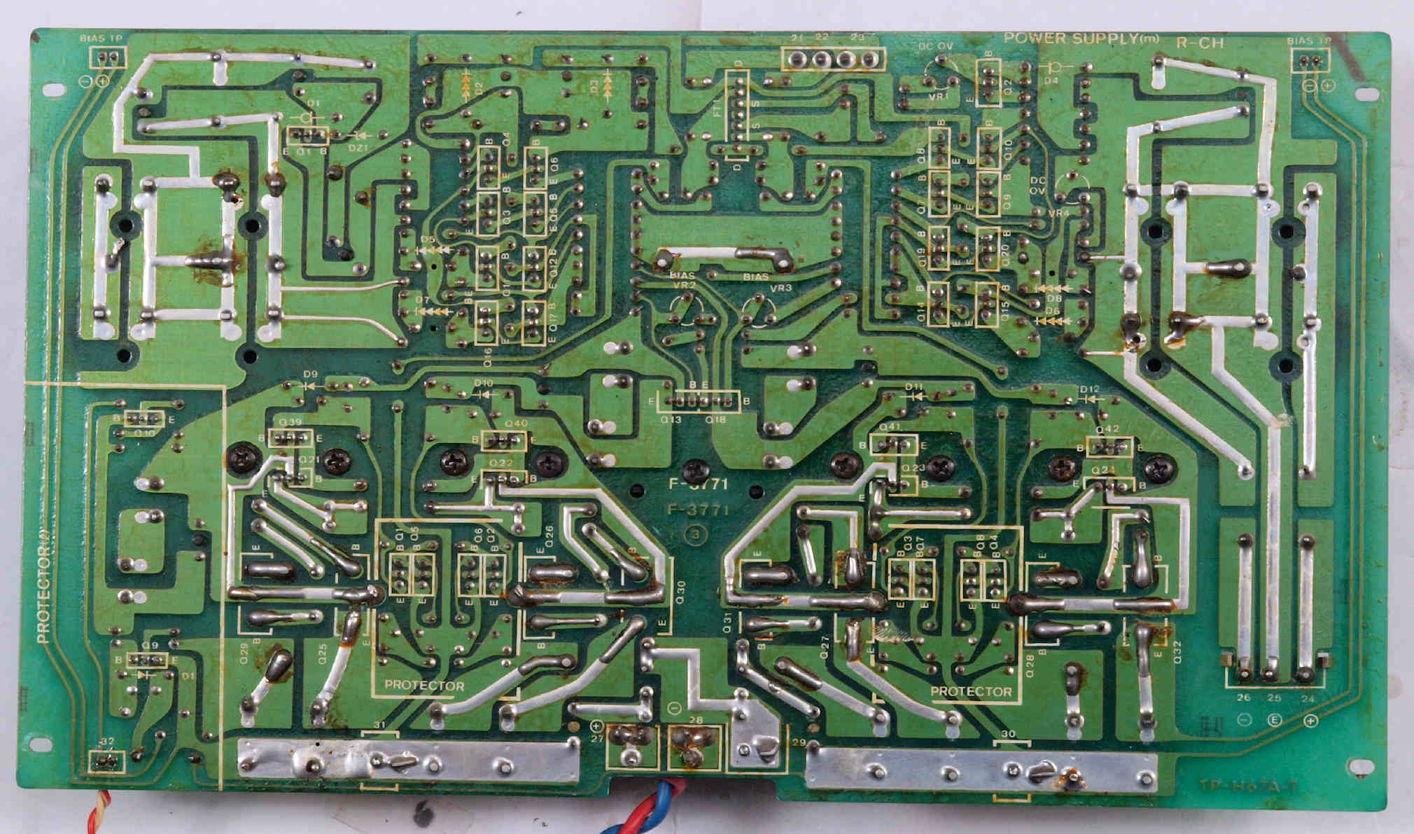 | C132. 修理中 R側AMP基板、電解コンデンサー固定用の接着材、当時は溶媒にトルエンが使用されており、銅を腐食する。 | ||||||||||||||||||||||||||||||