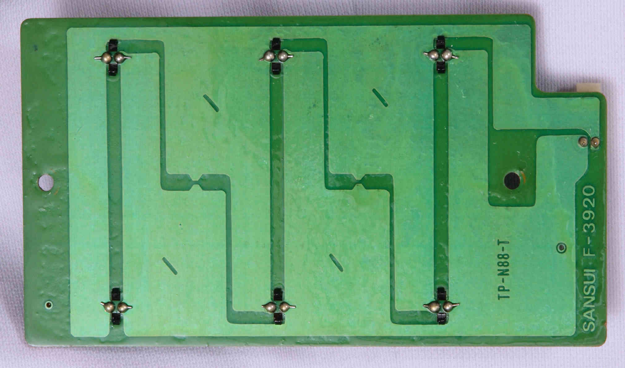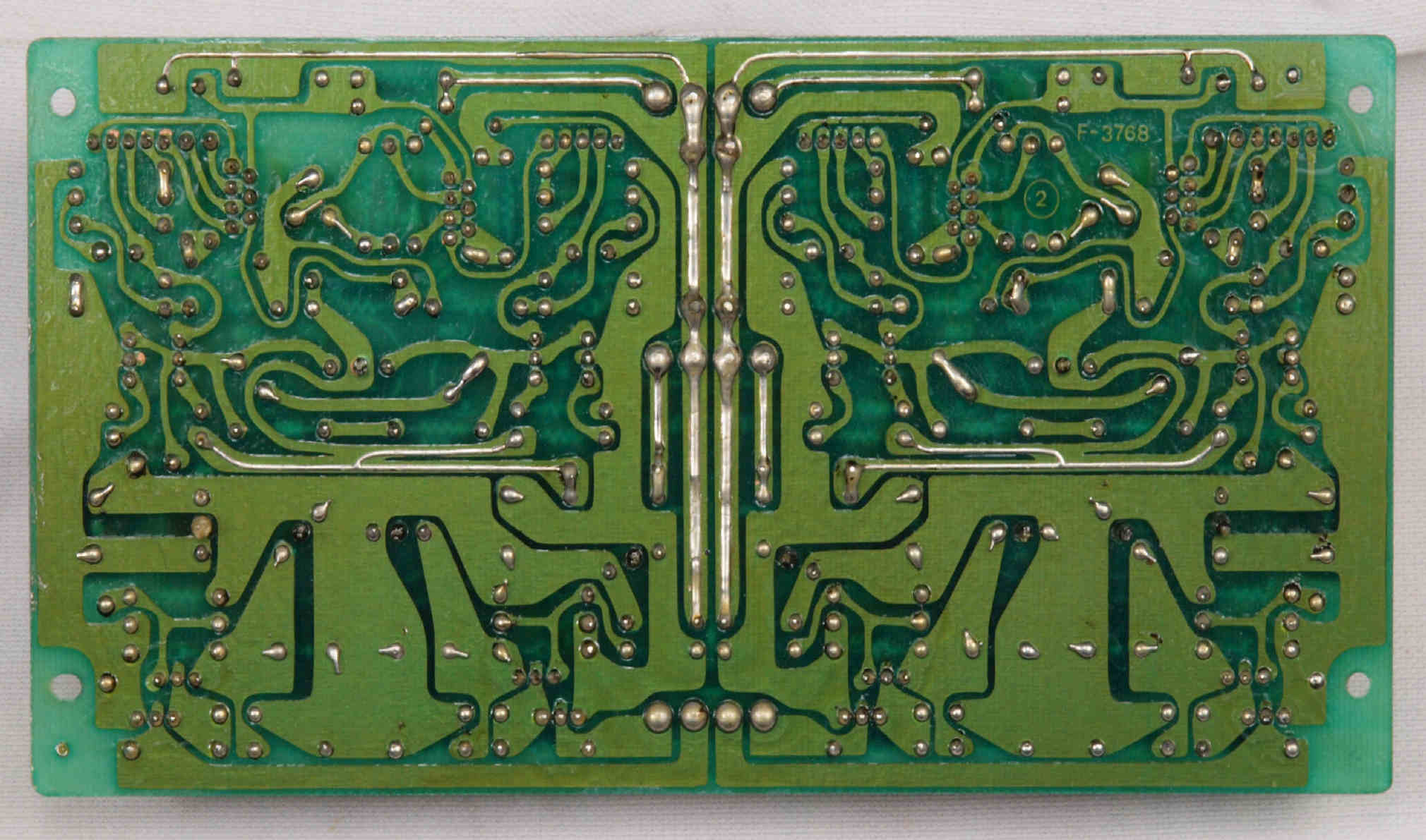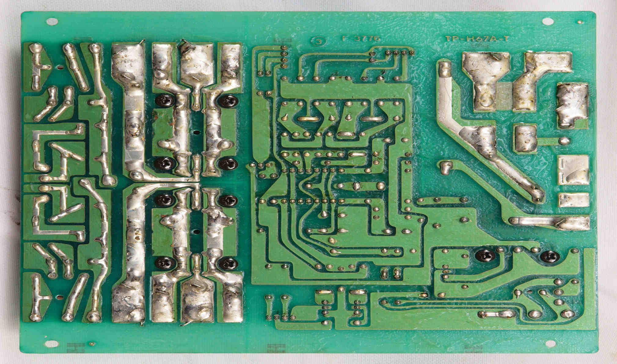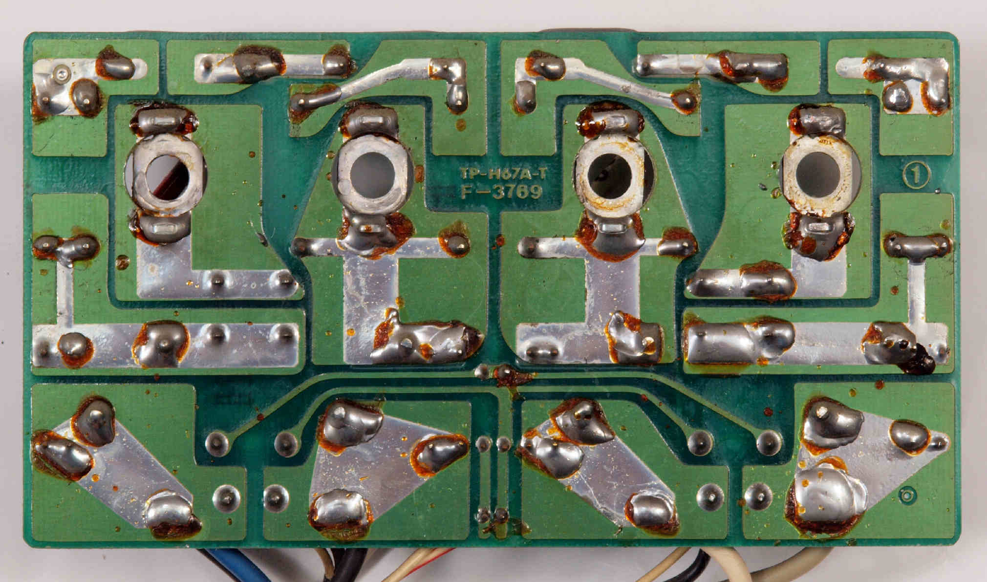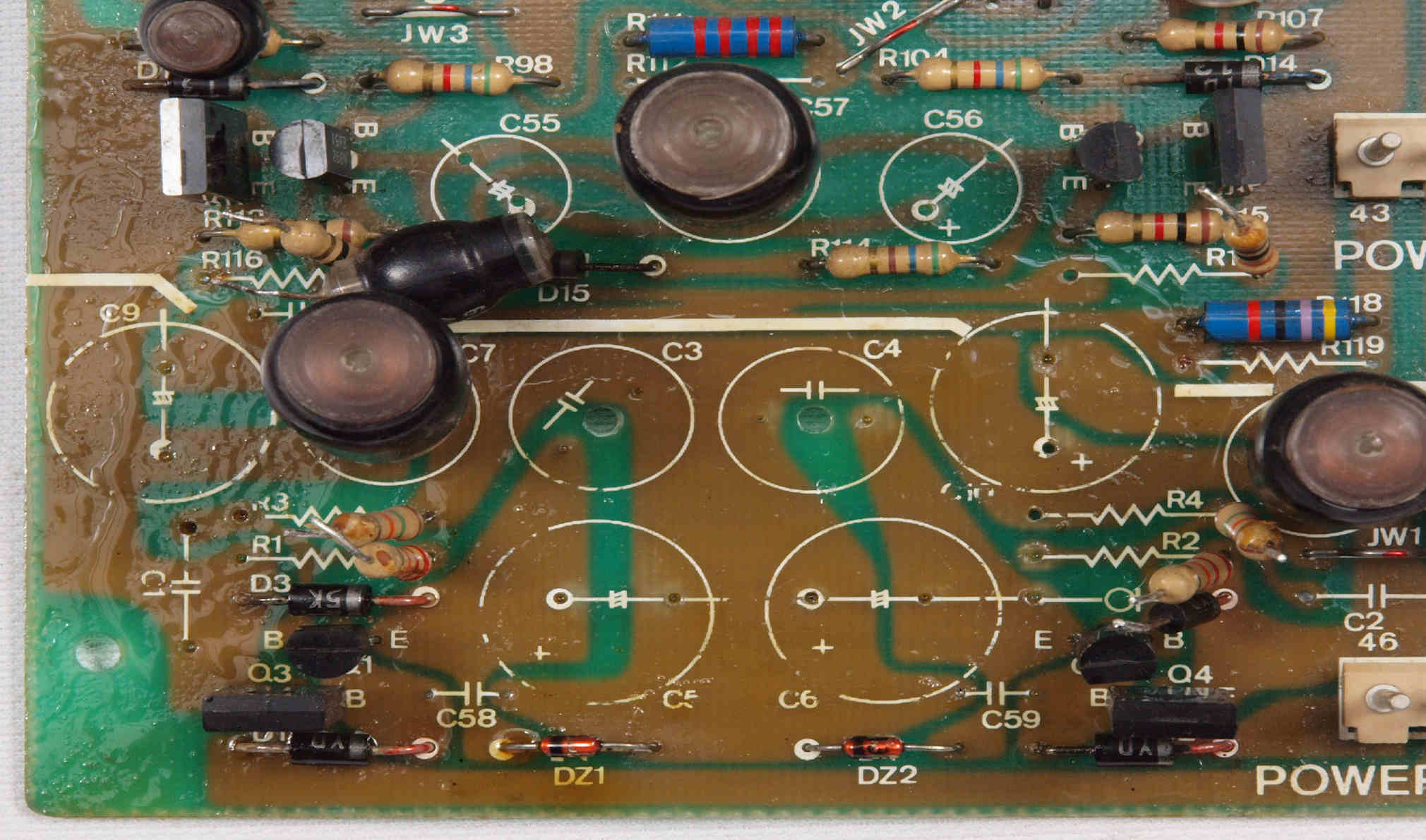 | C132. 修理中 R側AMP基板、電解コンデンサー固定用の接着材、当時は溶媒にトルエンが使用されており、銅を腐食する。 | ||||||||||||||||||||||||||||||