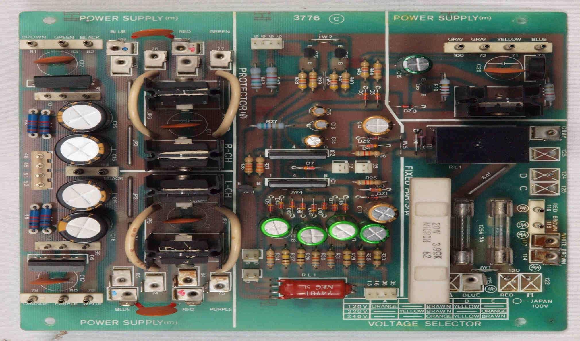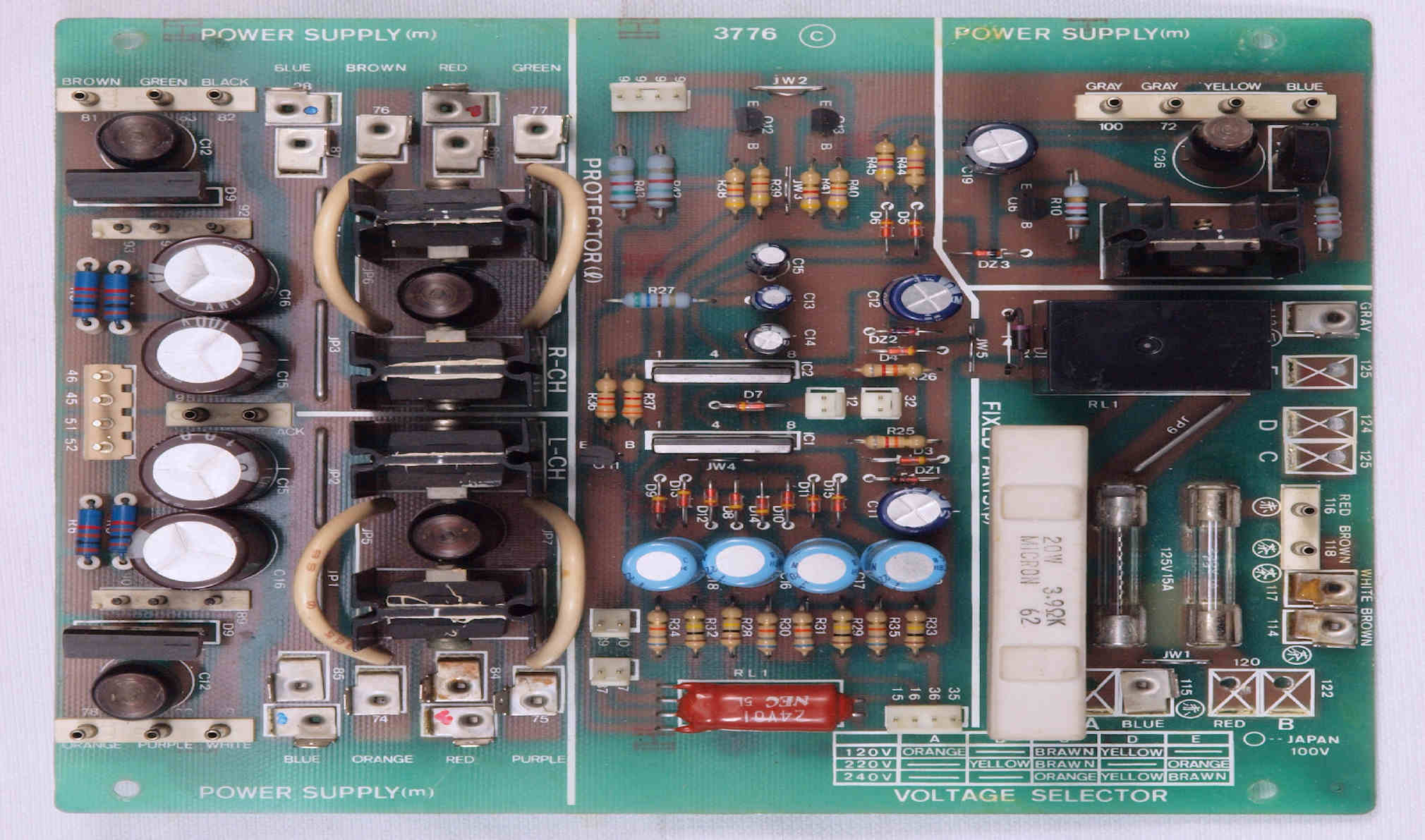 | C32. 修理後 電源・プロテクト基板 電解コンデンサー14個、フイルムコンデンサー7個、電源投入リレー1個交換 短絡事故を起こす、「ブチルゴム巻・銅箔スチロールコンデンサー」はセラミックコンデンサーに交換する。 詳しくは、こちら参照 |