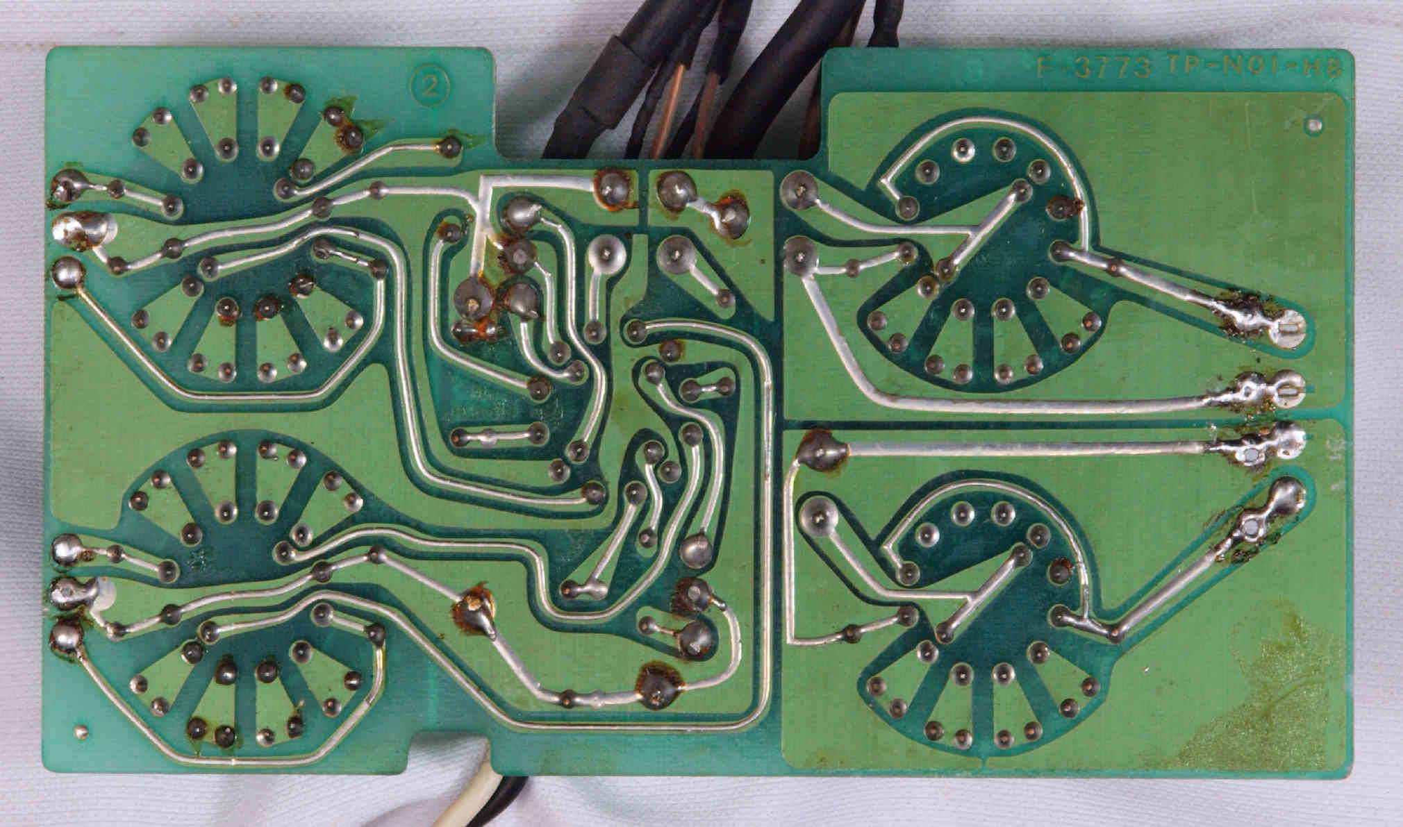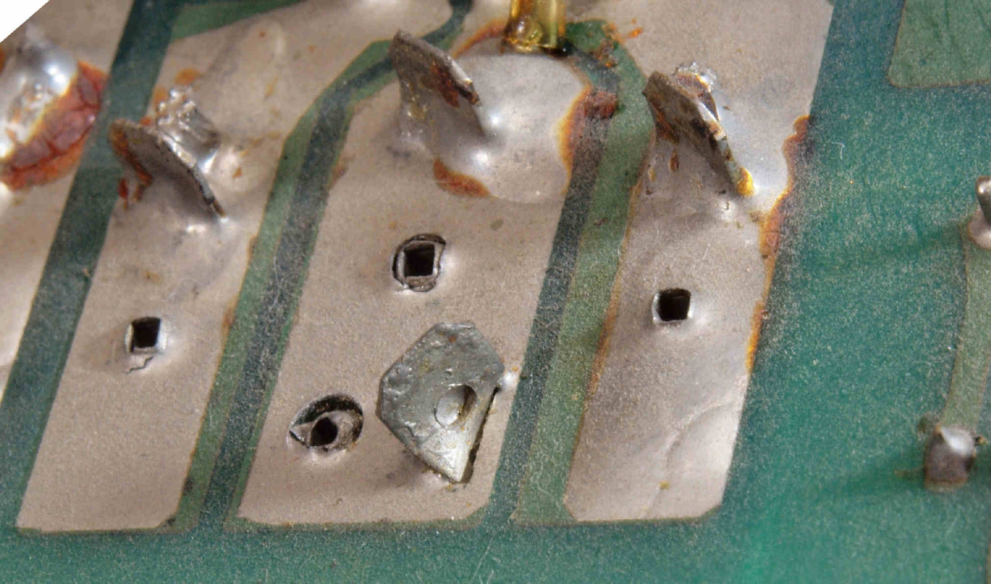 | C412. 修理中 入力AMP基板、電解コンデンサー固定用の接着材、当時は溶媒にトルエンが使用されており、銅を腐食する。 | ||||||||||||||||||||||||||||||