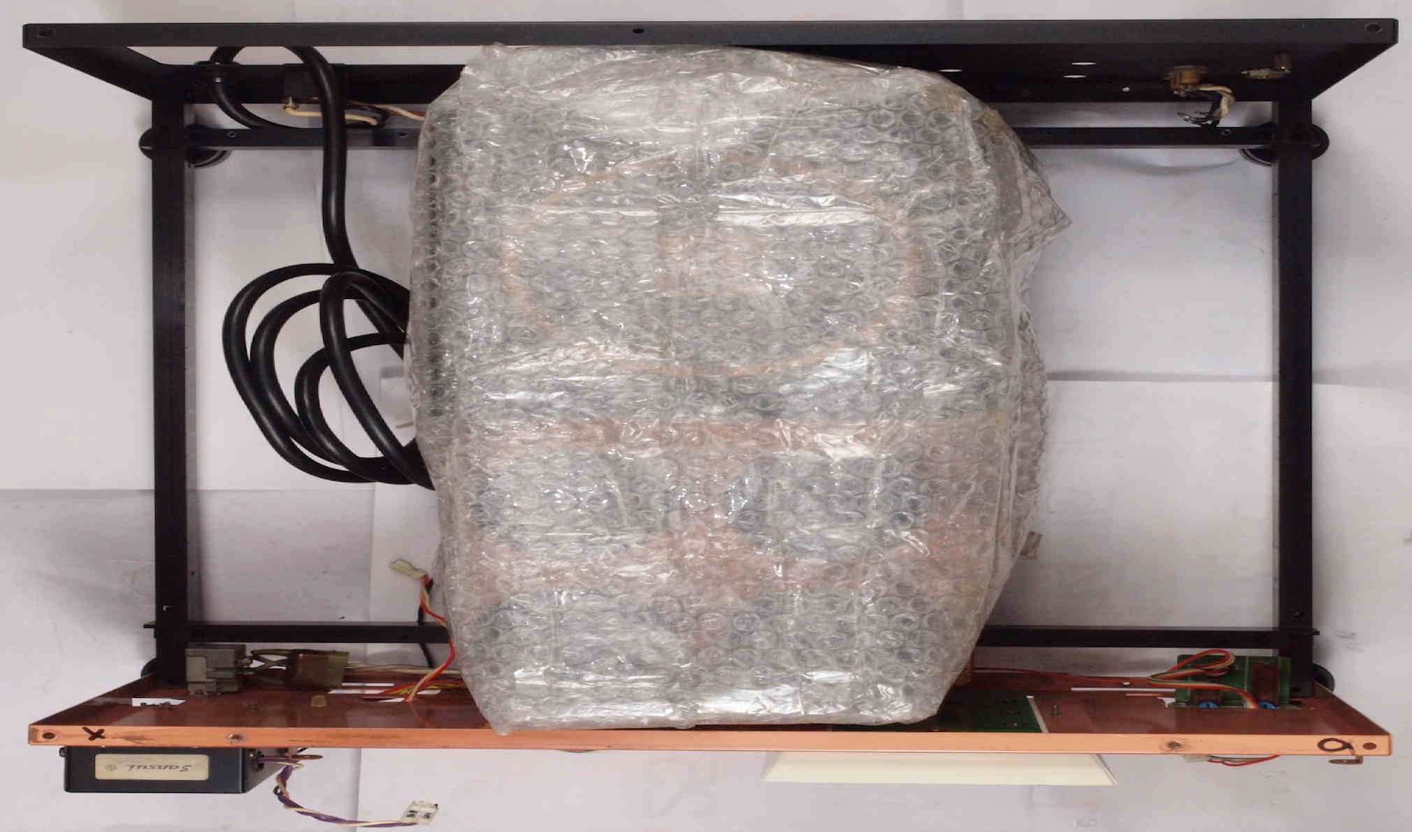 | C. 修理状況。 画像をクリックすると、大きく(横幅2050ドット)表示されます C10. 修理中 シャーシを反転するので、RL終段AMPブロックを取り外し、電源トランス・ブロック電解コンデンサーの保護の為、ウエスを巻き付けた所。 |