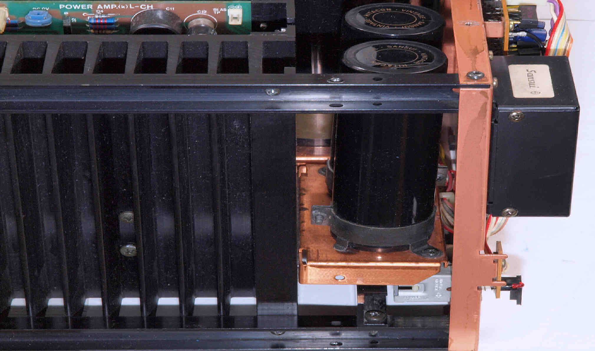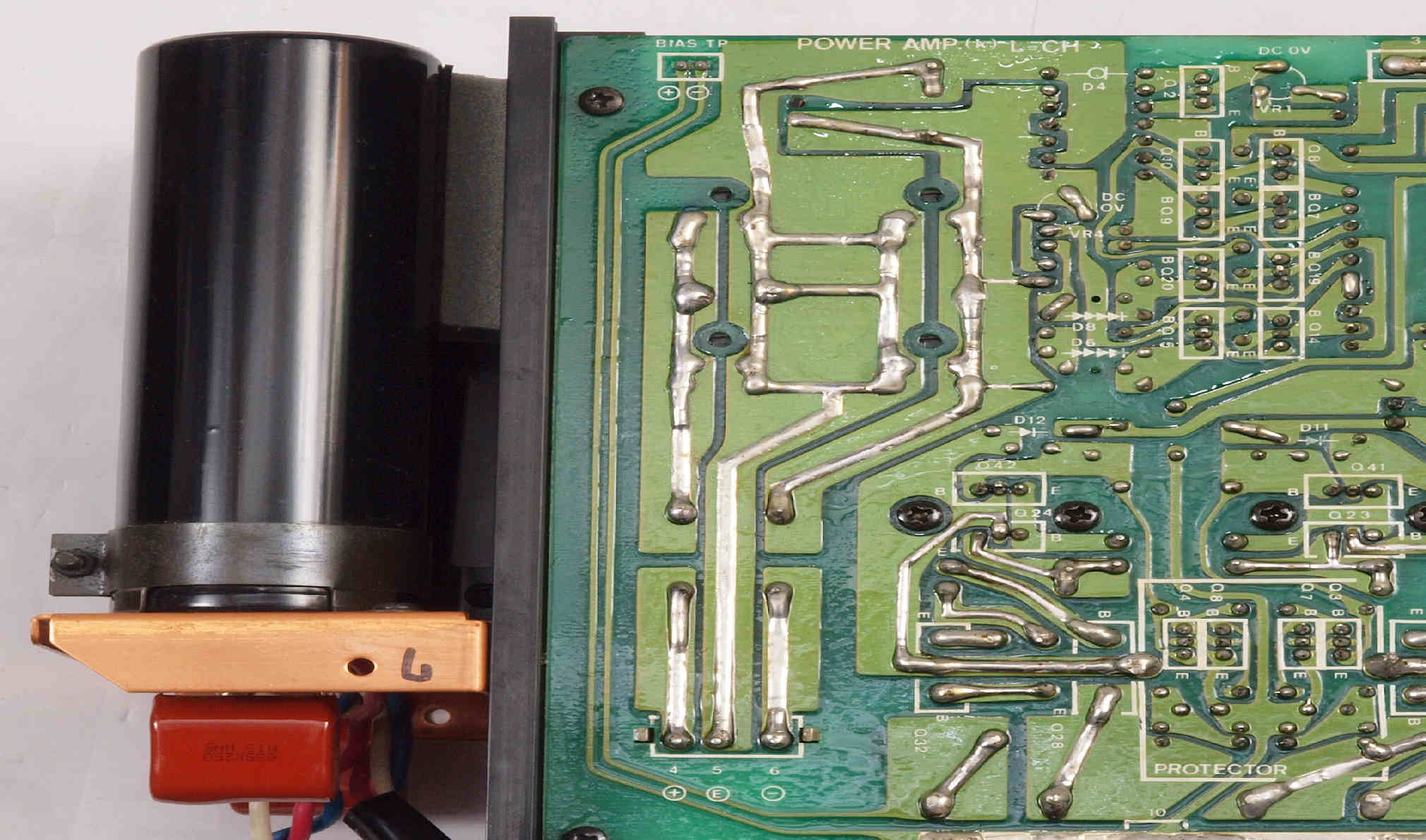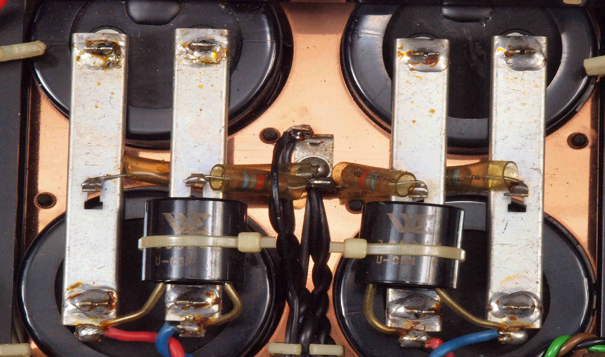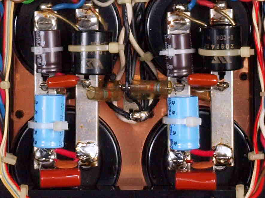 | C113. 修理中 R側AMPブロック、横取り付けの電解ブロックコンデンサー、底だけの固定なので曲がっている。 | ||||||||||||||||||||||||||||||