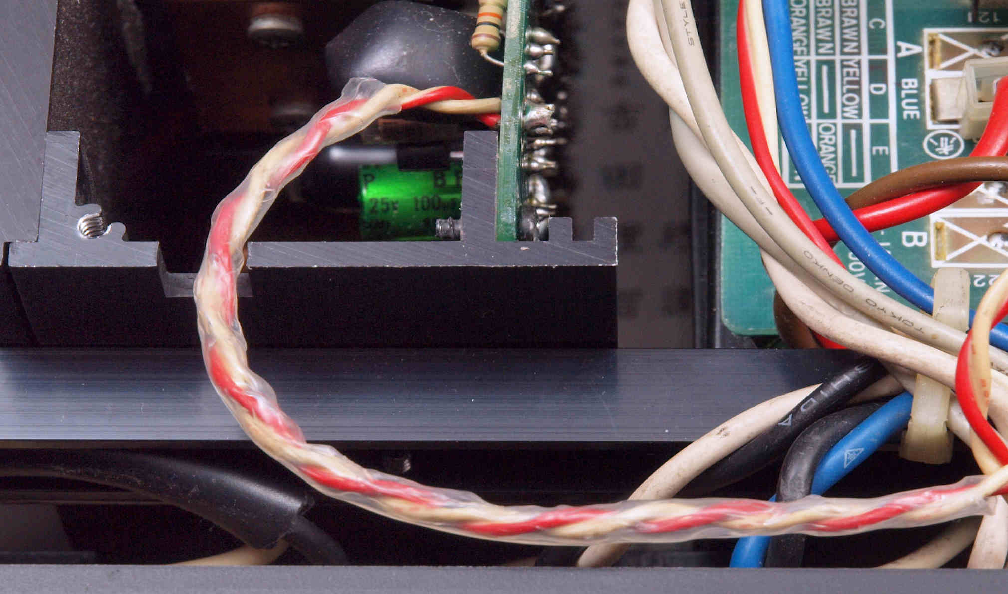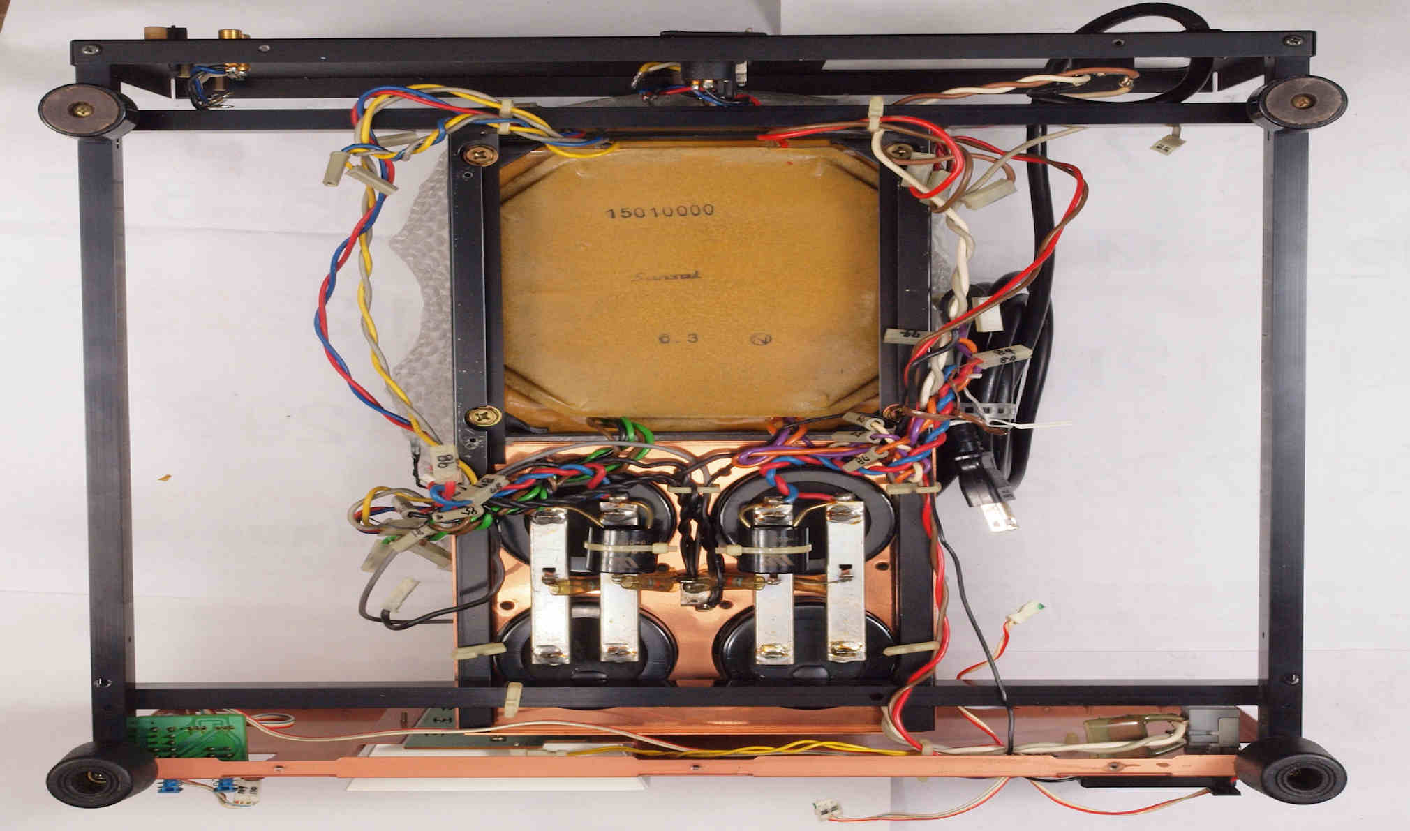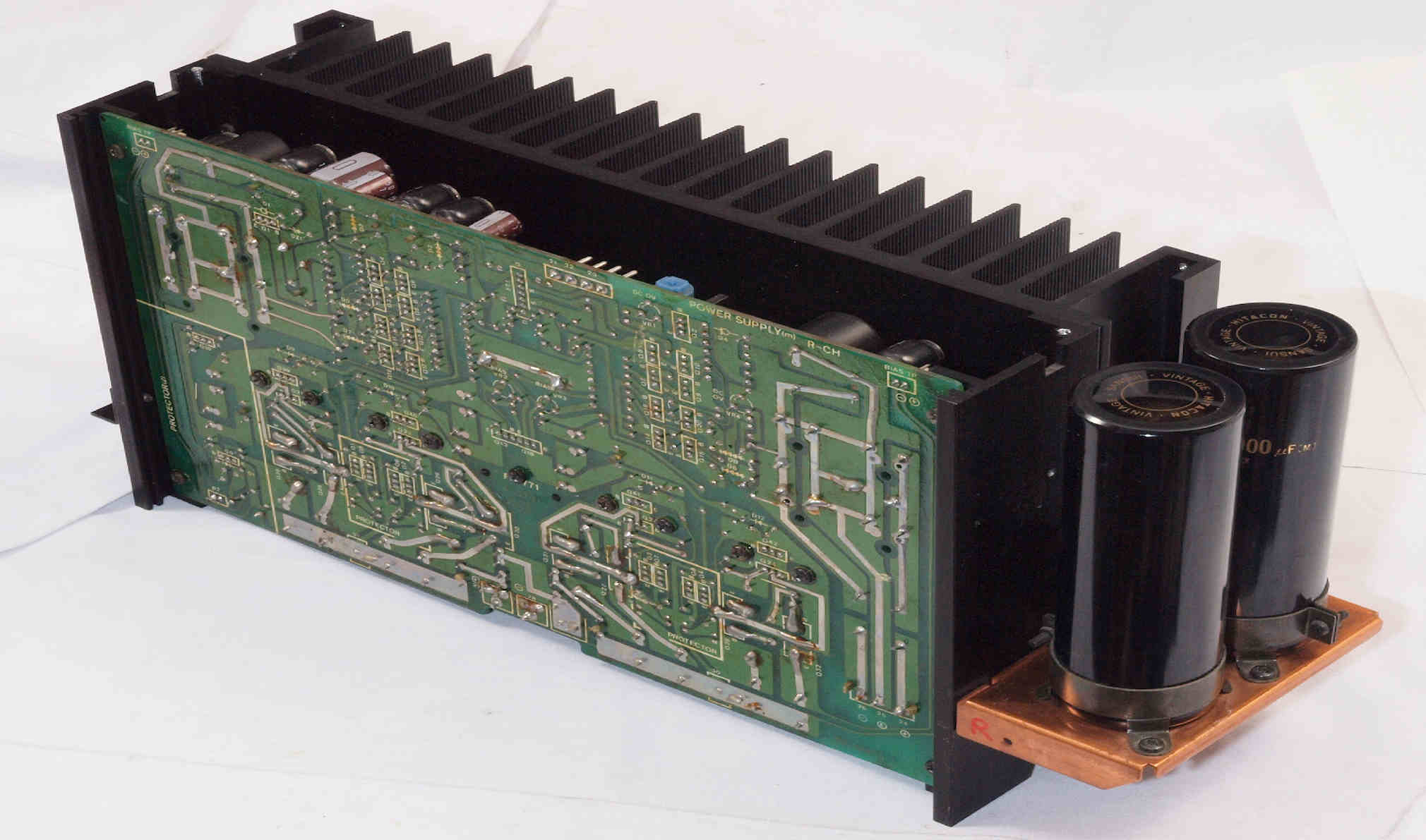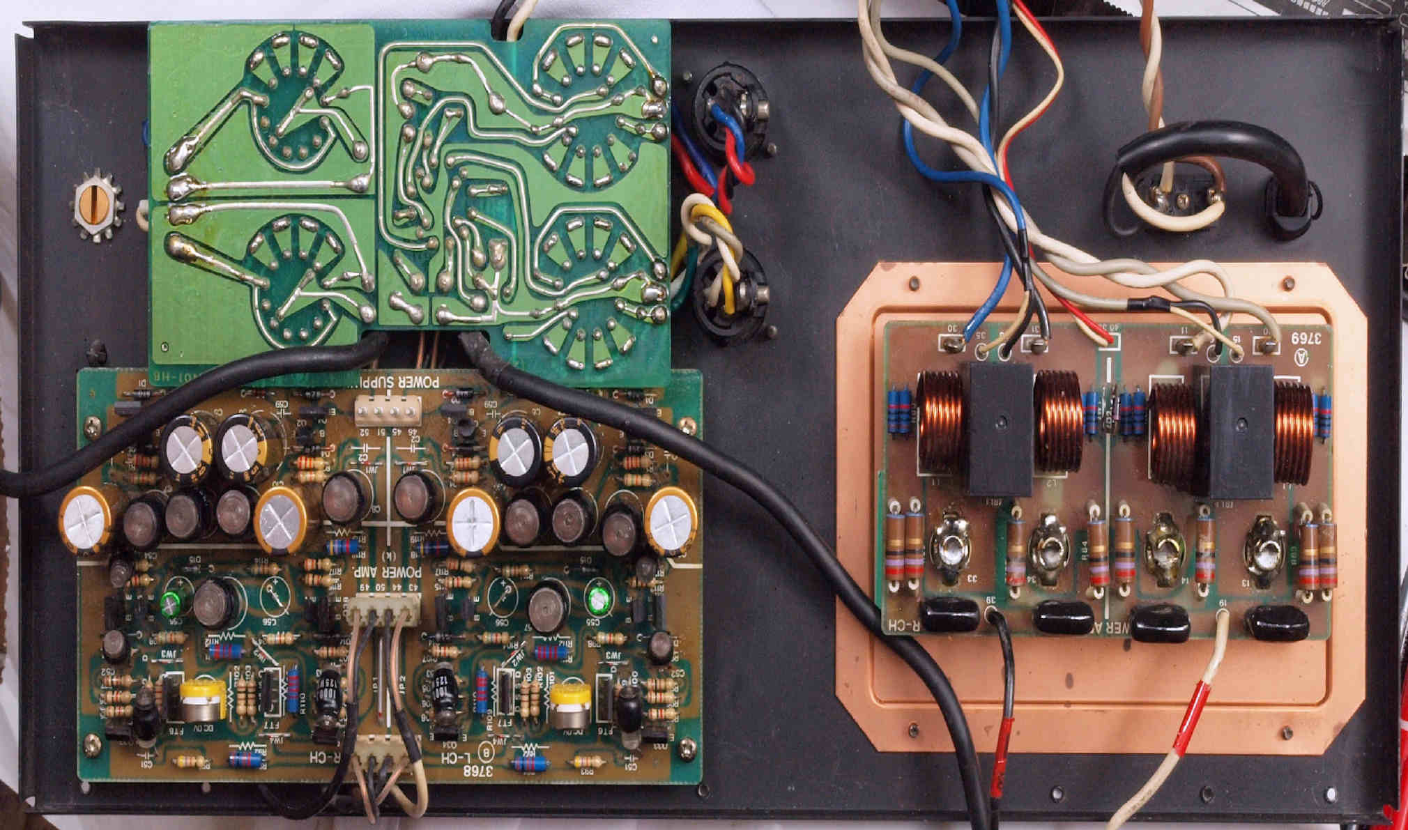| C113. 修理中 R側AMPブロック、横取り付けの電解ブロックコンデンサー、底だけの固定なので曲がっている。 | ||||||||||||||||||||||||||||||