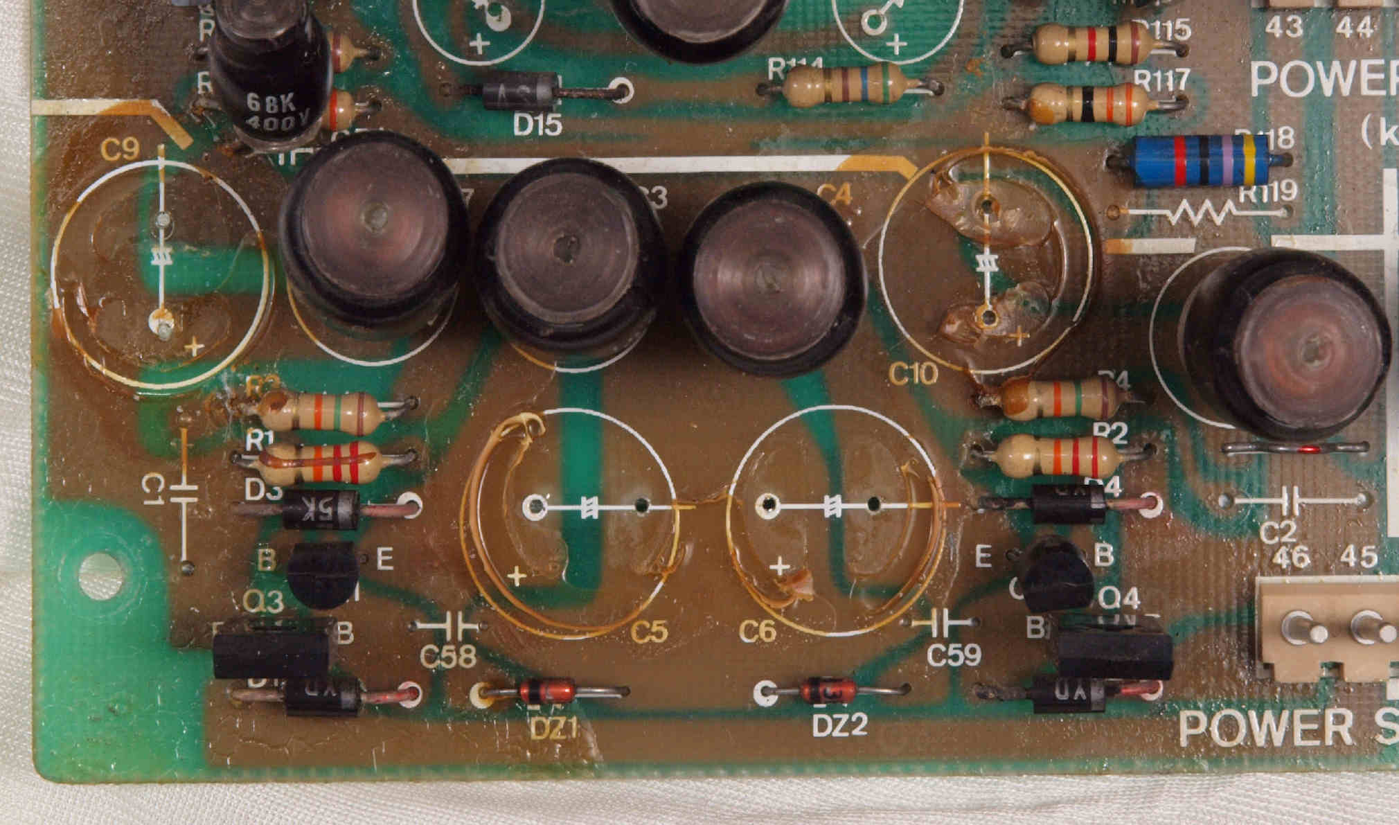 | C91. 修理前 電源ブロック電解コンデンサー周り | ||||||||||||||||||||||||||||||