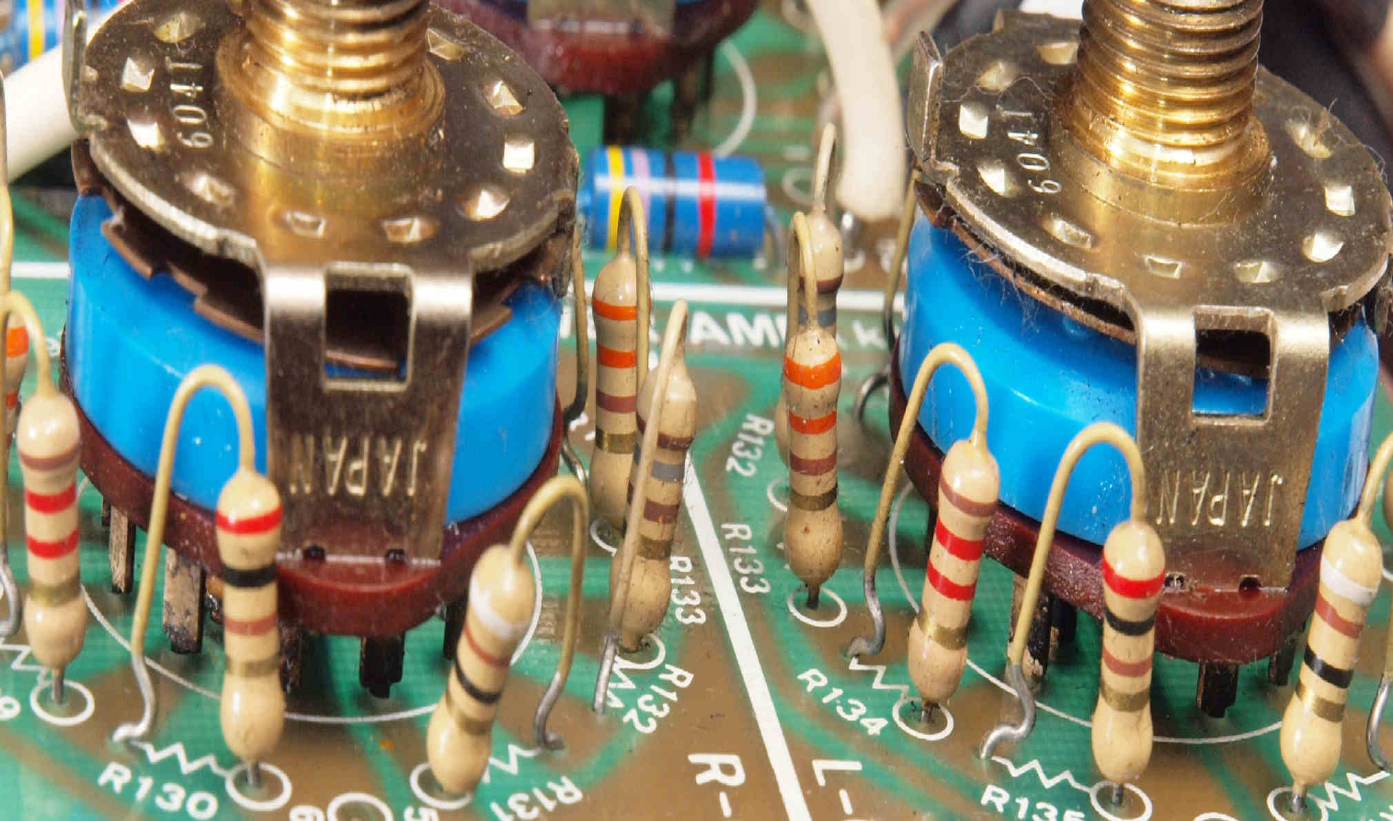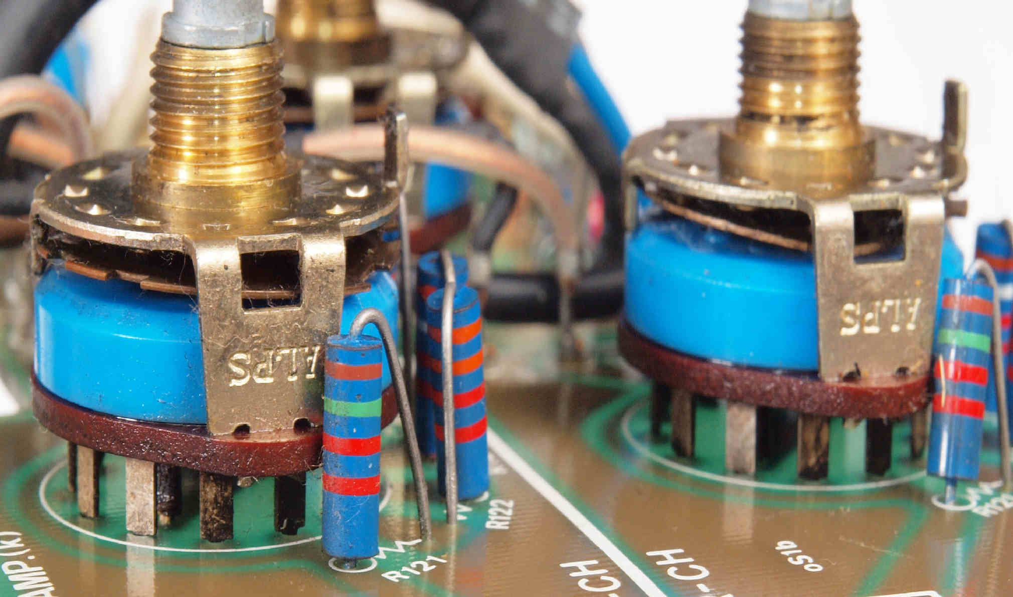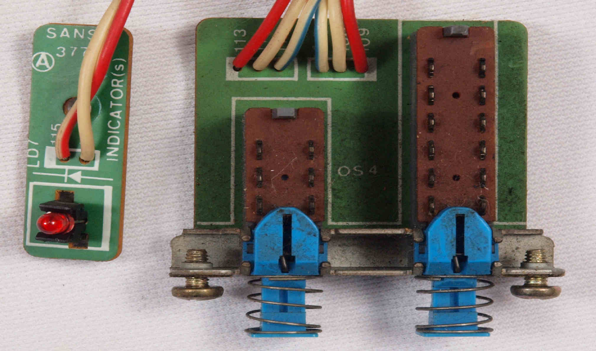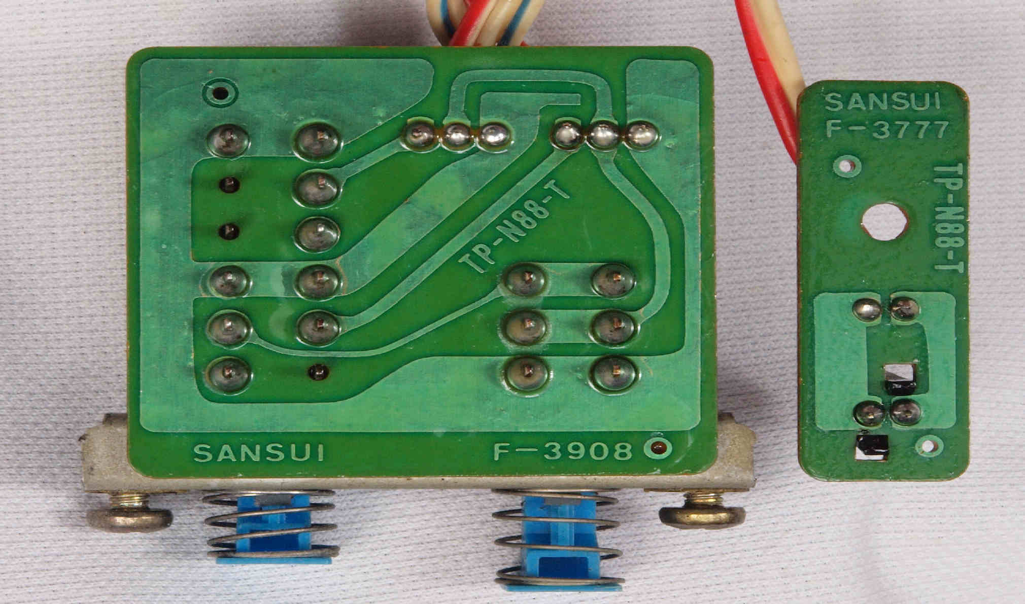 | C511. 修理中 入力VR基板、 SWには接点復活剤が軸までも多量に注入されている。 これだけ使用されると、軸の潤滑剤のグリスが溶け出し、接点に皮膜を作り、接点不良になる。 |