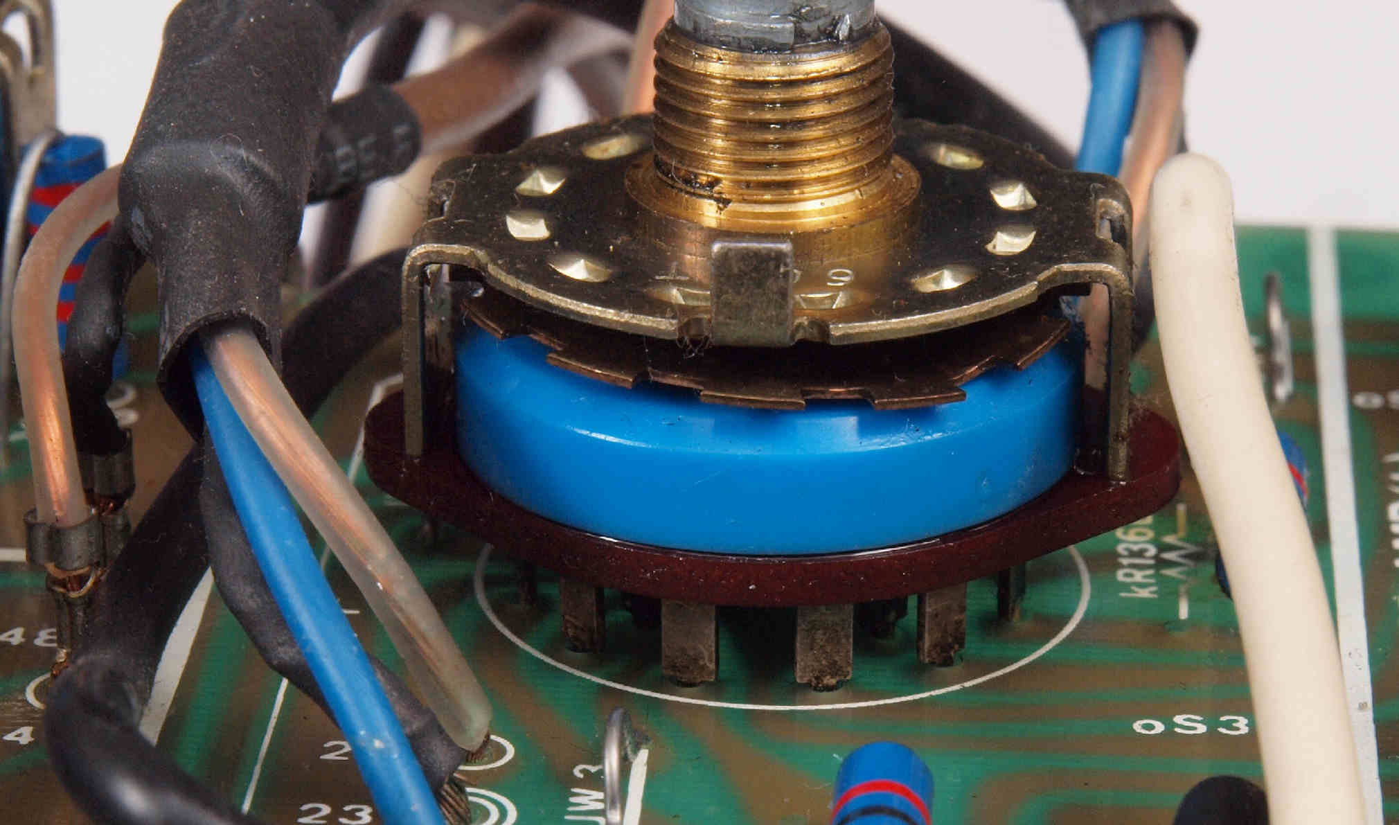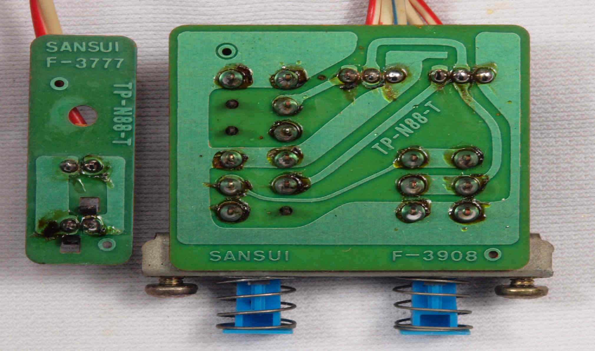 | C513. 修理中 入力VR基板、 SW3には接点復活剤が軸までも多量に注入されている。 これだけ使用されると、軸の潤滑剤のグリスが溶け出し、接点に皮膜を作り、接点不良になる。 |