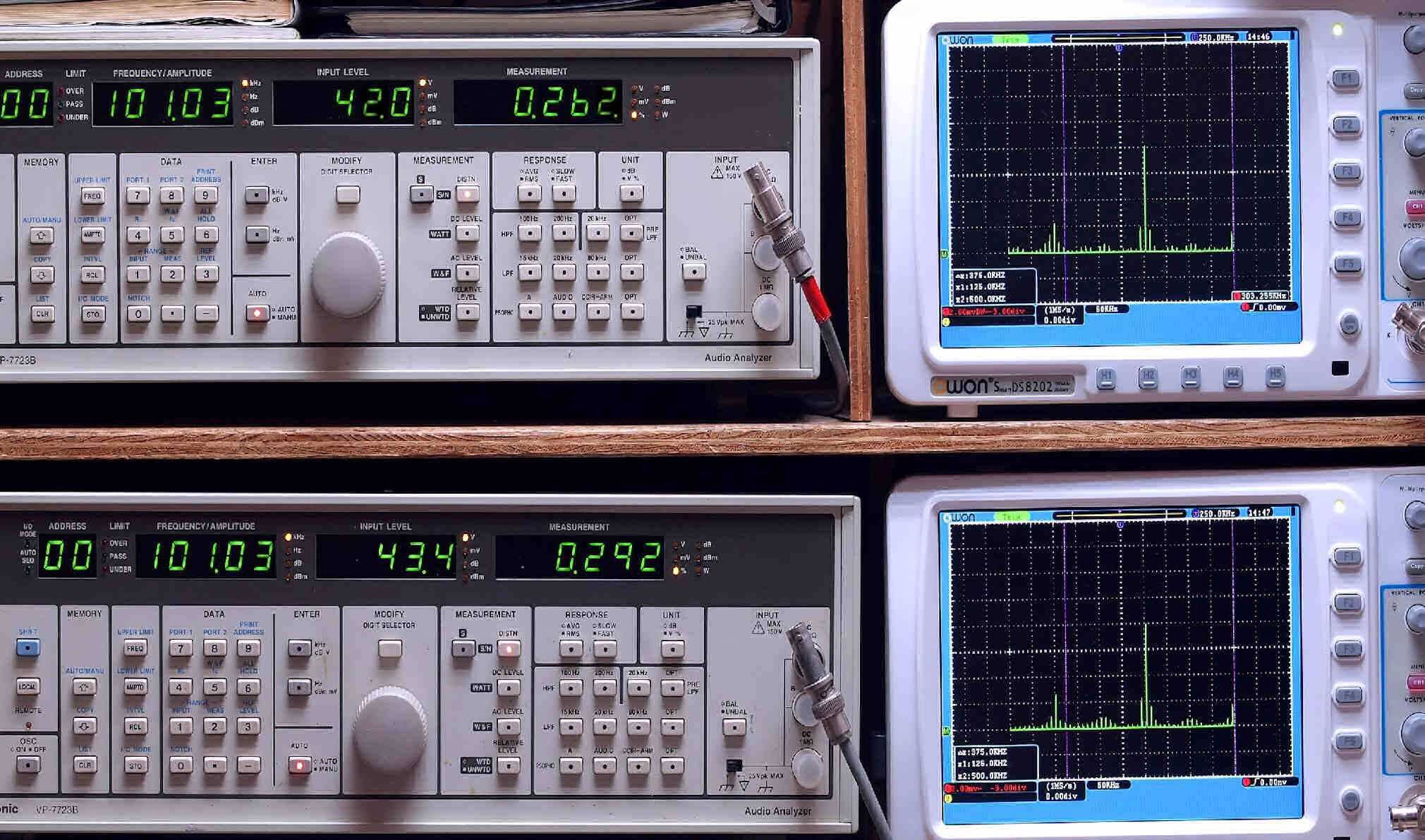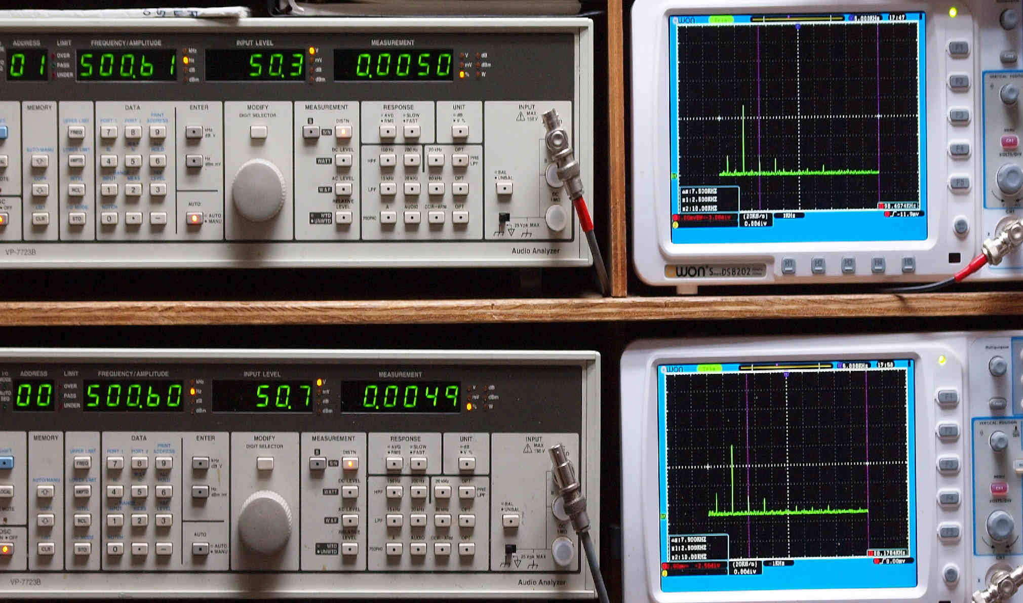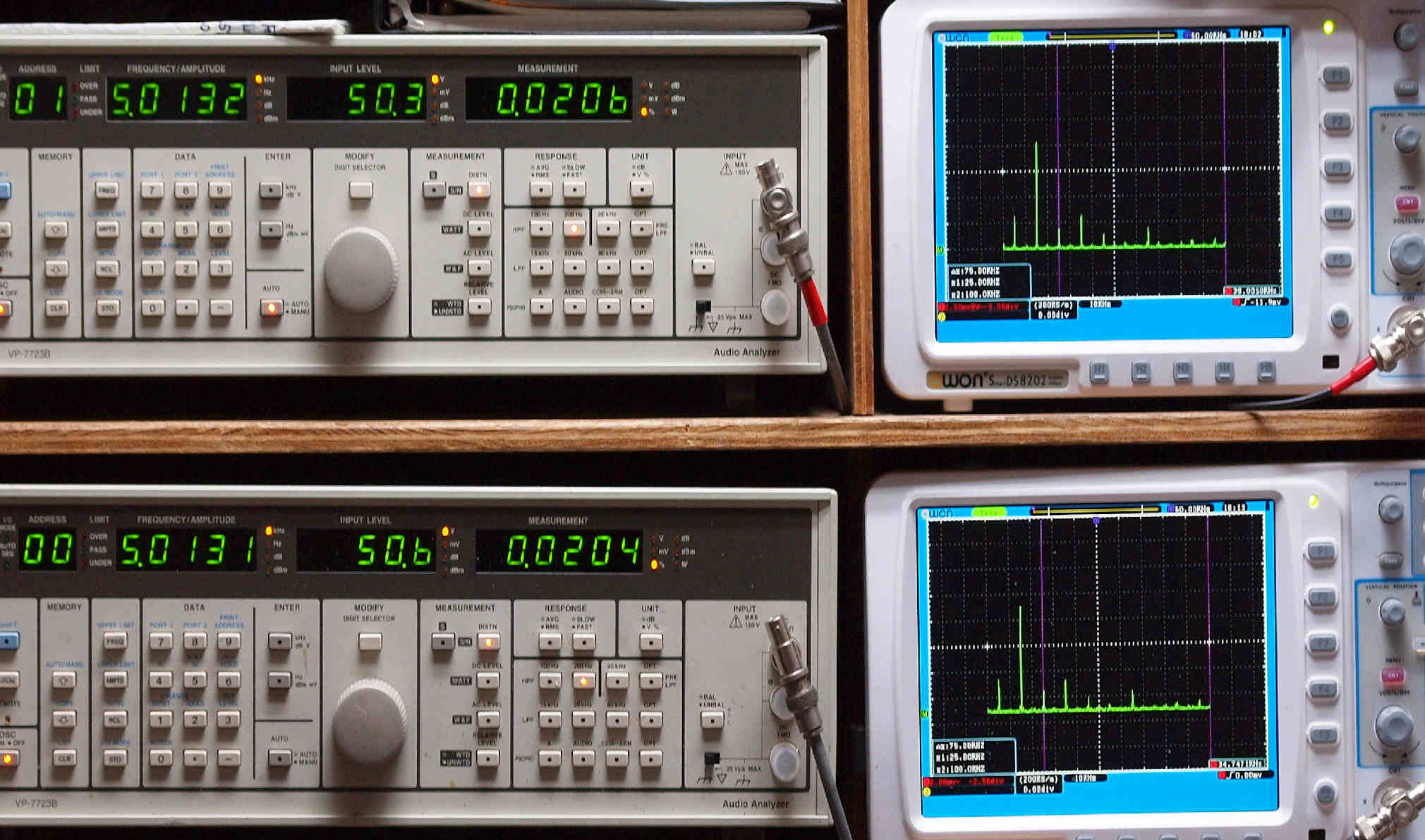 | E. 測定・調整。 画像をクリックすると、大きく(横幅2050ドット)表示されます E1. 出力・歪み率測定・調整 「見方」。 上段中 右側SP出力を「Audio Analyzer Panasonic VP−7723B」により測定。 表示LED、 左端=メモリーNo、 中左=周波数測定、 中右=出力電圧測定、 右端=歪み率測定。 上段右端 VP−7723Bの基本波除去出力を「owon SDS8202(200MHZ)」で「FFT分析」表示。 下段中 左側SP出力を「Audio Analyzer Panasonic VP−7723B」により測定。 表示LED、 左端=メモリーNo、 中左=周波数測定、 中右=出力電圧測定、 右端=歪み率測定。 下段右端 VP−7723Bの基本波除去出力を「owon SDS6062(200MHZ)」で「FFT分析」表示。 下段左端 オーディオ発振器 VP−7201A より50Hz〜100kHzの信号を出し(歪み率=約0.003%)、ATT+分配器を通し、AMPに入力。 よって、ダイアル設定出力レベルより低くなります。測定機器の仕様や整備の様子はこちら、「VP−7723B」「VP−7201A」。 FFT画面の見方はこちら。 |