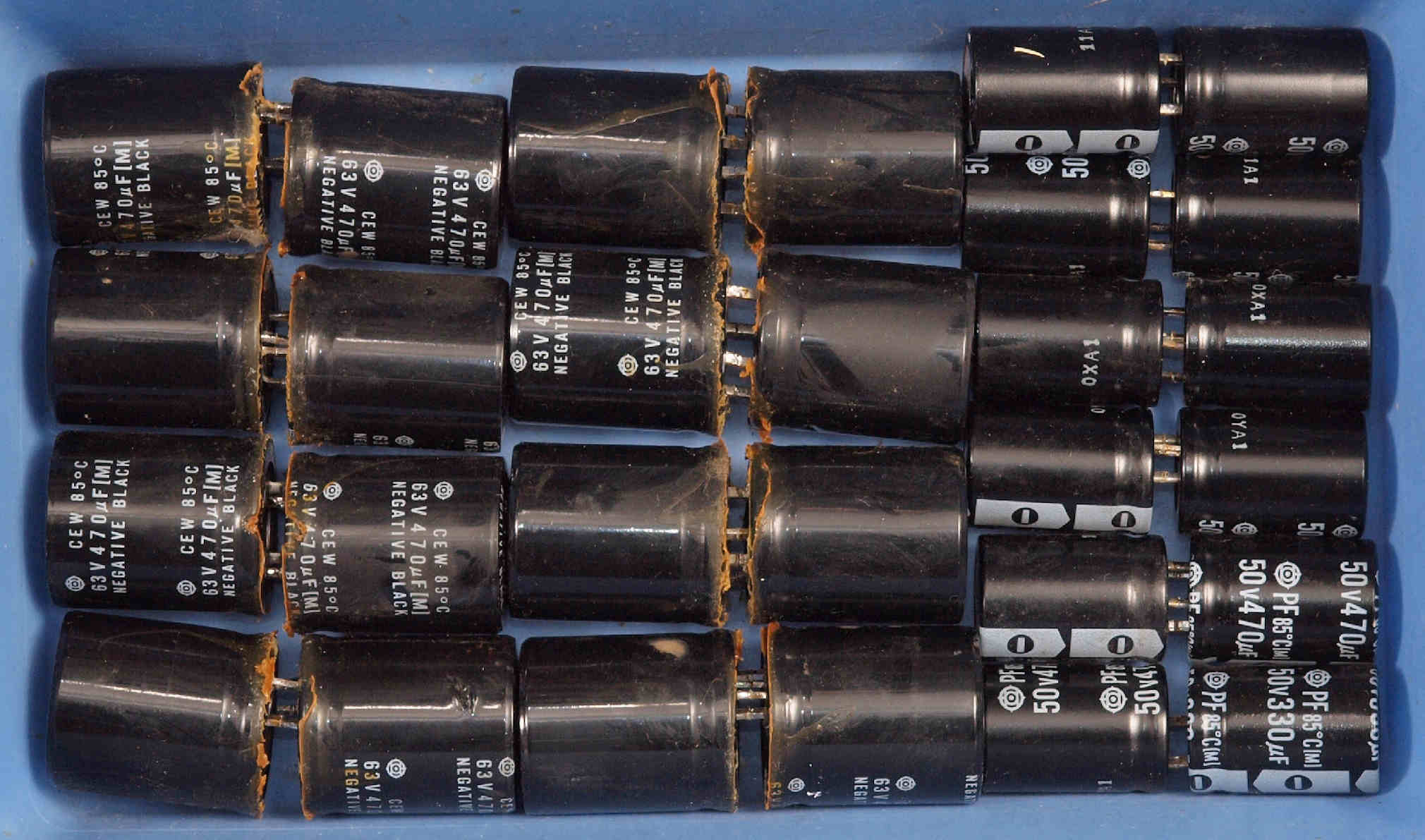 | A34. 点検中 幾たびかの輸送の衝撃で、曲がった「右側ドライブ供給電源の電解コンデンサー」 | ||||||||||||||||||||||||||||||