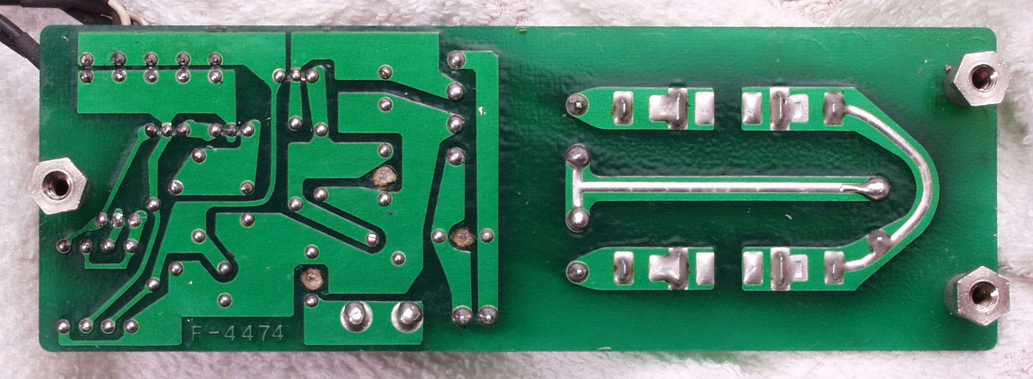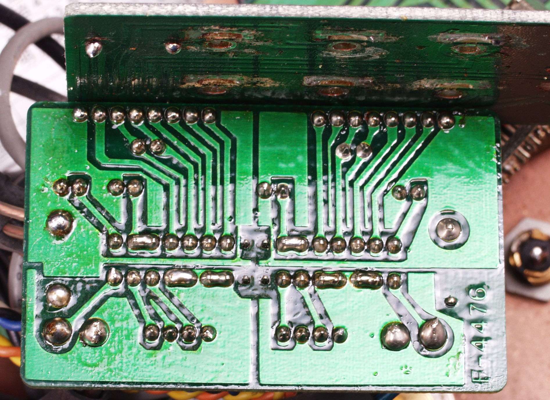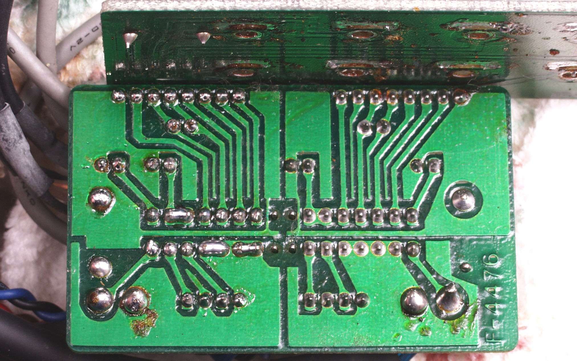 | CA5. 修理(半田補正)中 入力端子裏の基板、比較の為、右下のみ未補正 | |||||||||||||||||||
