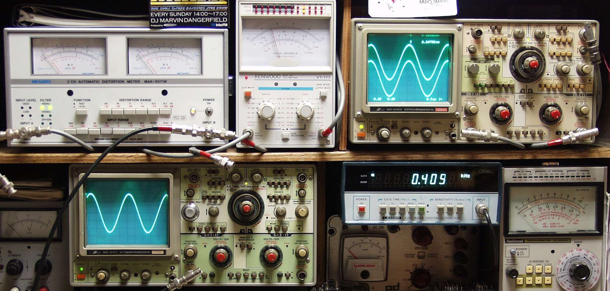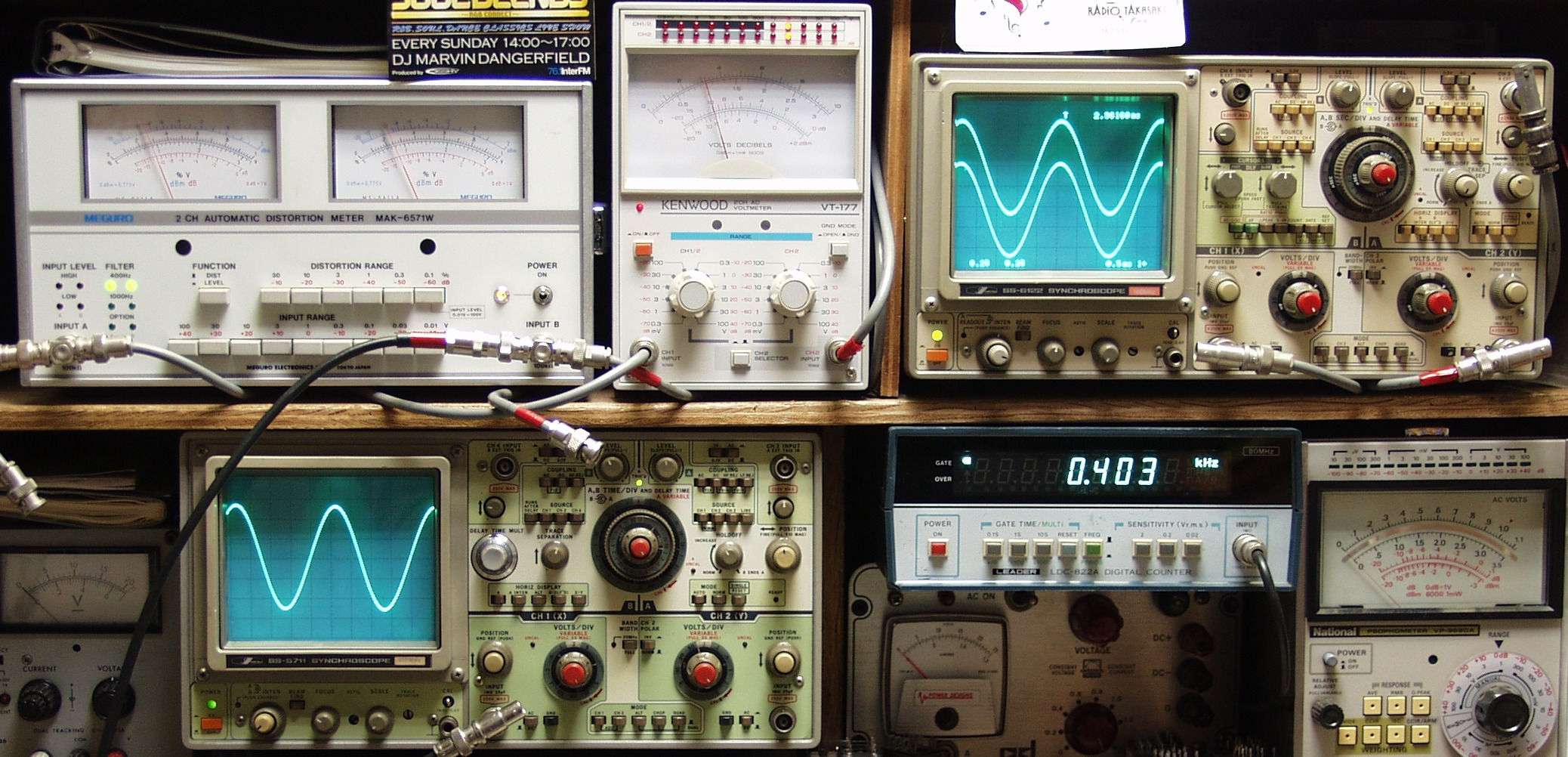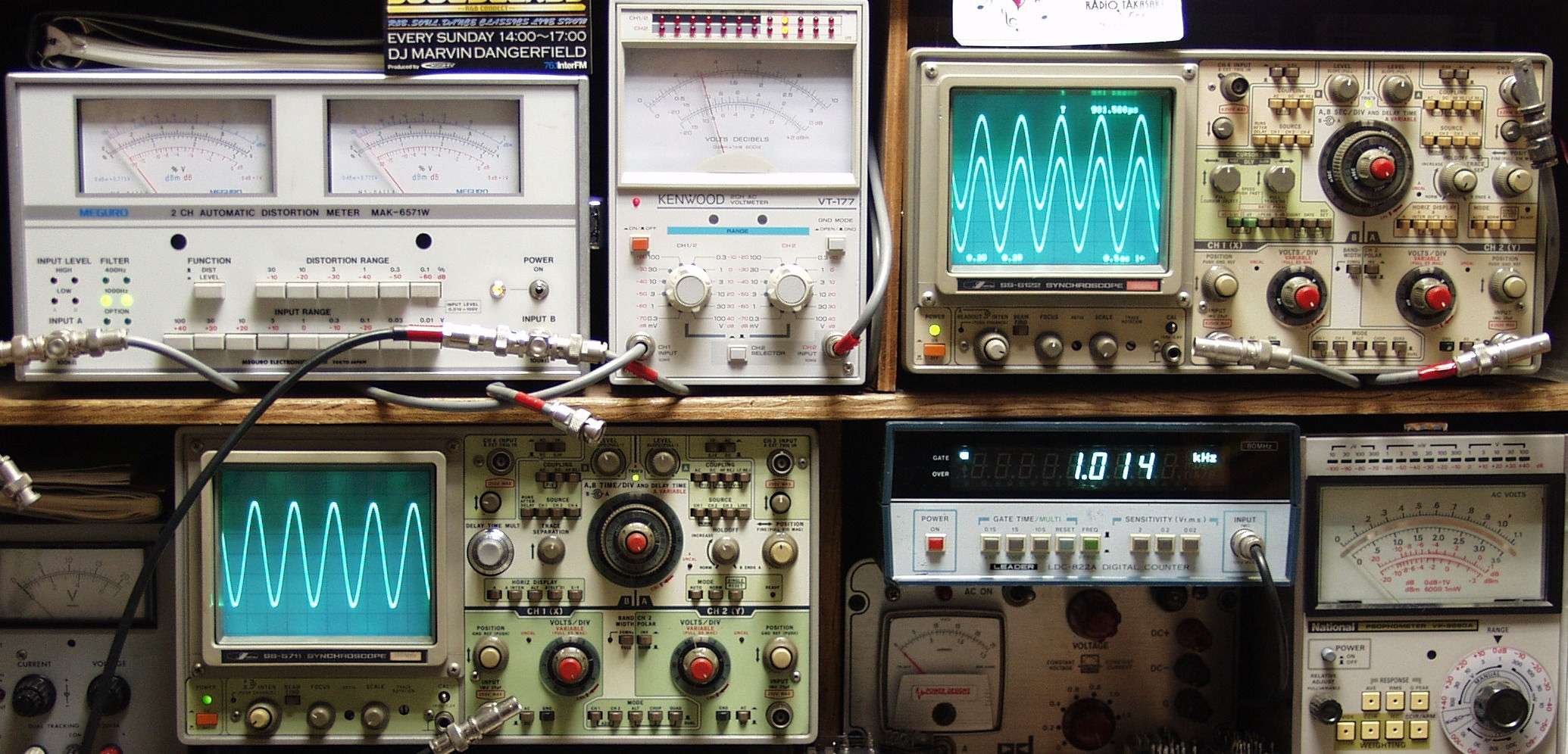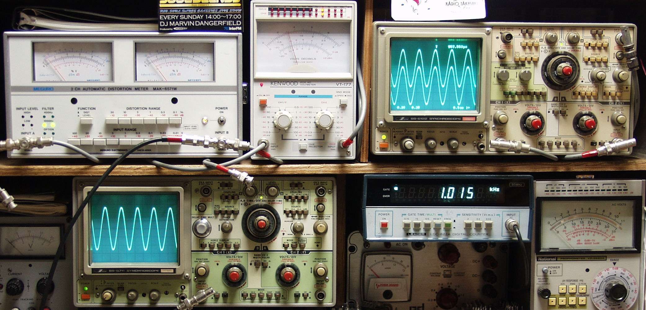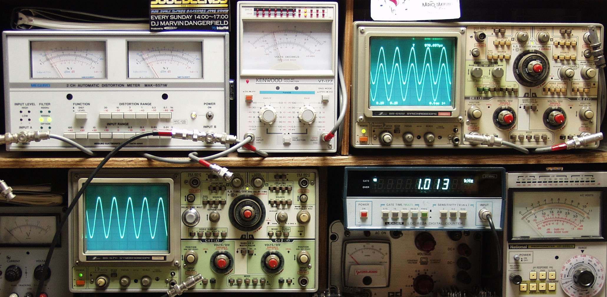| E. 調整・測定 E1. 出力/歪み率測定・調整 <見方> 下左オーディオ発振器より400HZ・1KHZの信号を出す(歪み率=約0.003%) 下中=入力波形(オーデオ発振器のTTLレベル) 下右=周波数計 上左=SP出力の歪み率測定 左メータ=L出力、右メータ=R出力 上中=SP出力電圧測定器、赤針=R出力、黒針=L出力 上右=SP出力波形オシロ 上=R出力、下=L出力(出力電圧測定器の出力) |