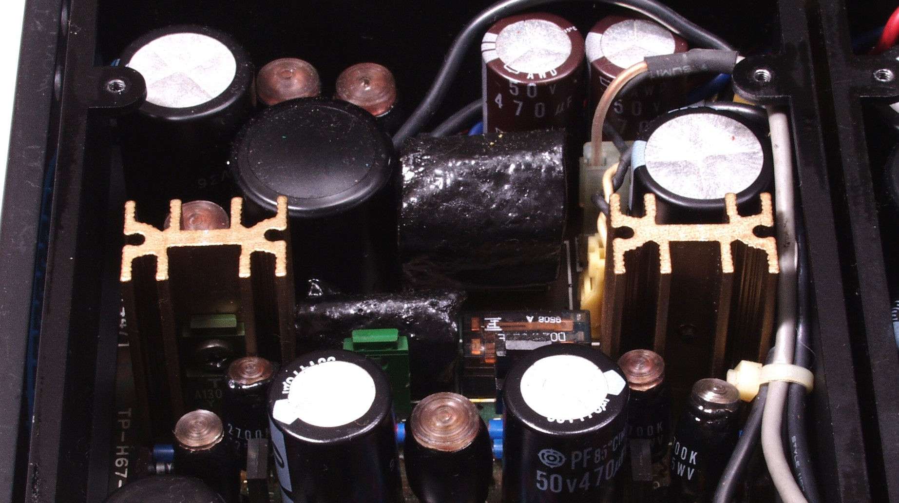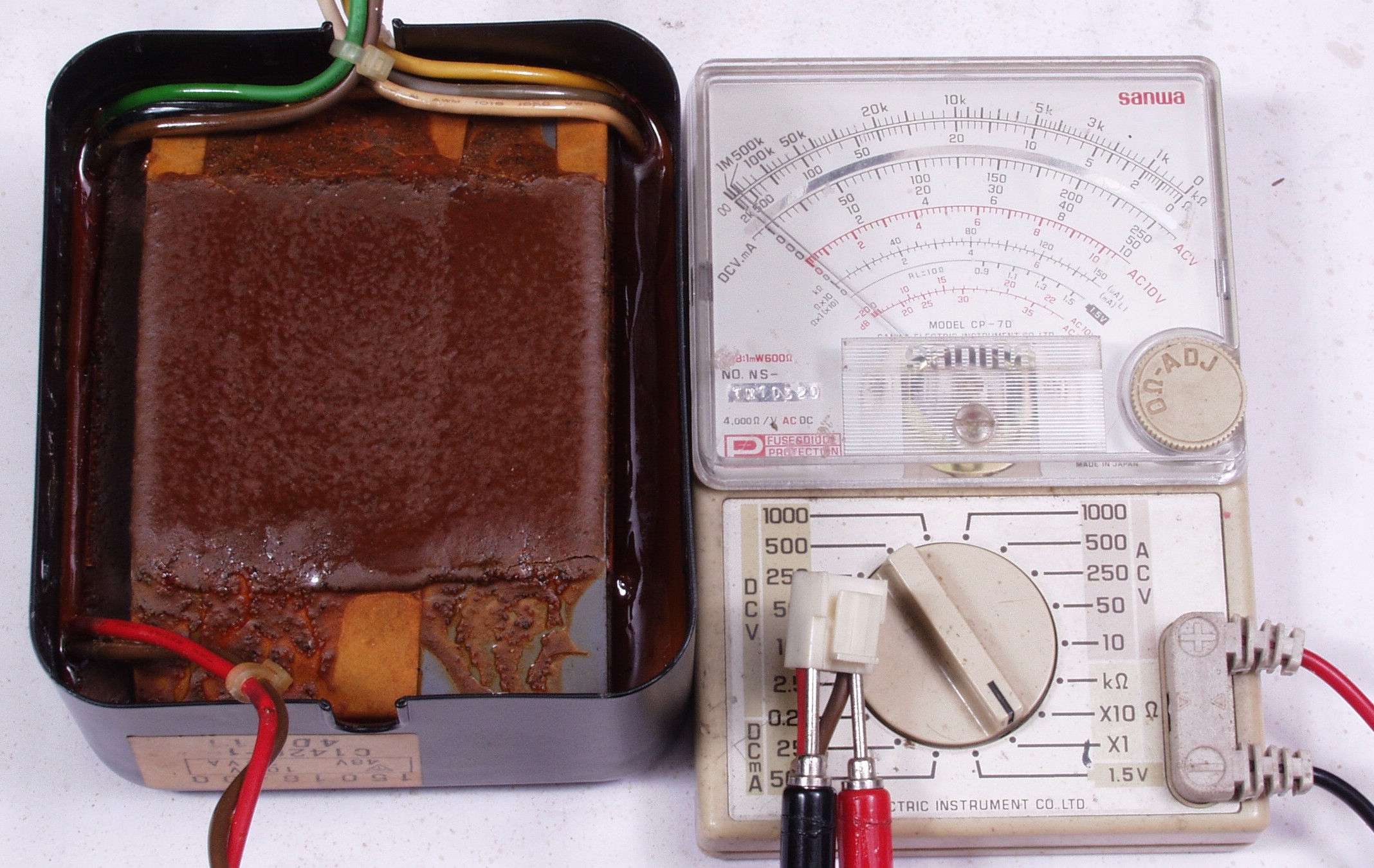 | A61. 点検中 焼き切れた電源トランス、充填材の変色を見るとうなずける <<こちらと比較>> | |||||||||||||||||||
