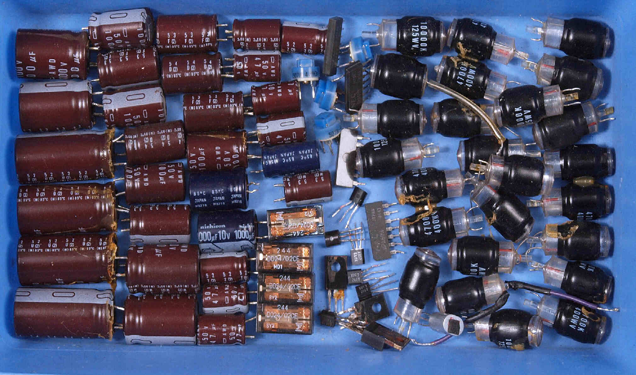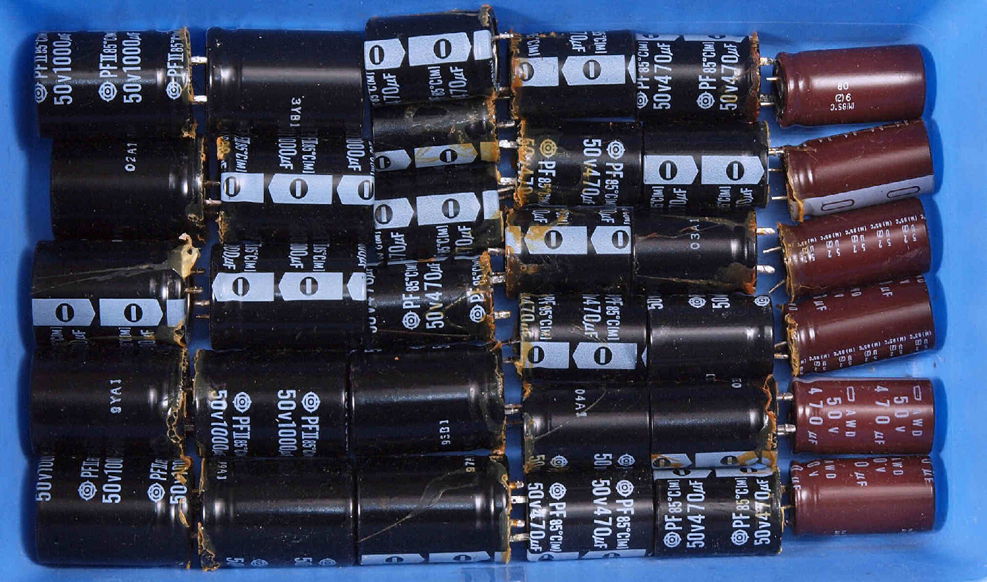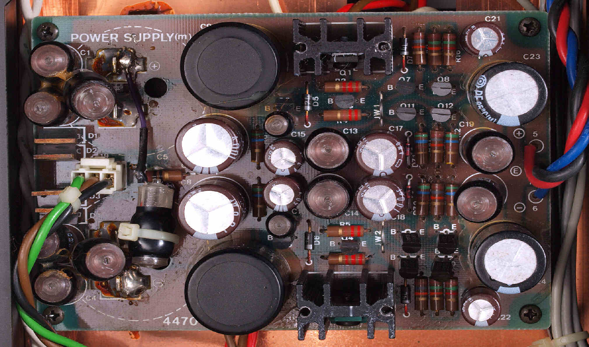 | C212. 修理中 L側電源基板、 電解コンデンサー固定用の接着材、当時は溶媒にトルエンが使用されており、銅を腐食する。 | ||||||||||||||||||