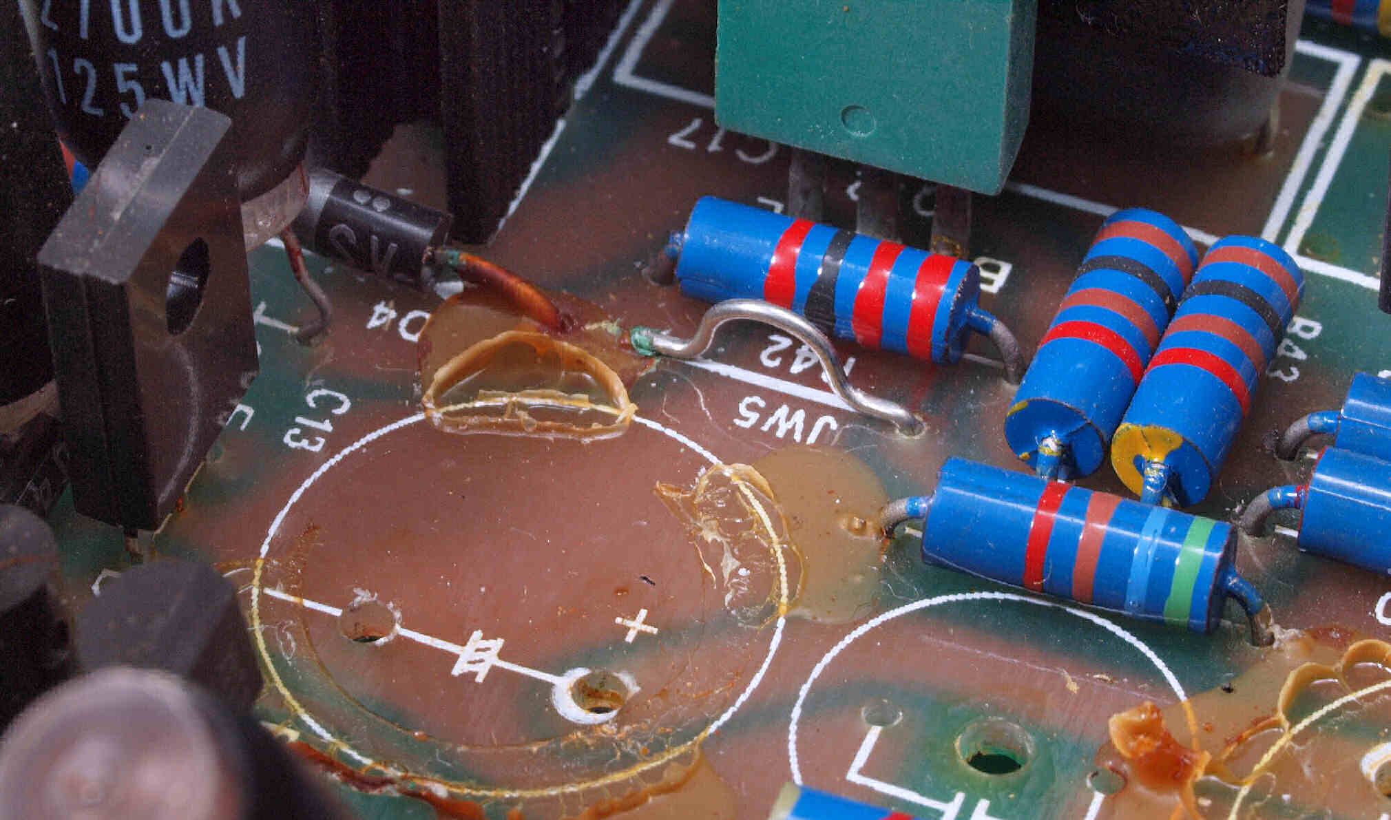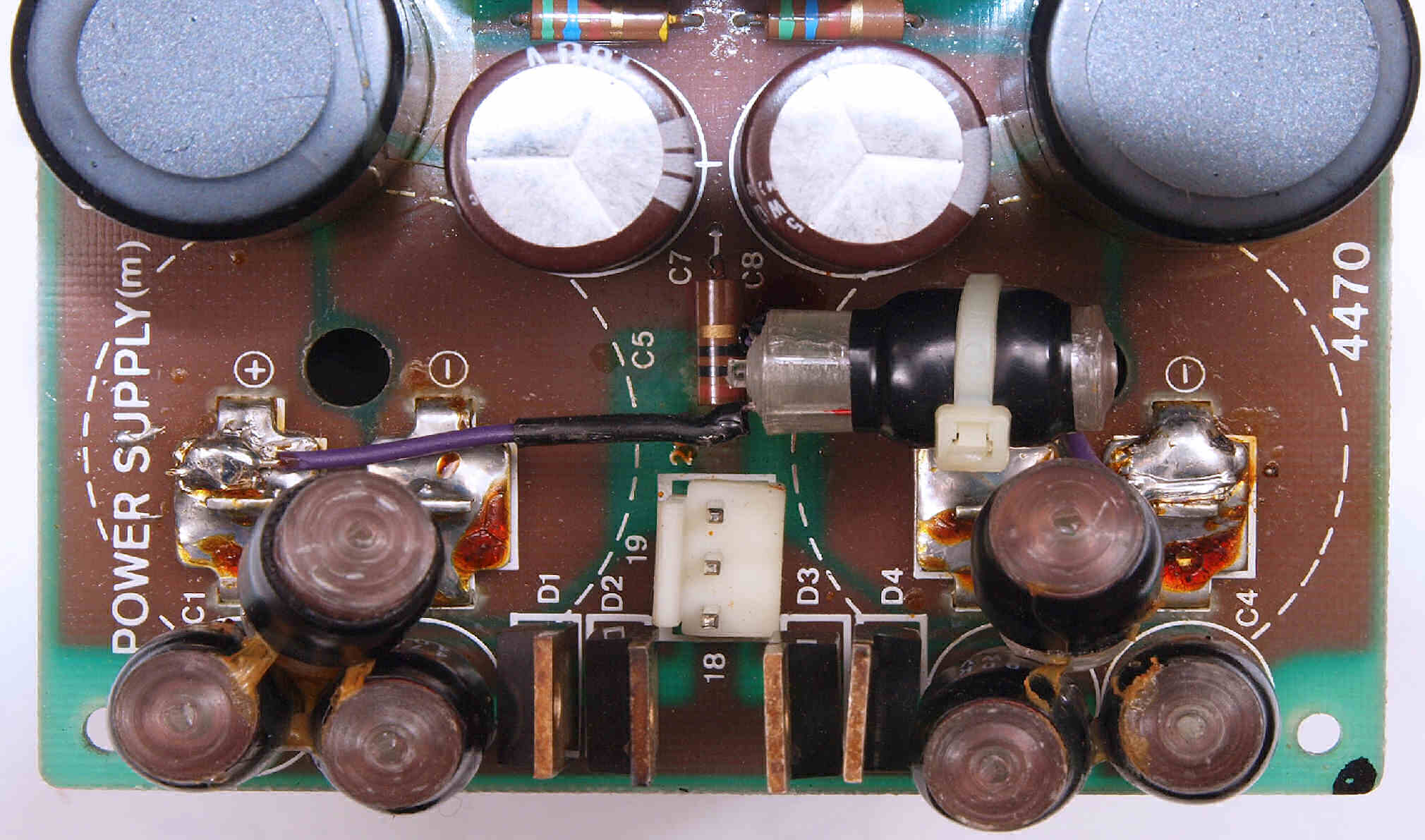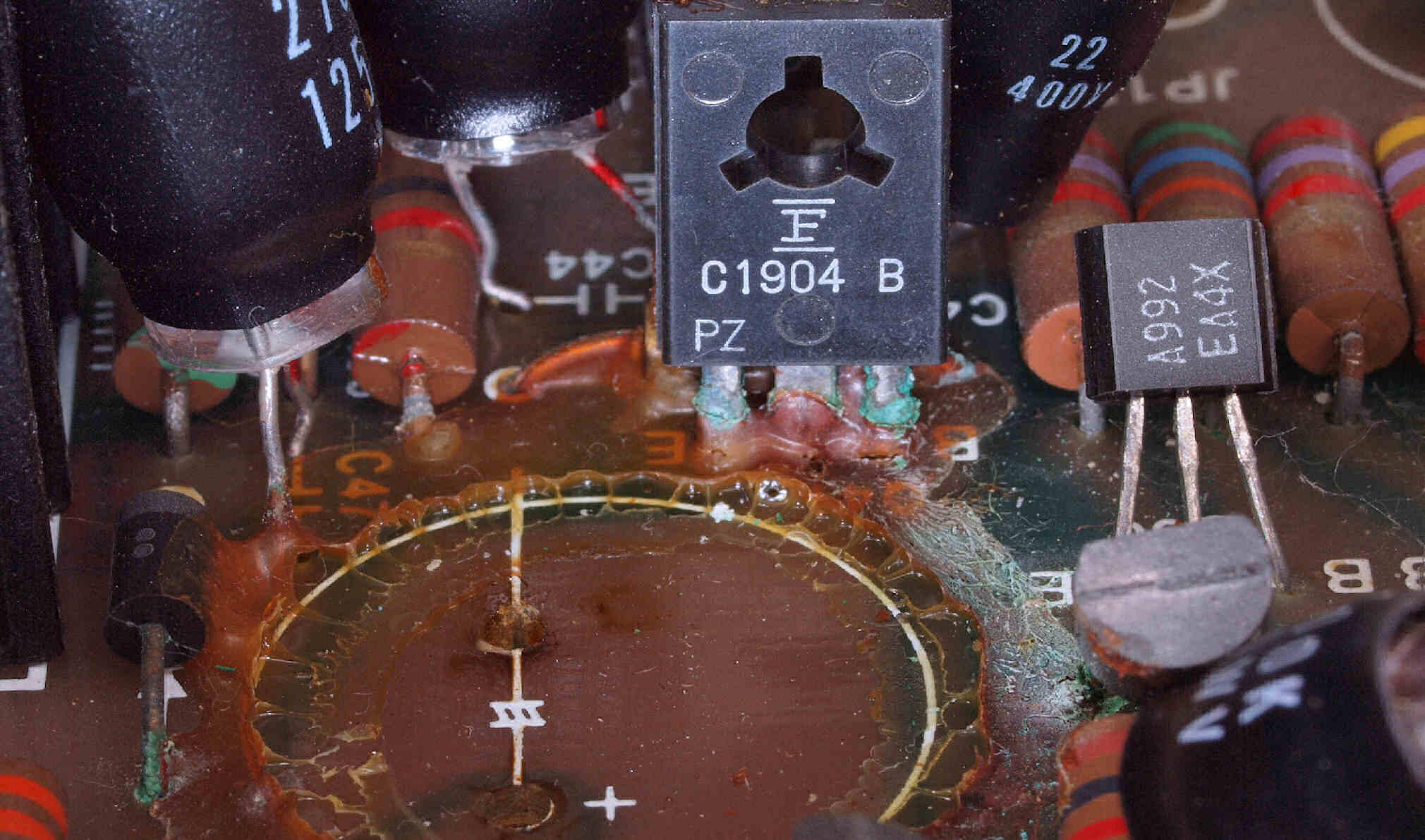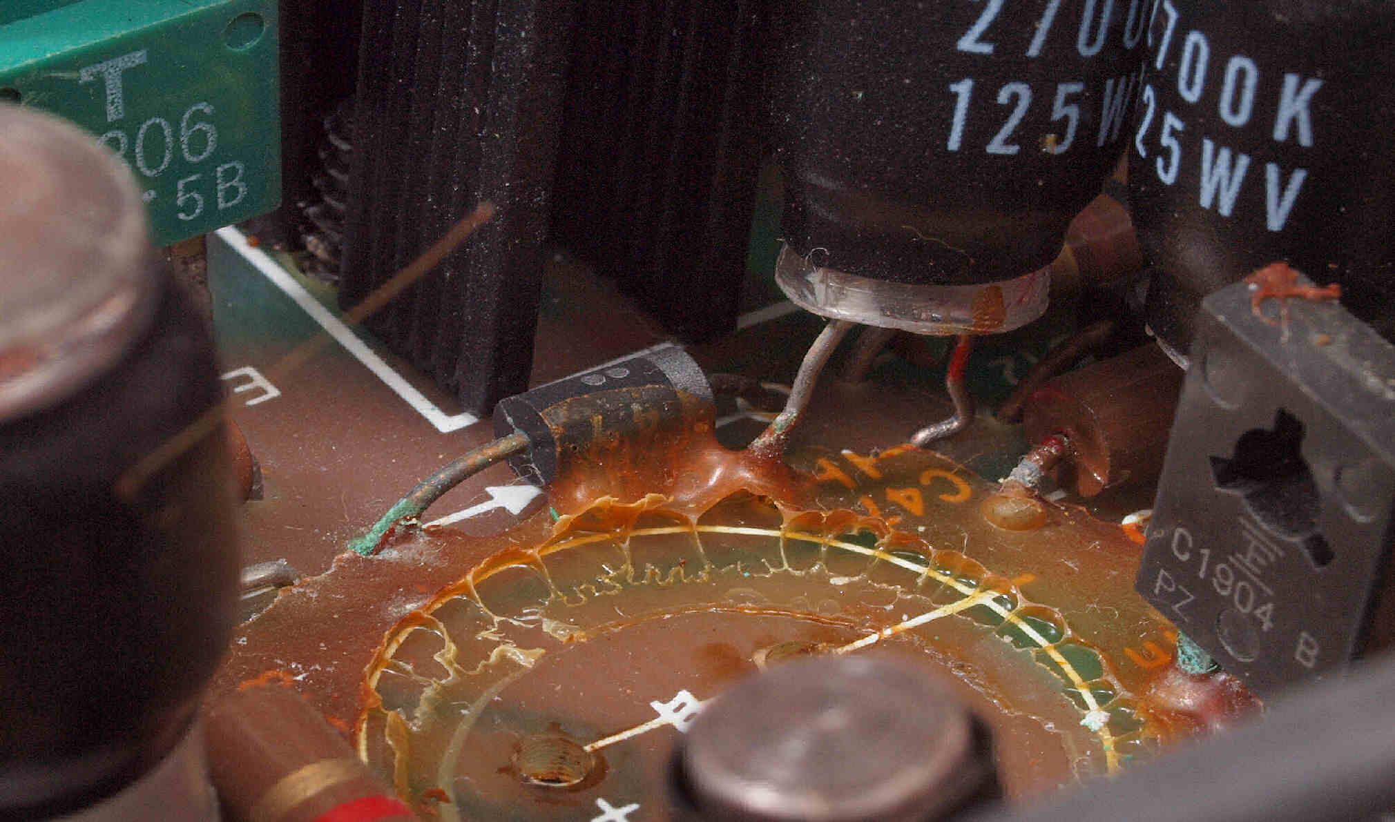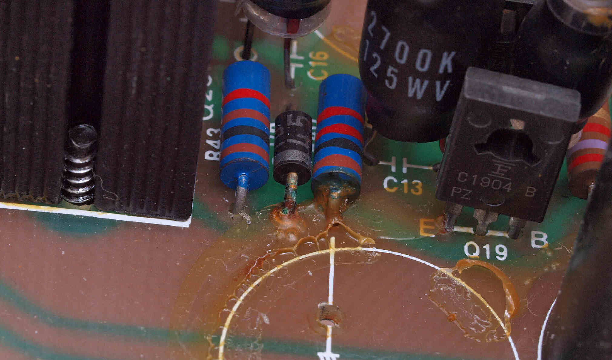 | C114. 修理中 R側電源基板、 電解コンデンサー固定用の接着材、当時は溶媒にトルエンが使用されており、銅を腐食する。 | ||||||||||||||||||