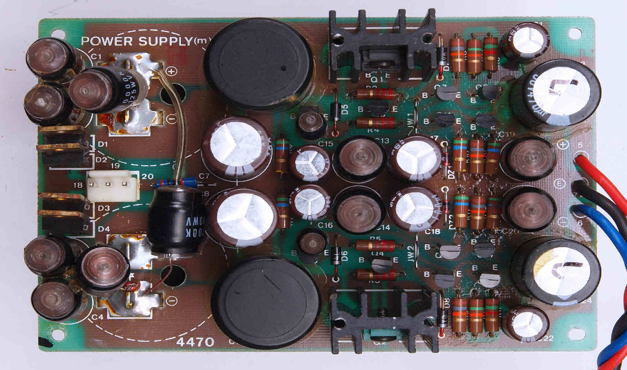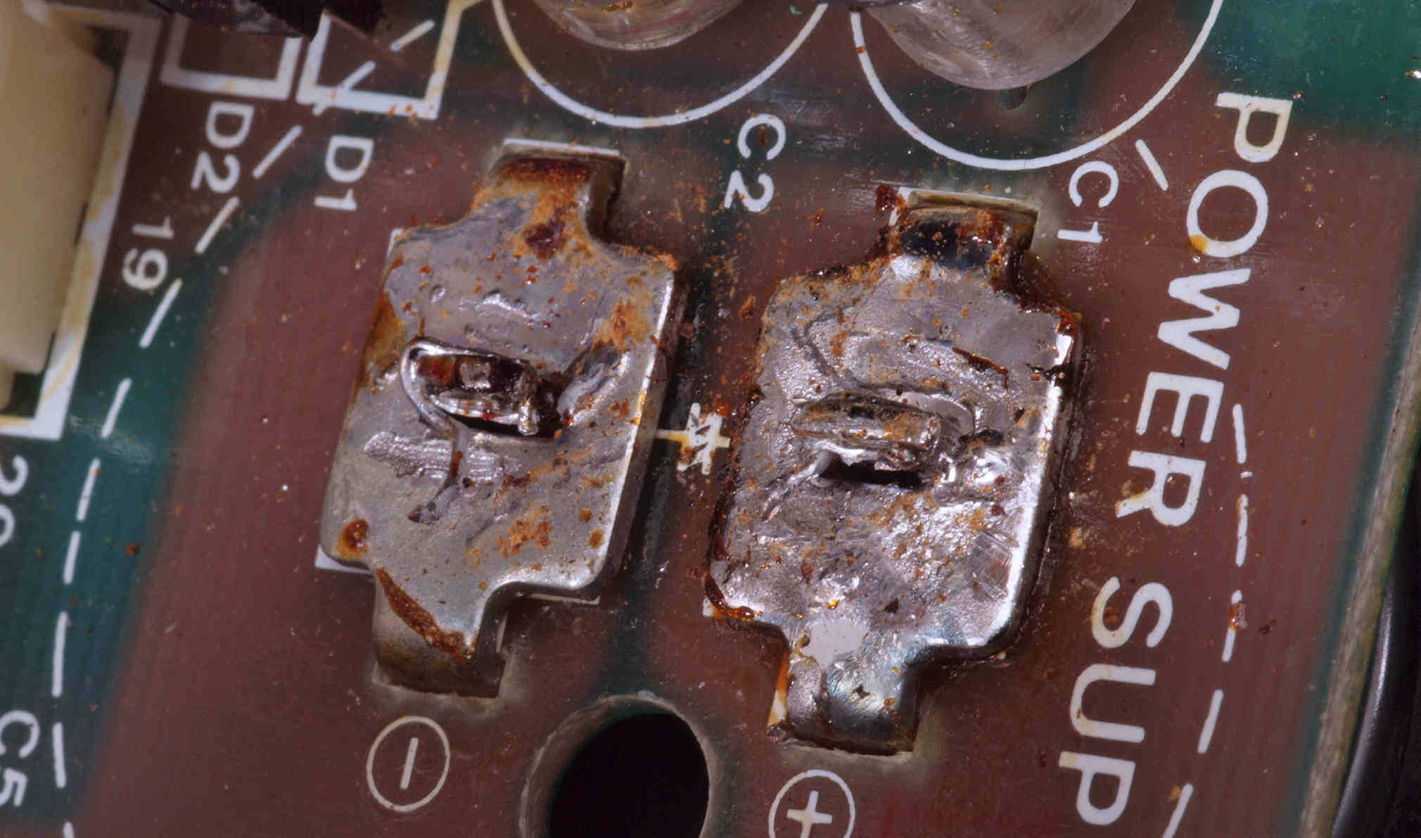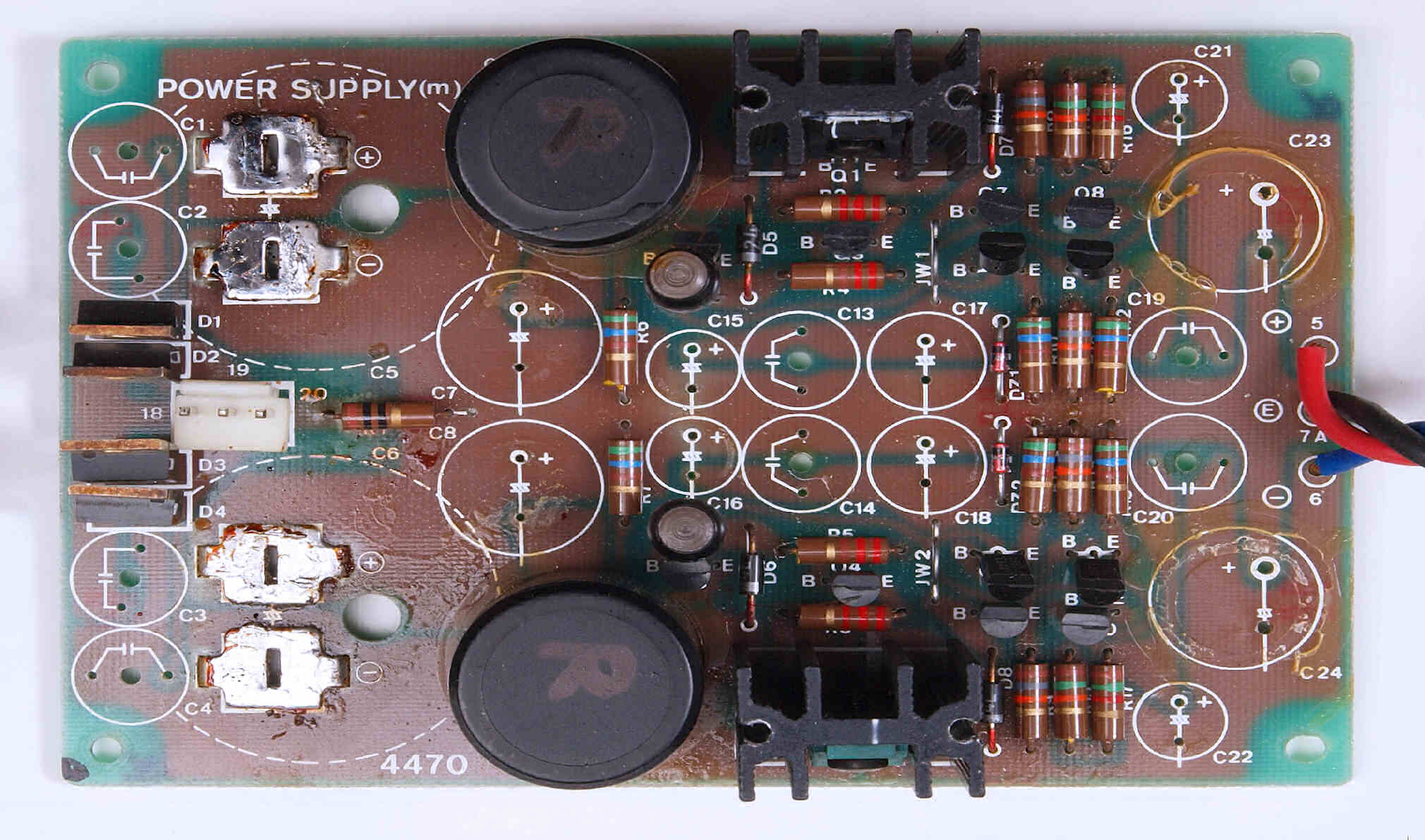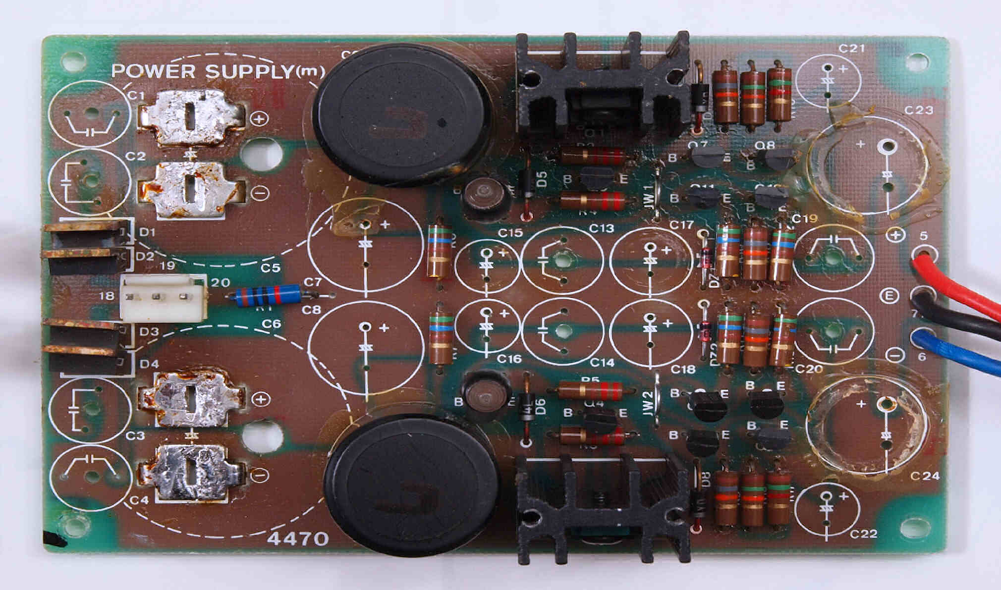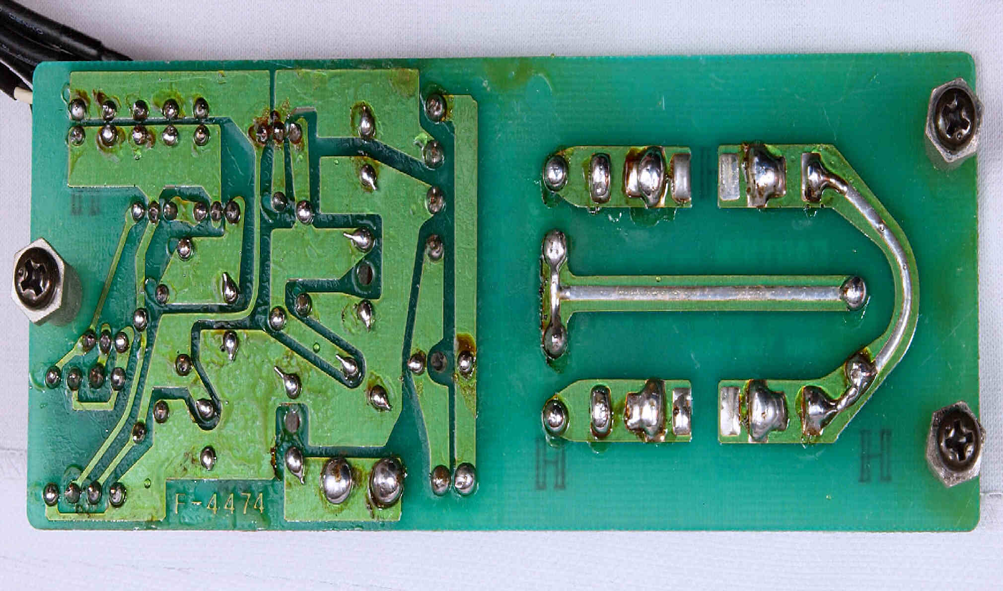 | C114. 修理中 R側電源基板、 電解コンデンサー固定用の接着材、当時は溶媒にトルエンが使用されており、銅を腐食する。 | ||||||||||||||||||