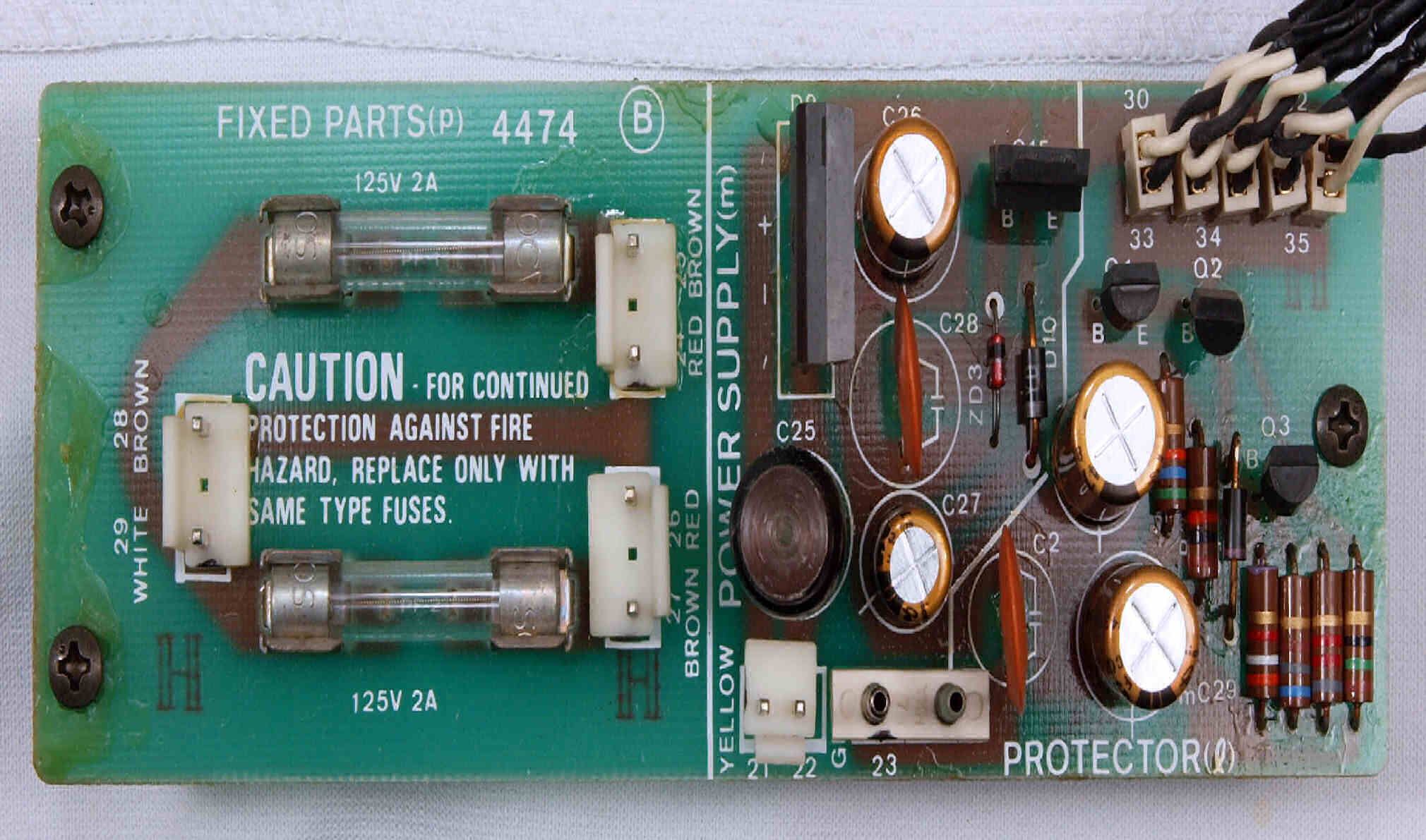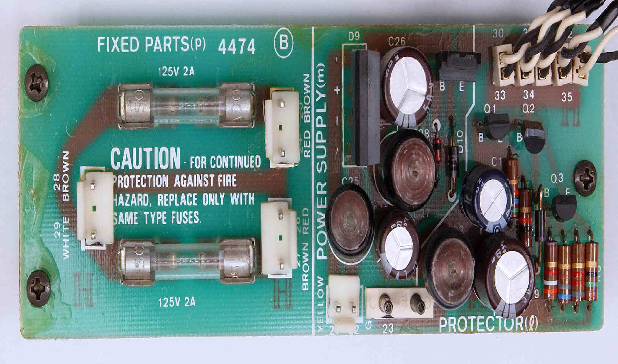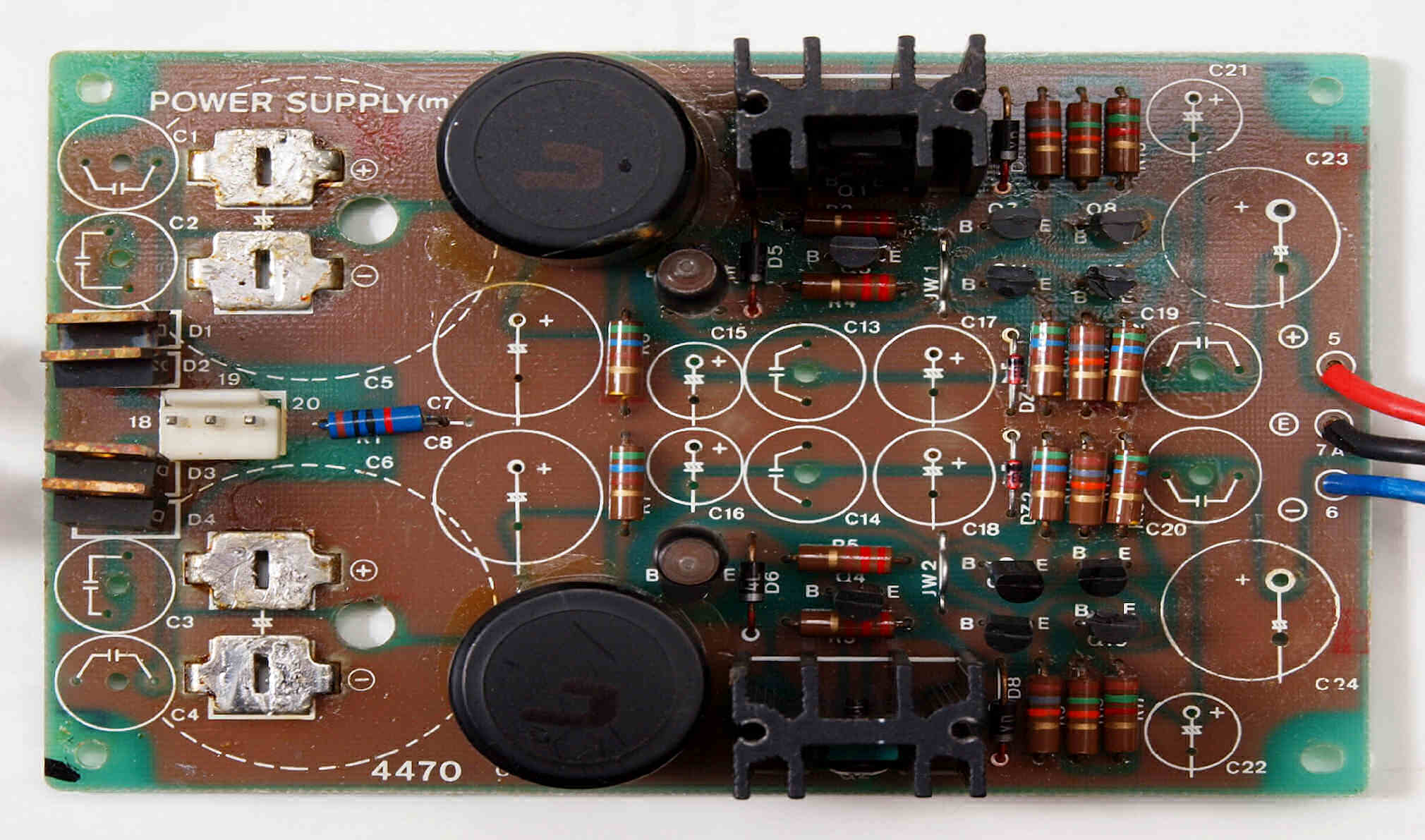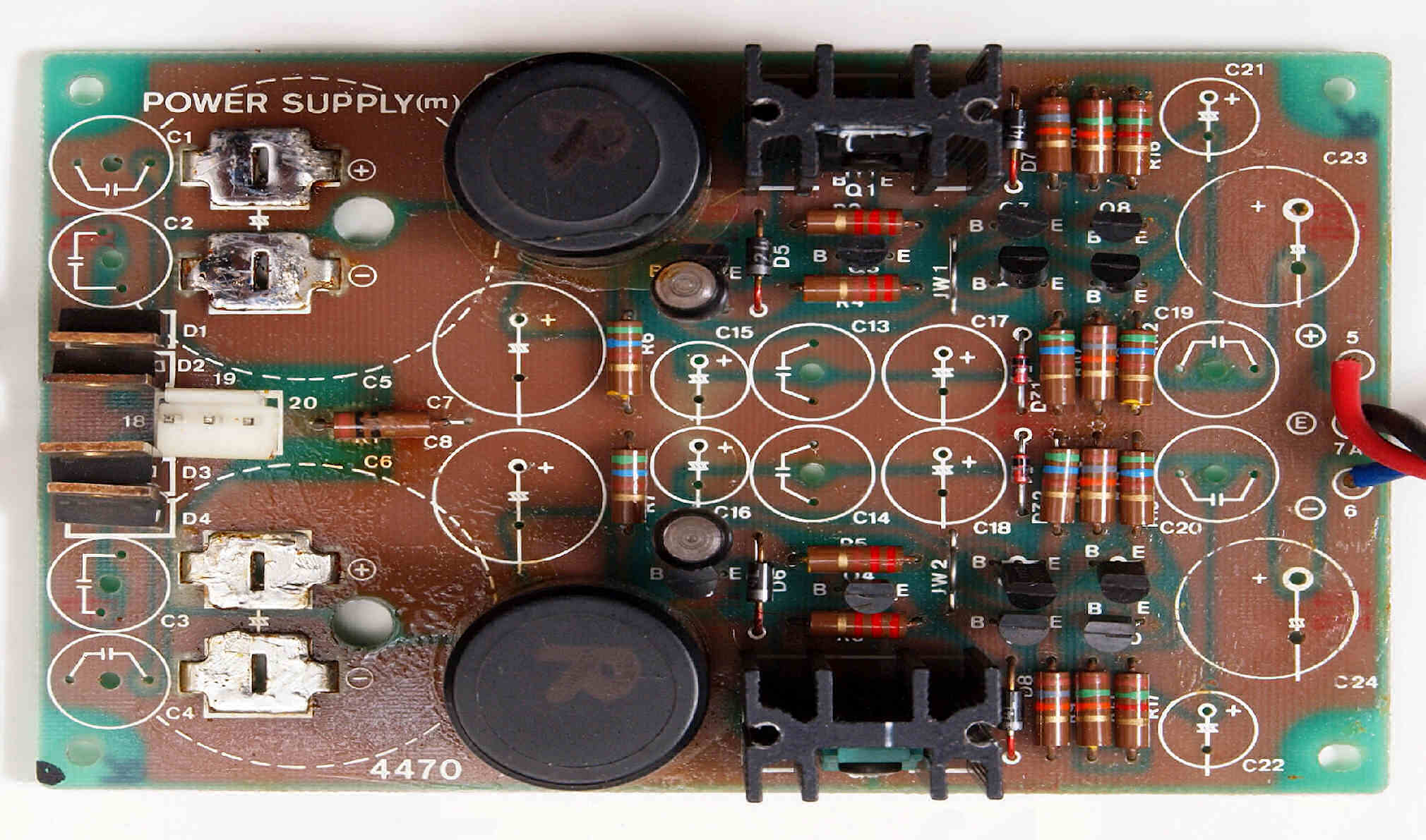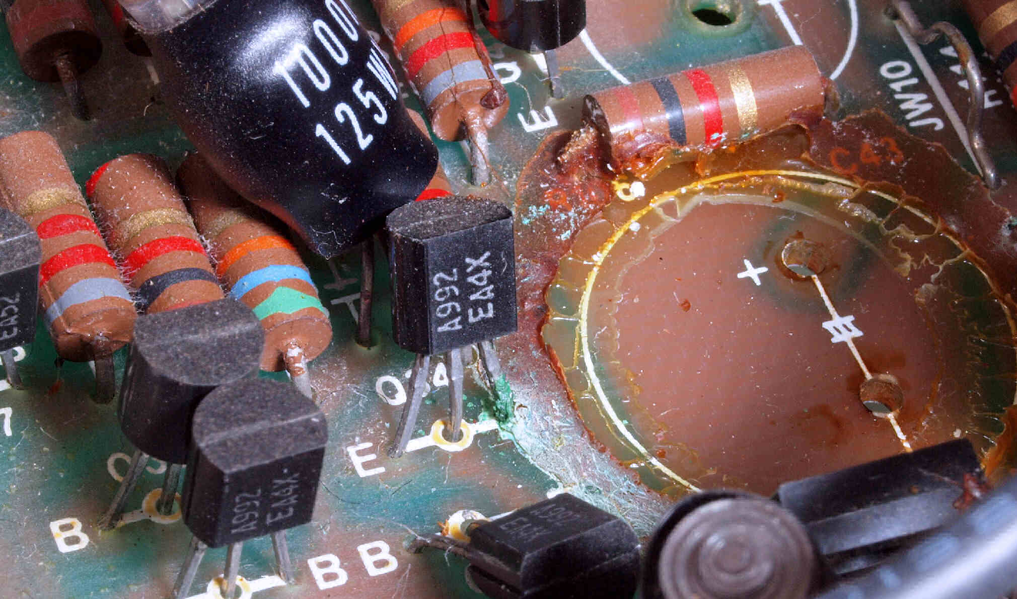 | C114. 修理中 R側電源基板、 電解コンデンサー固定用の接着材、当時は溶媒にトルエンが使用されており、銅を腐食する。 | ||||||||||||||||||