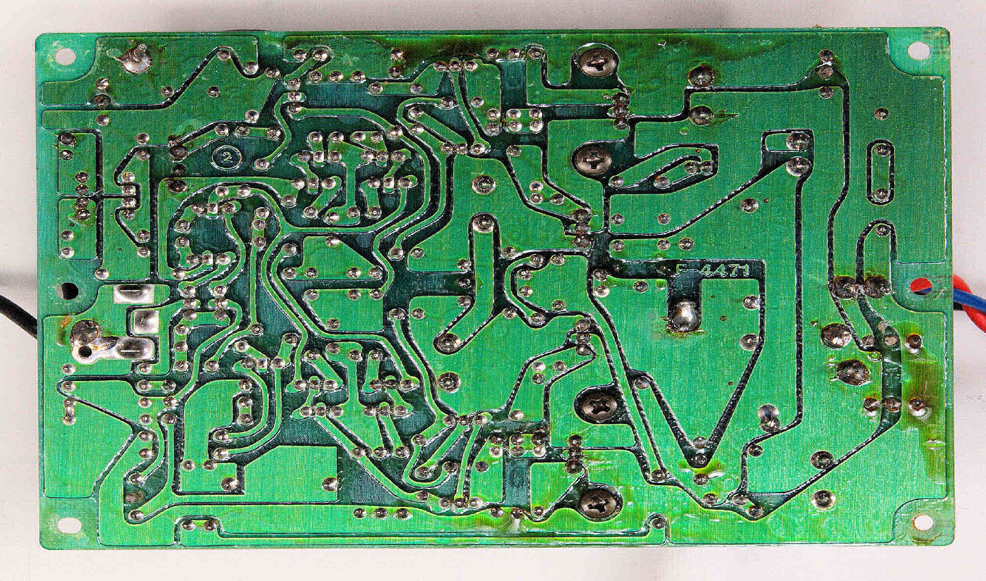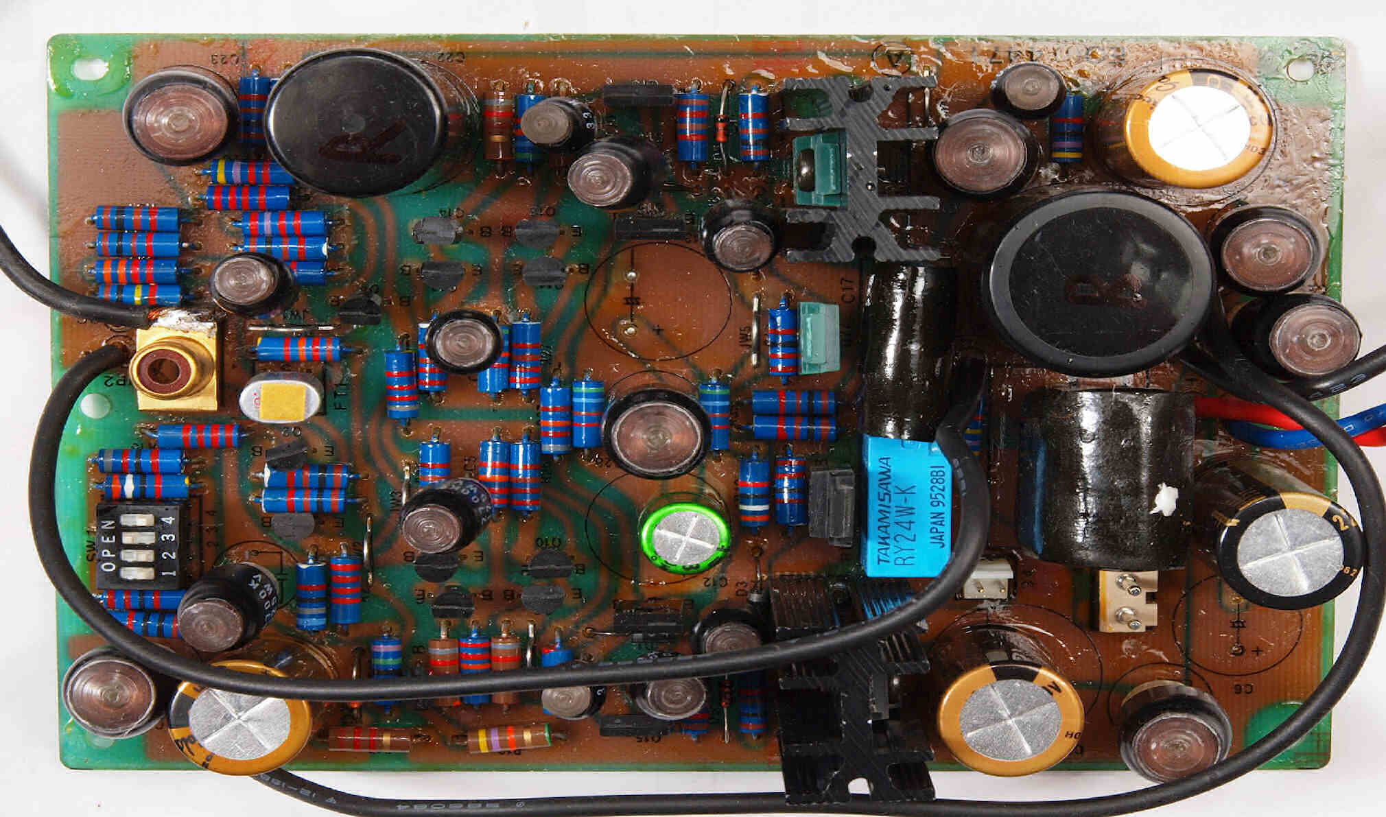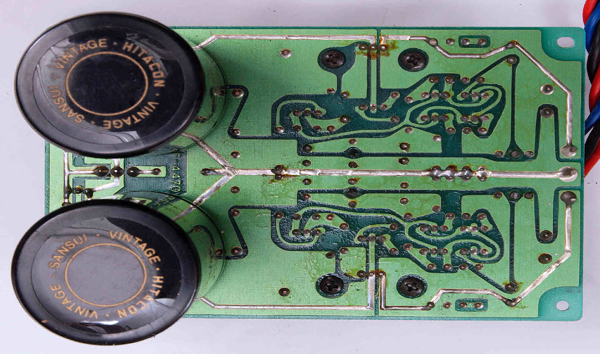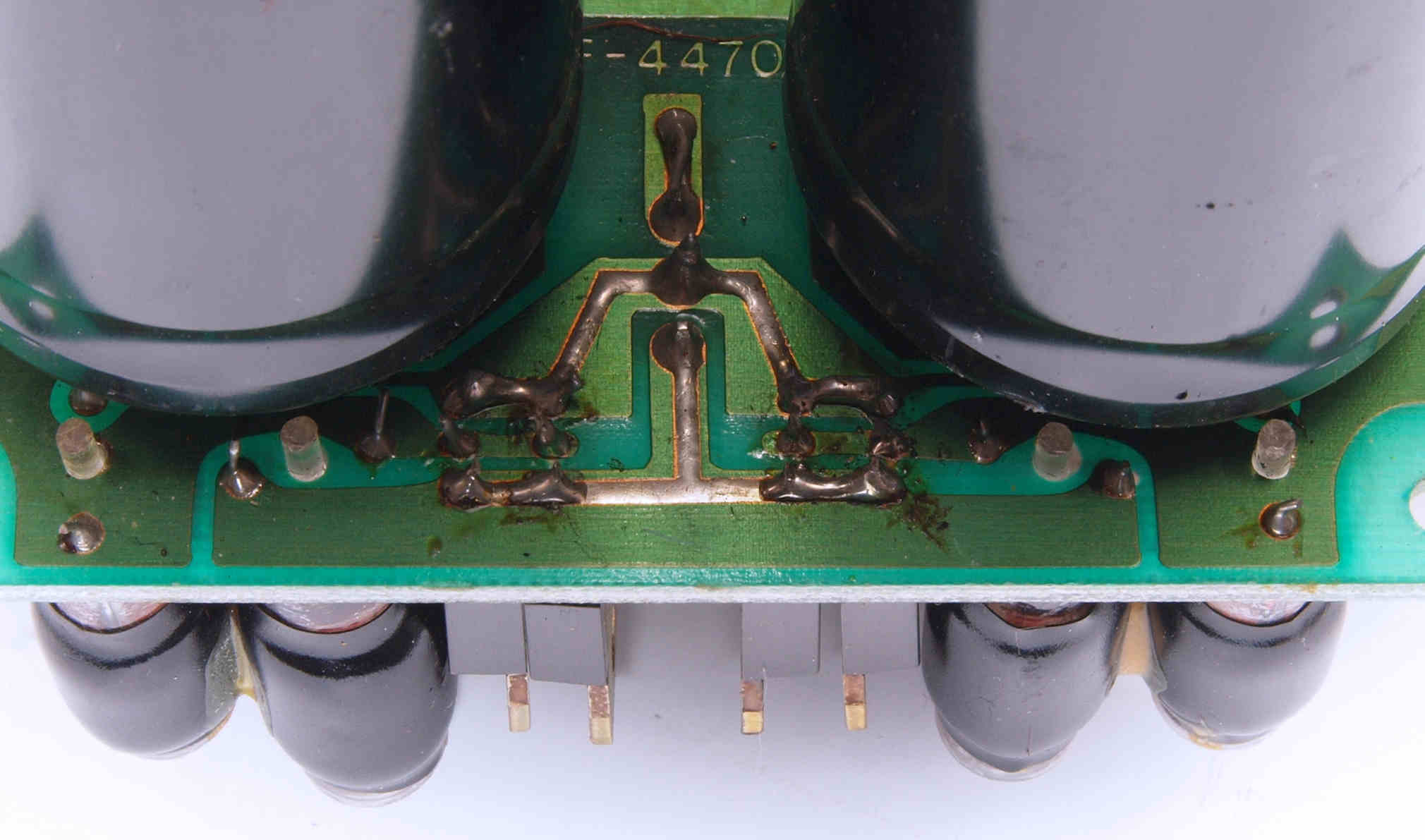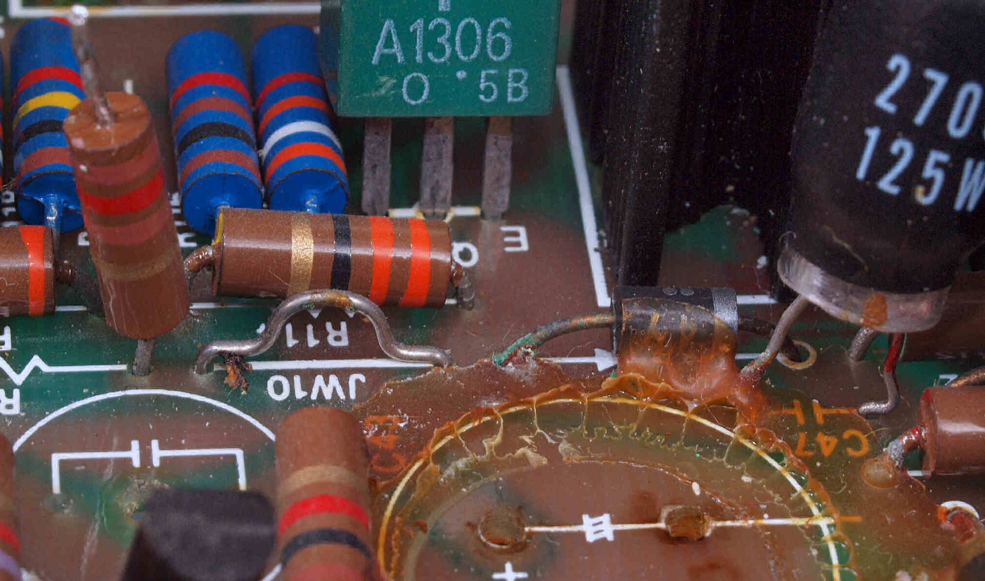 | C311. 修理中 R側AMP基板、 電解コンデンサー固定用の接着材、当時は溶媒にトルエンが使用されており、銅を腐食する。 | ||||||||||||||||||