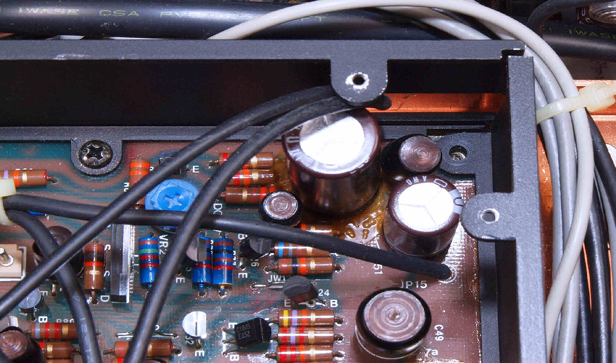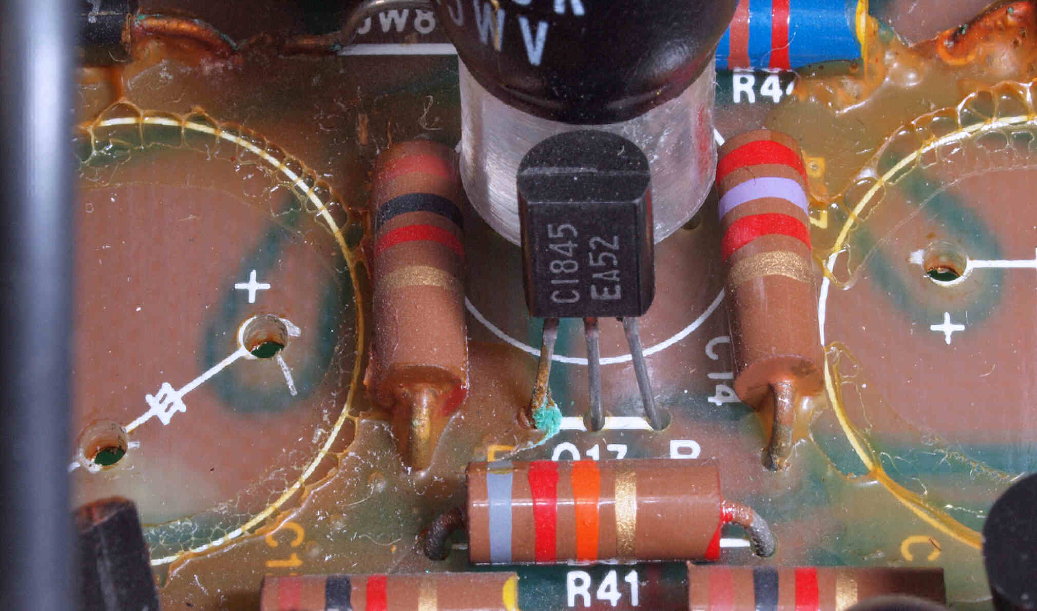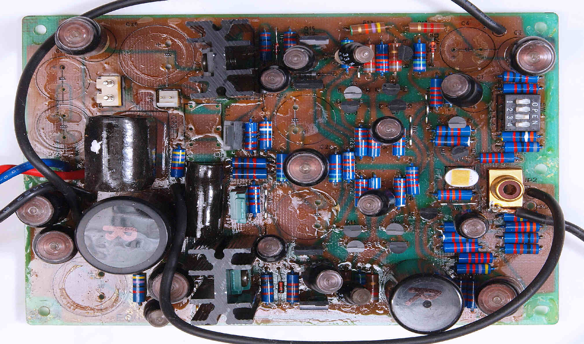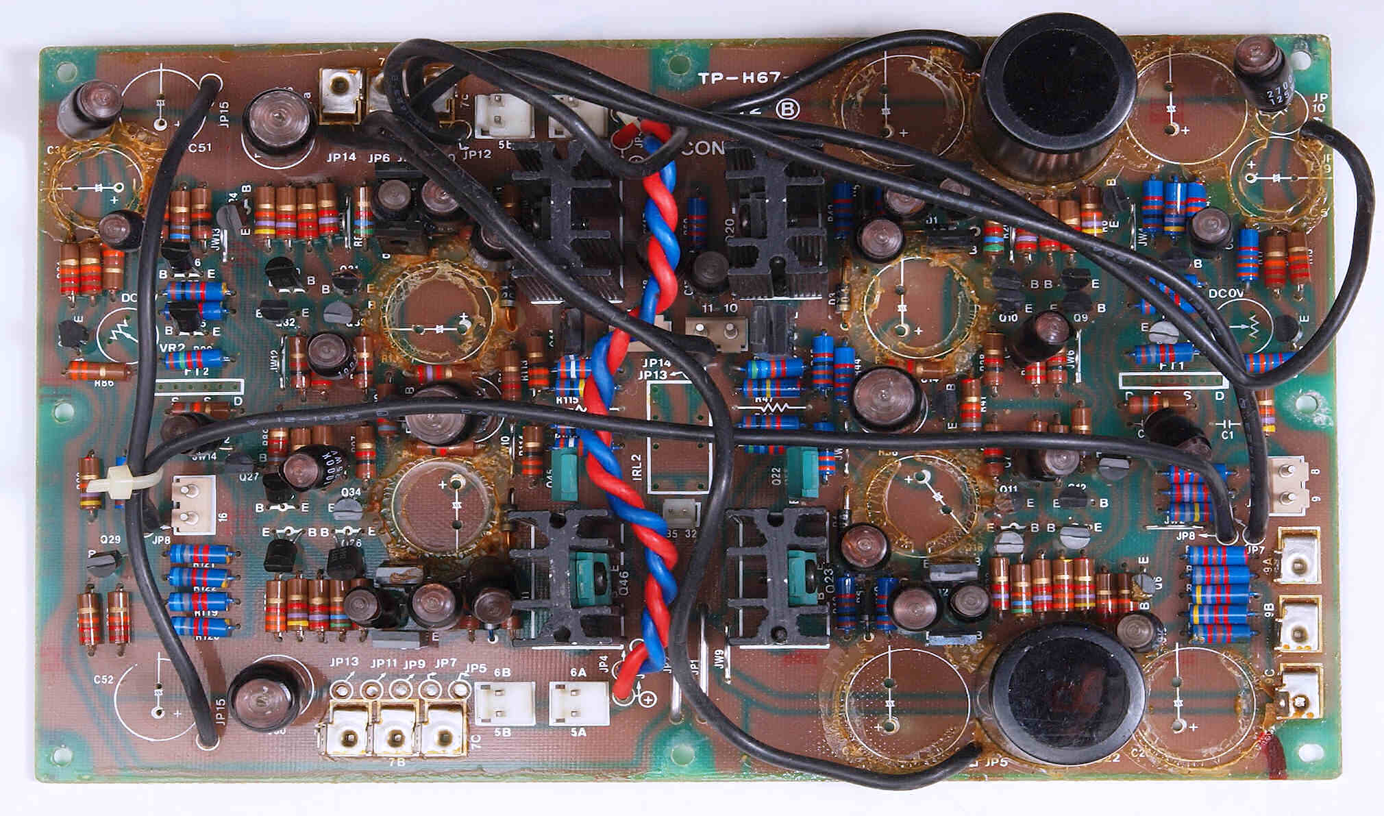 | C311. 修理中 R側AMP基板、 電解コンデンサー固定用の接着材、当時は溶媒にトルエンが使用されており、銅を腐食する。 | ||||||||||||||||||