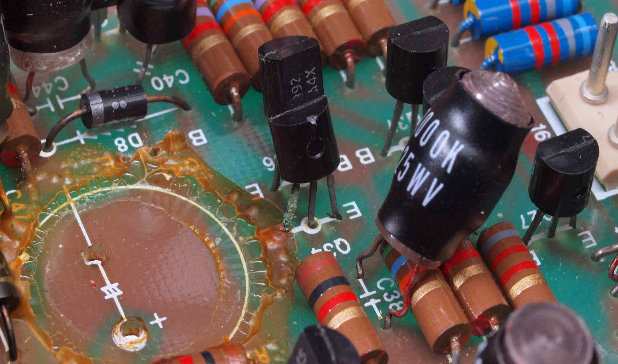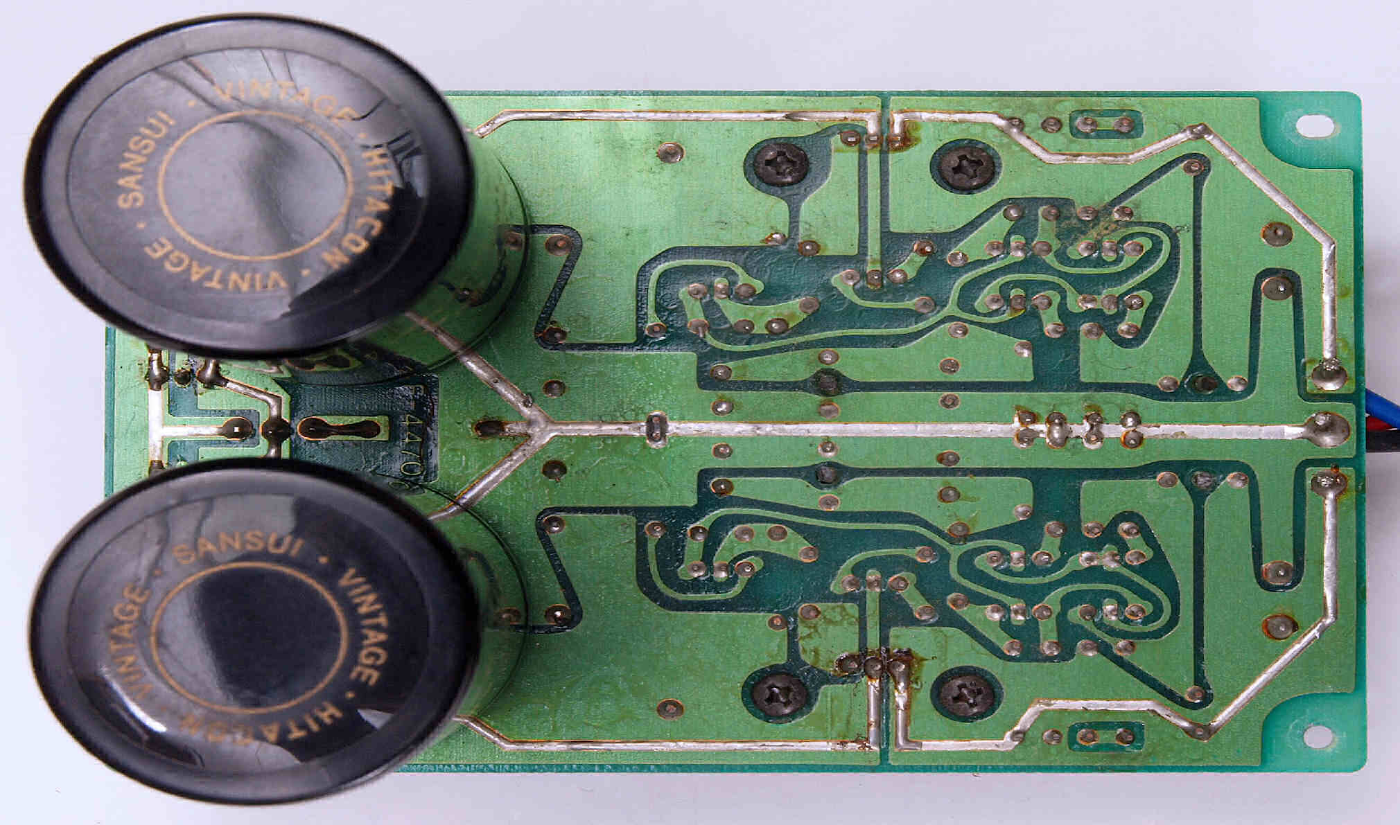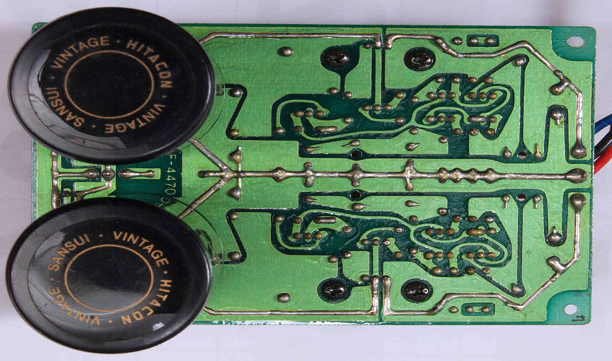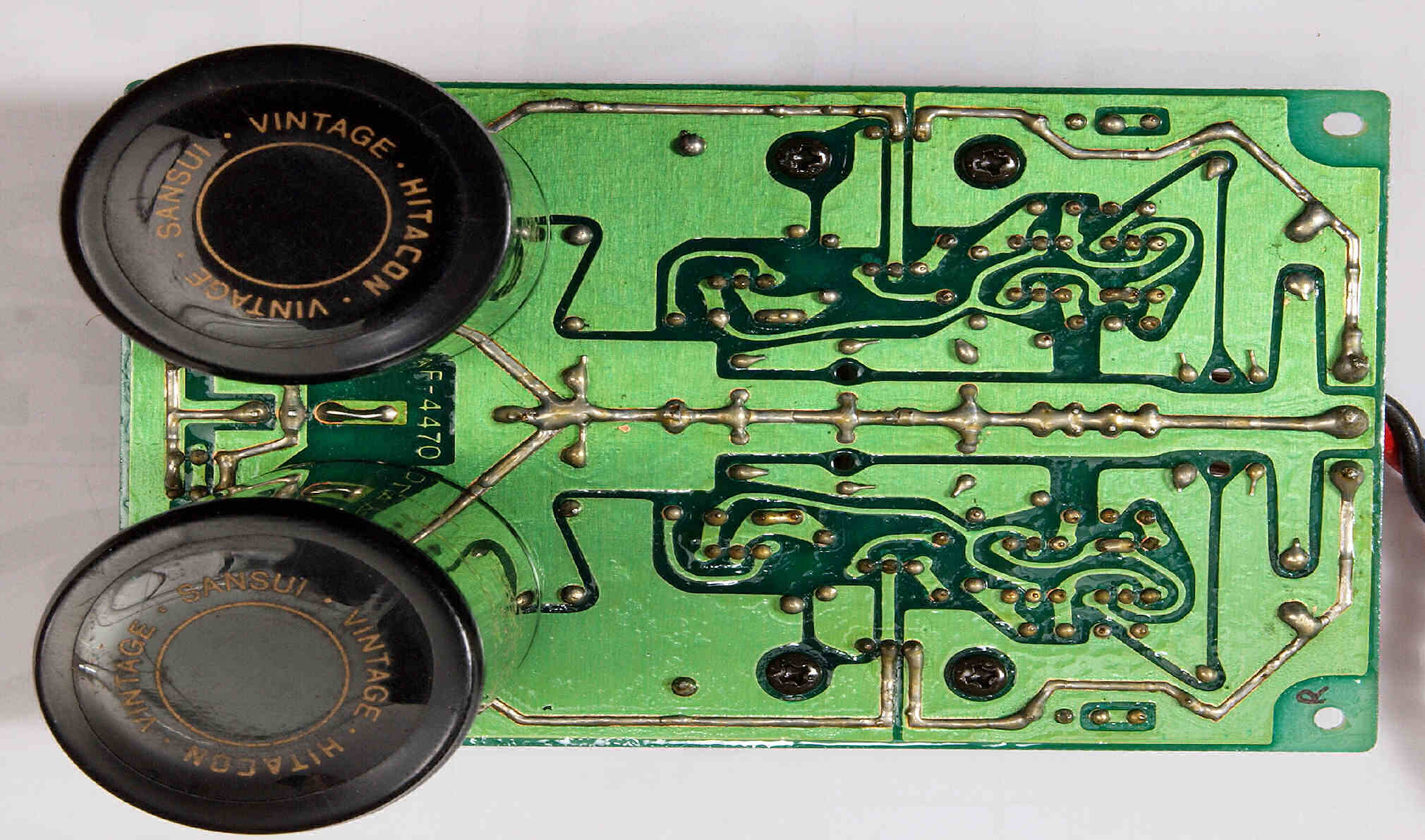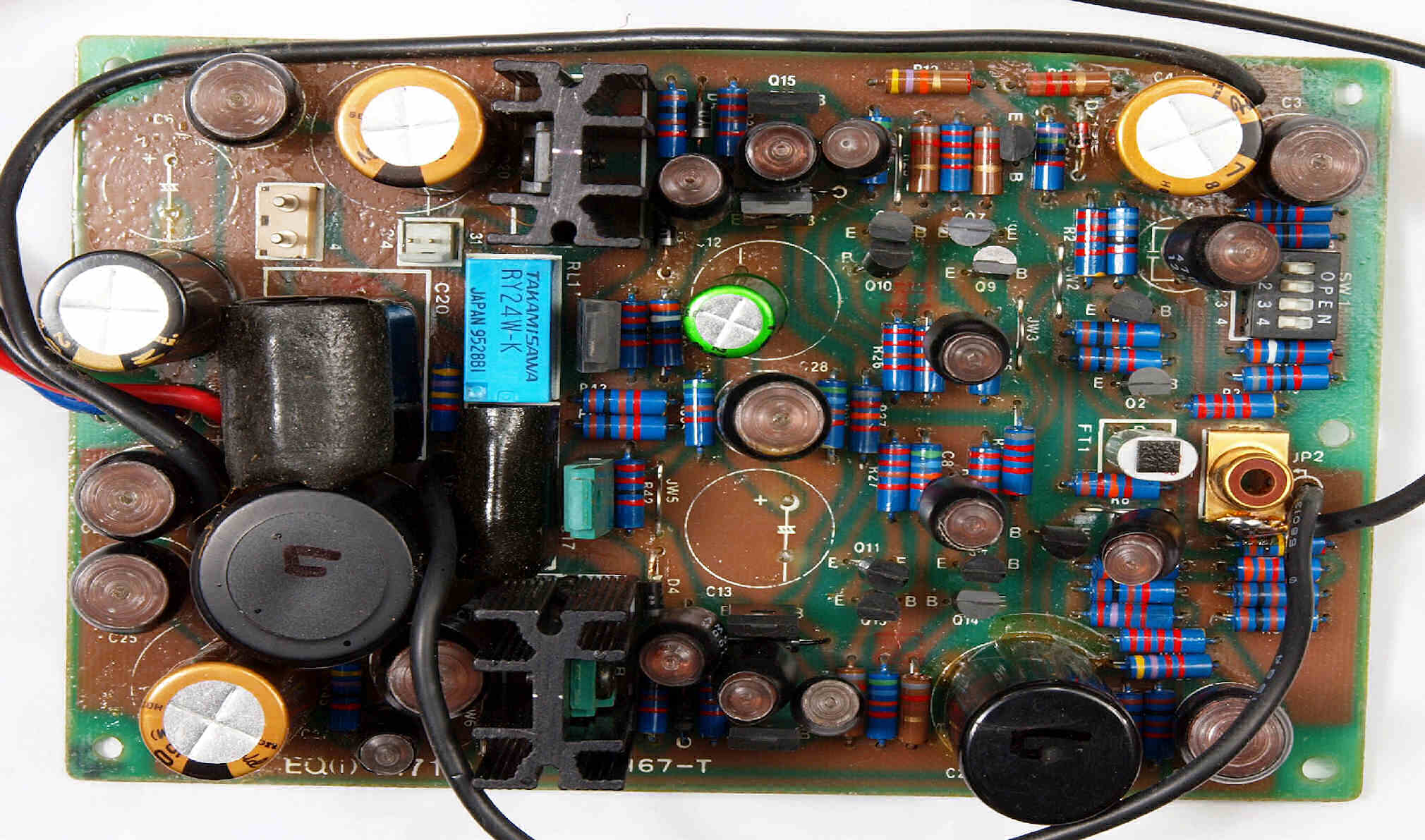| C311. 修理中 R側AMP基板、 電解コンデンサー固定用の接着材、当時は溶媒にトルエンが使用されており、銅を腐食する。 | ||||||||||||||||||