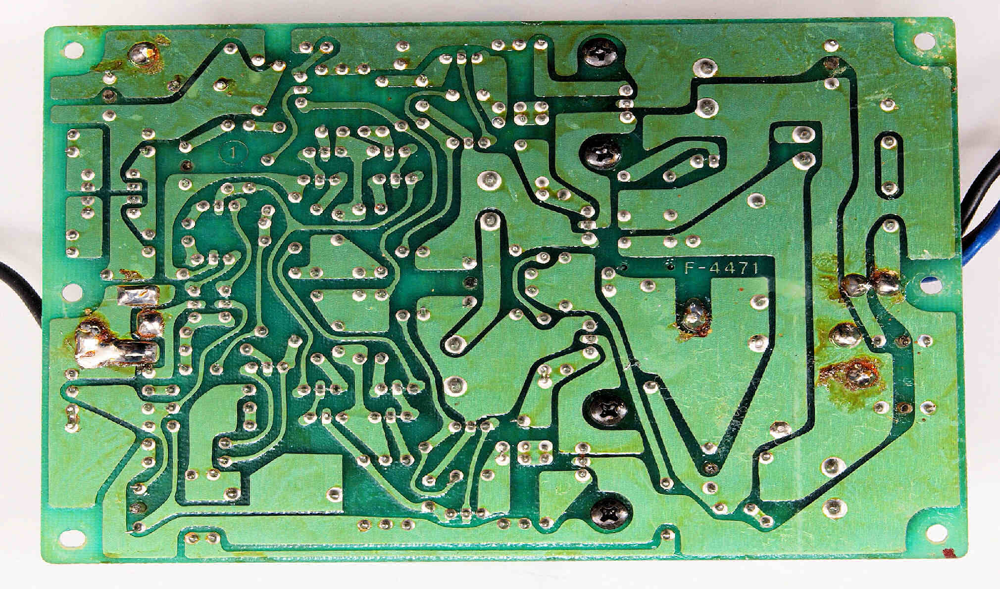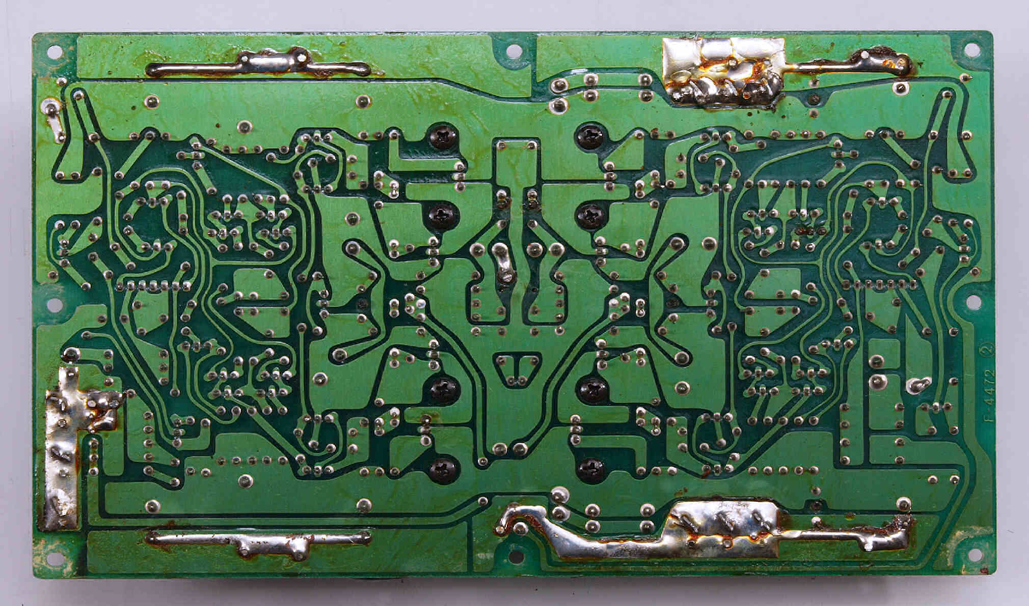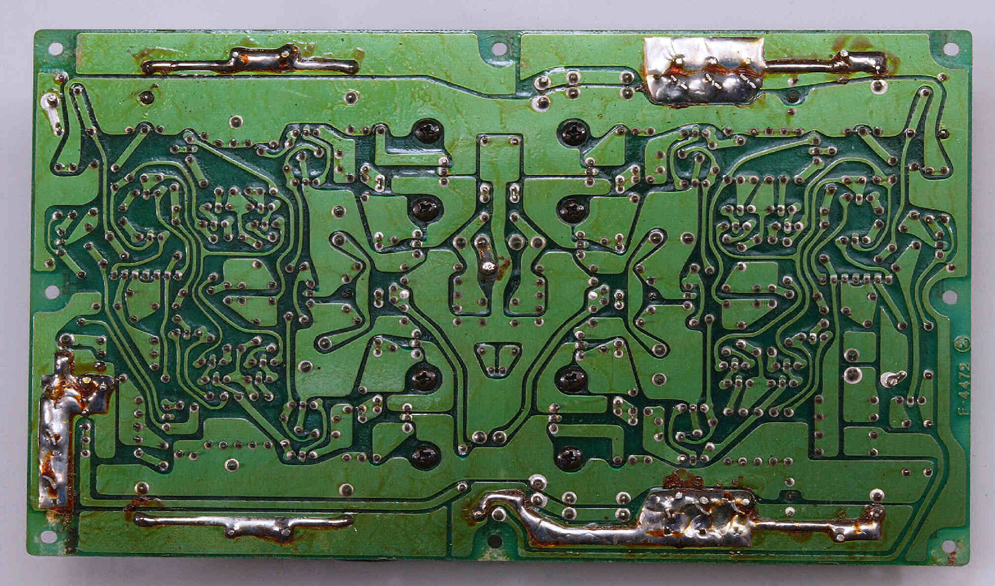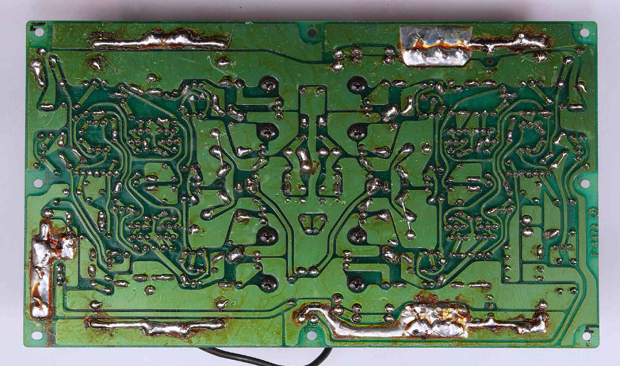 | C412. 修理中 R側AMP基板、 電解コンデンサー固定用の接着材、当時は溶媒にトルエンが使用されており、銅を腐食する。 | ||||||||||||||||||