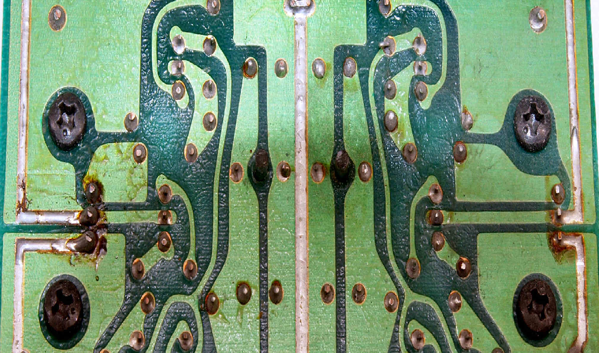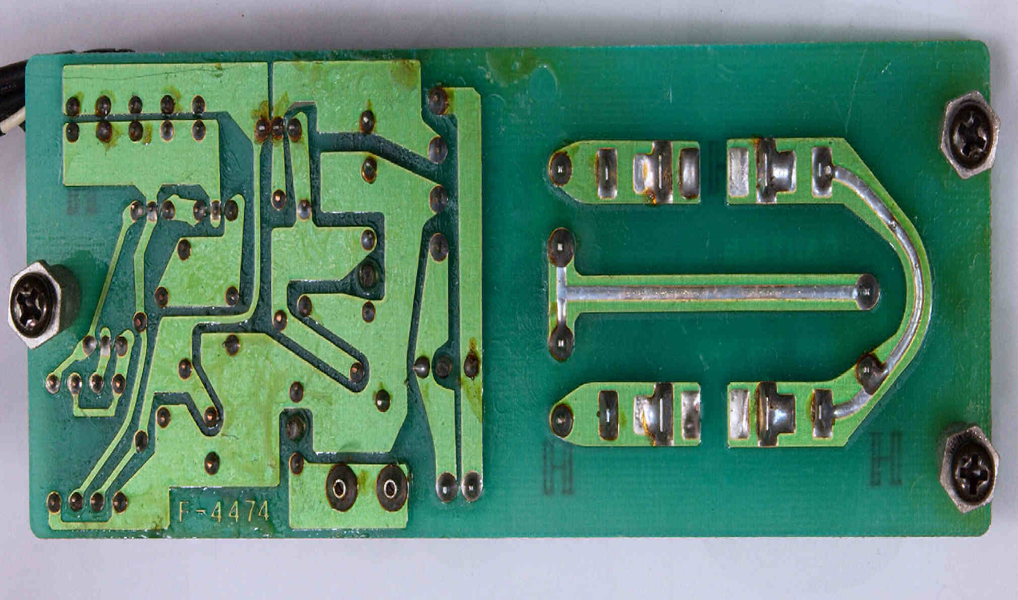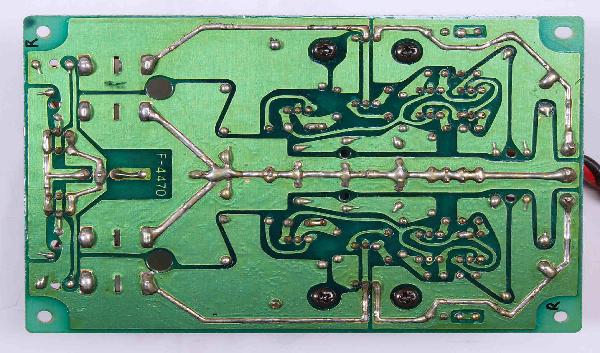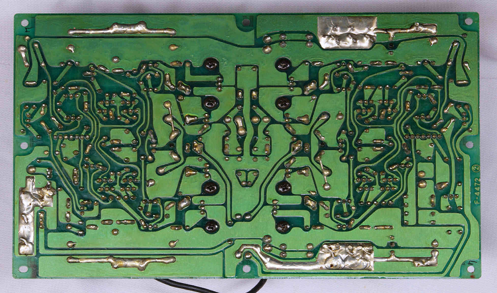 | C412. 修理中 R側AMP基板、 電解コンデンサー固定用の接着材、当時は溶媒にトルエンが使用されており、銅を腐食する。 | ||||||||||||||||||
