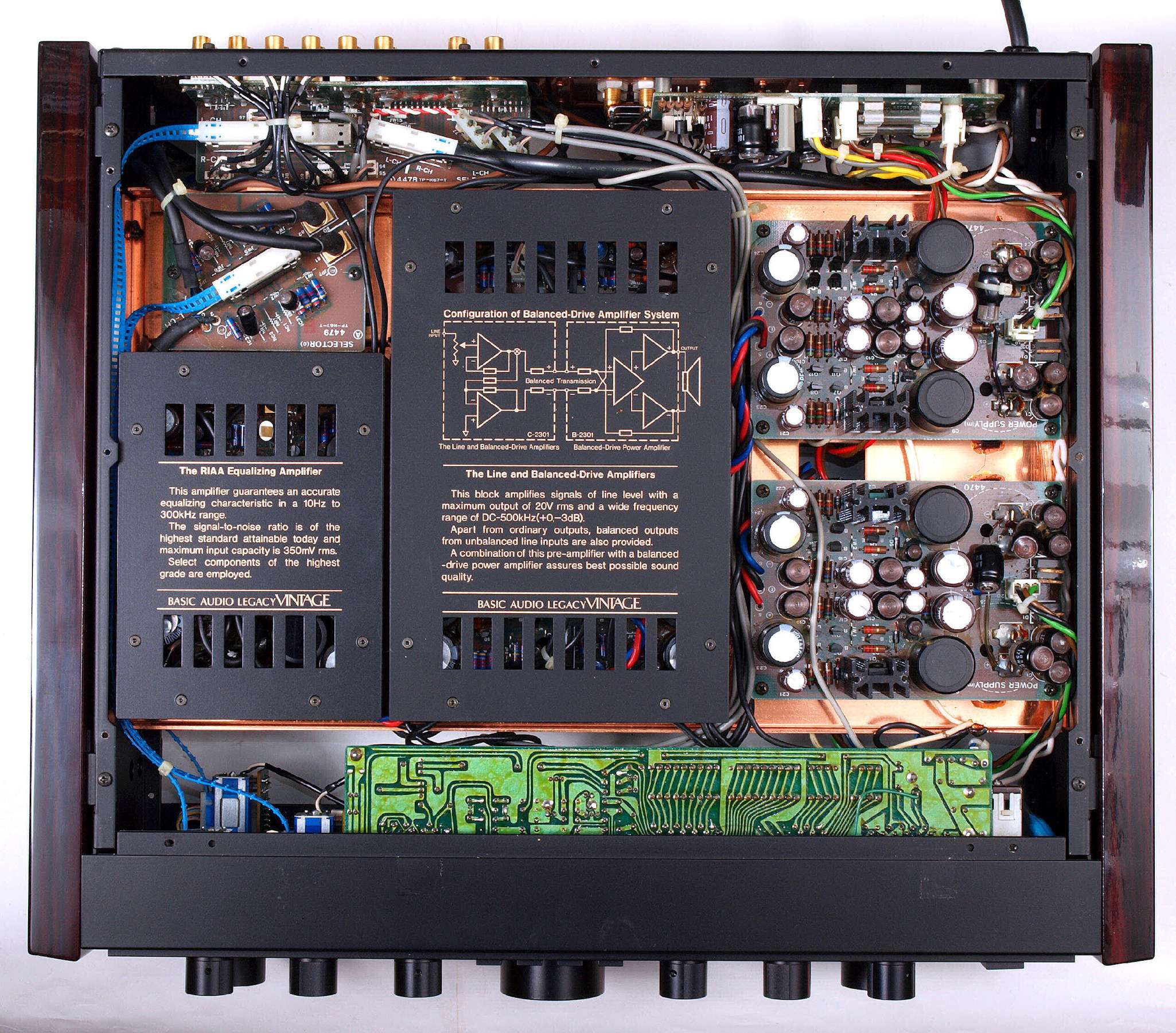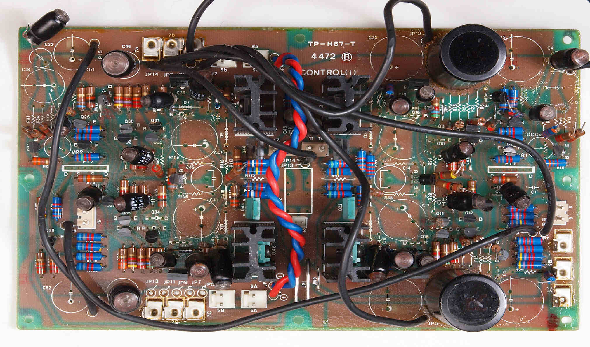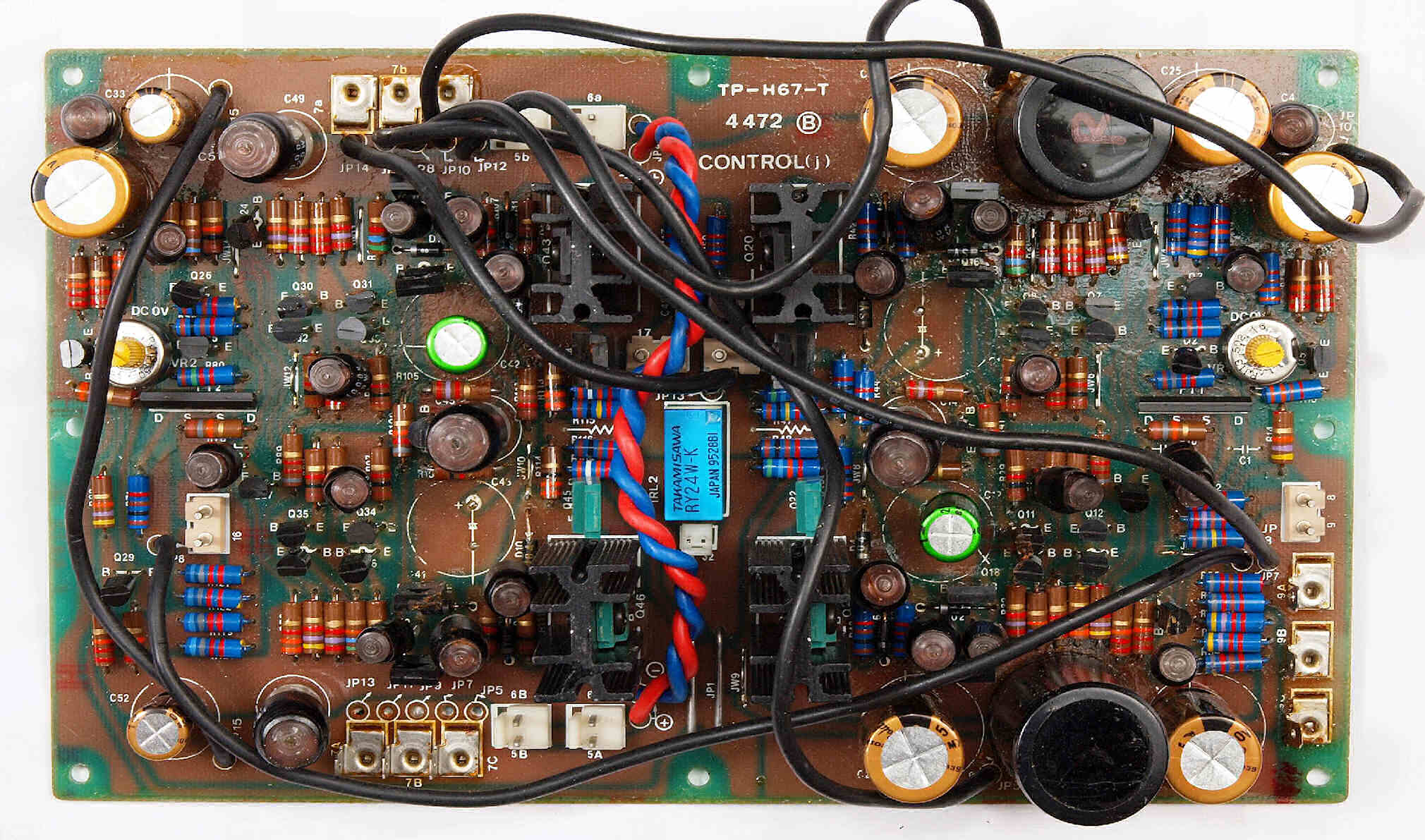 | C42. 修理後 L側AMP基板 初段FET(電界効果トランジスター)2個、半固定VR2個、電解コンデンサー13個、リレー1個交換 | ||||||||||||||||||