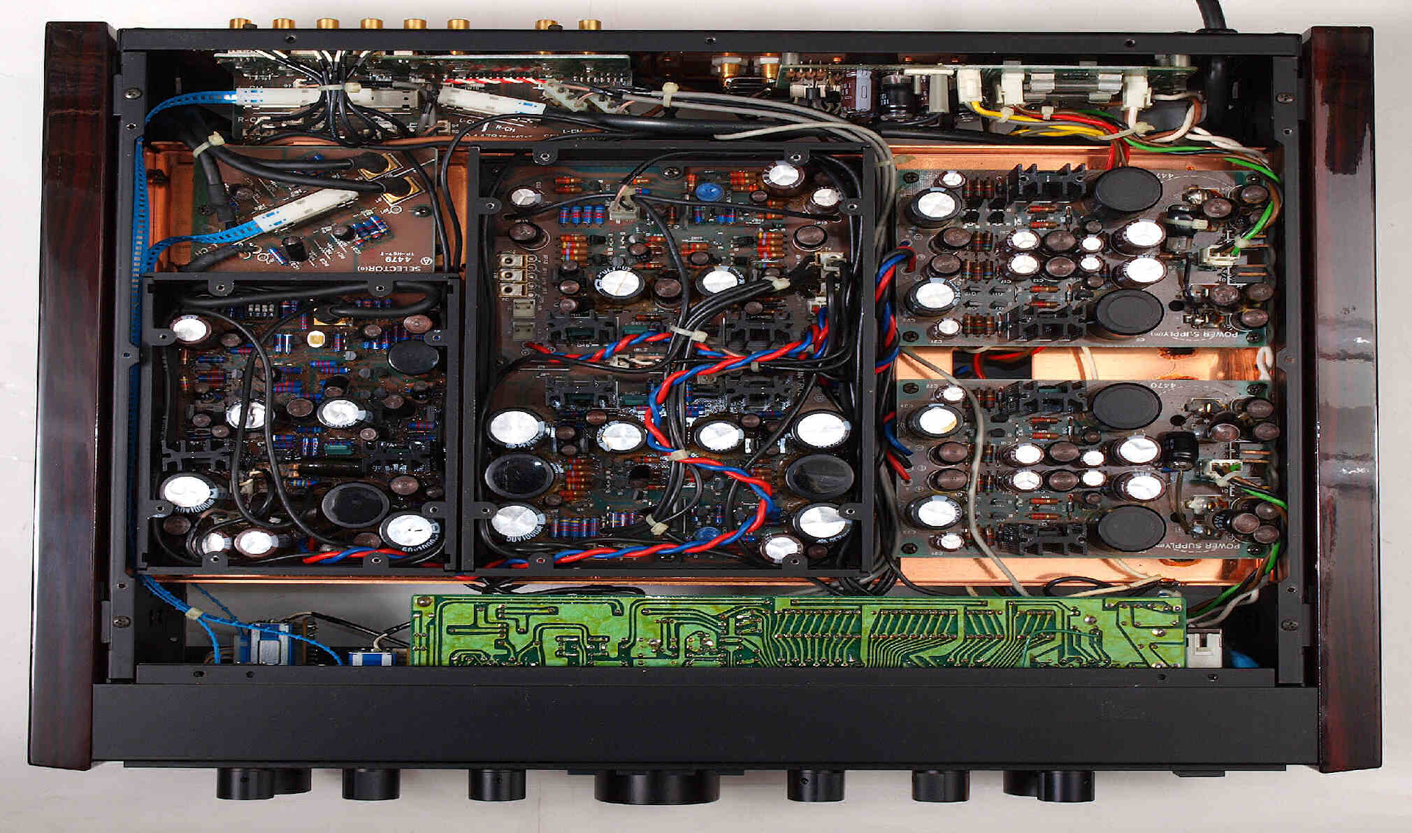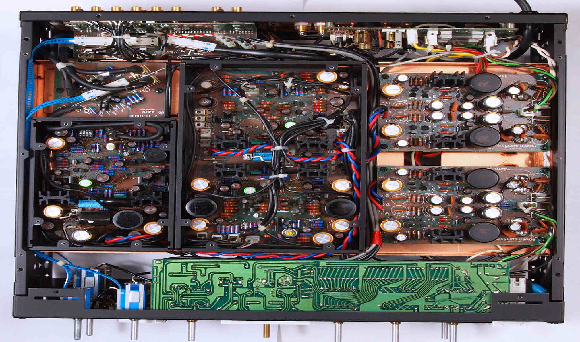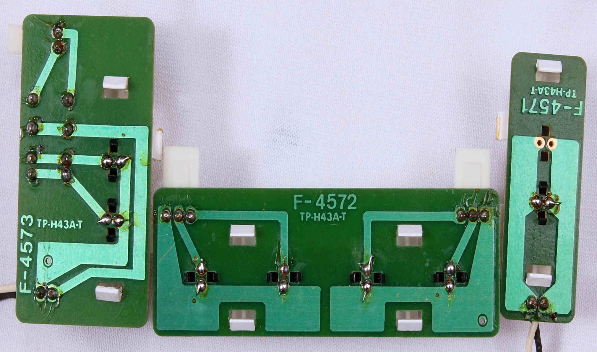 | CC21. 修理前 表示LED基板、 左=PowerAmp、 中=Adaptor・Muting・SourceDirect・SUBsonic、 右=テープREC。 | ||||||||||||||||||