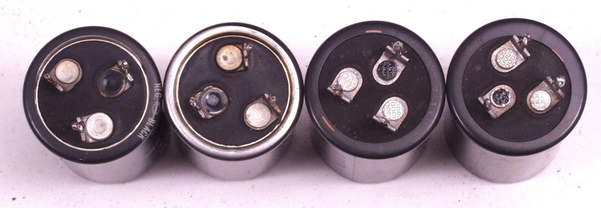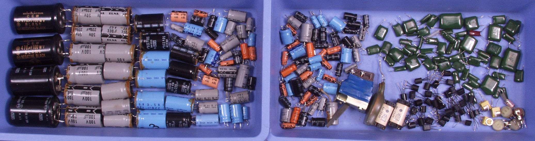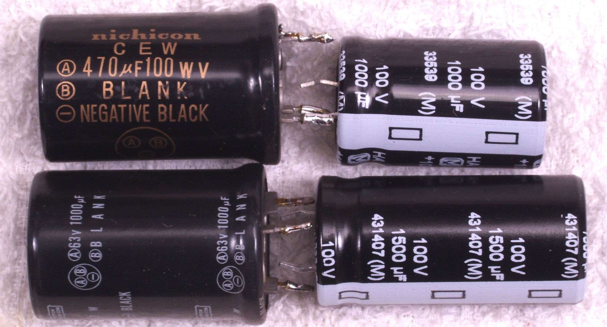 A−4. 修理前点検中 電解コンデンサー比較 右=付いていた物 左=交換する新しい物