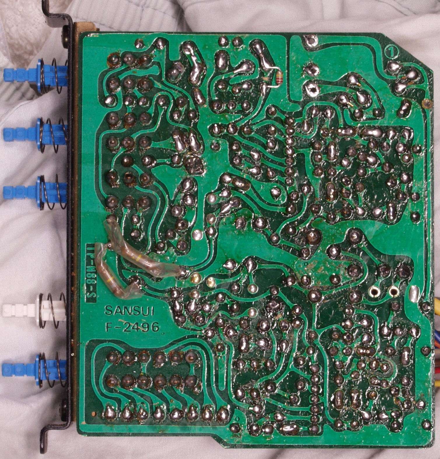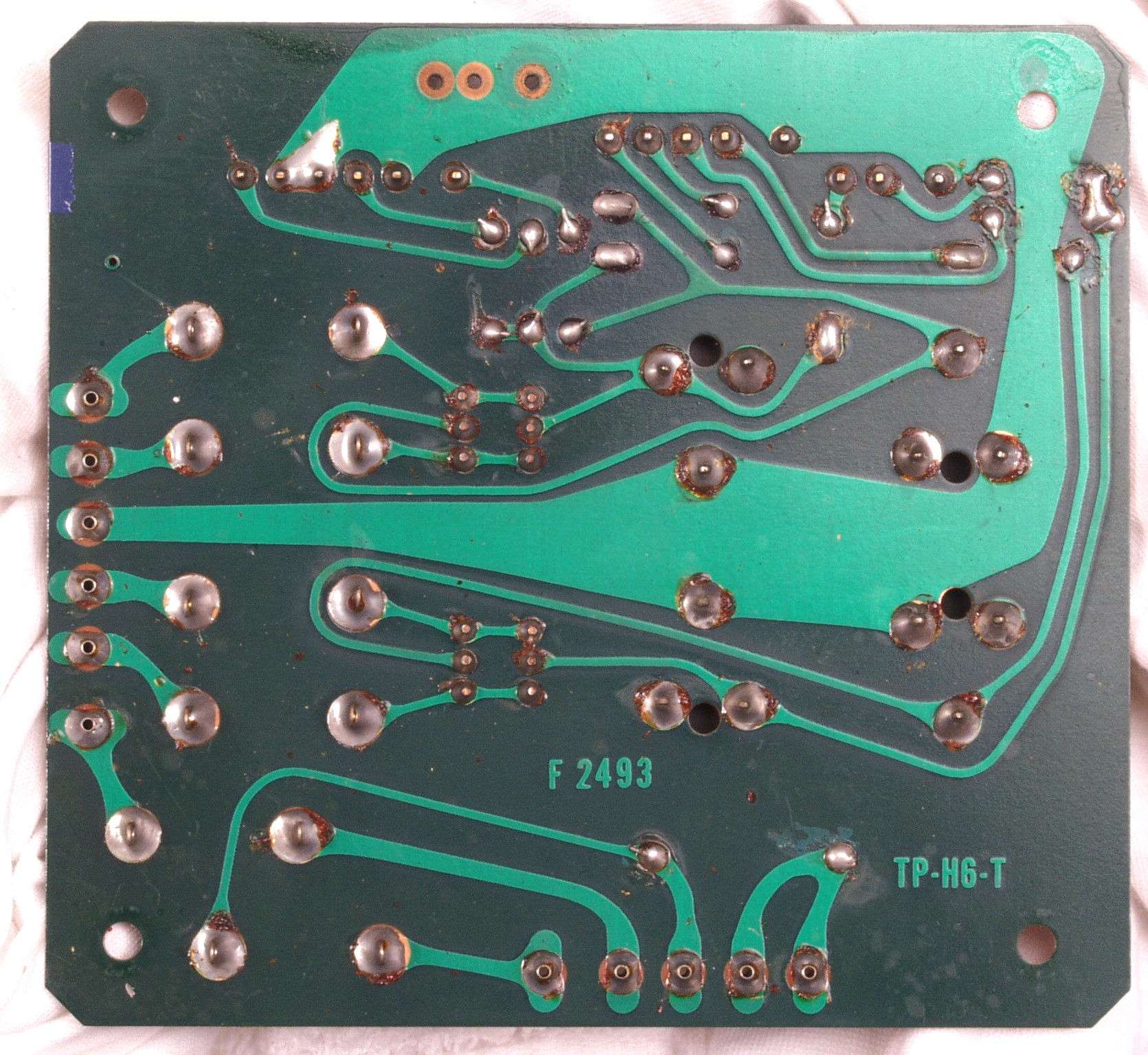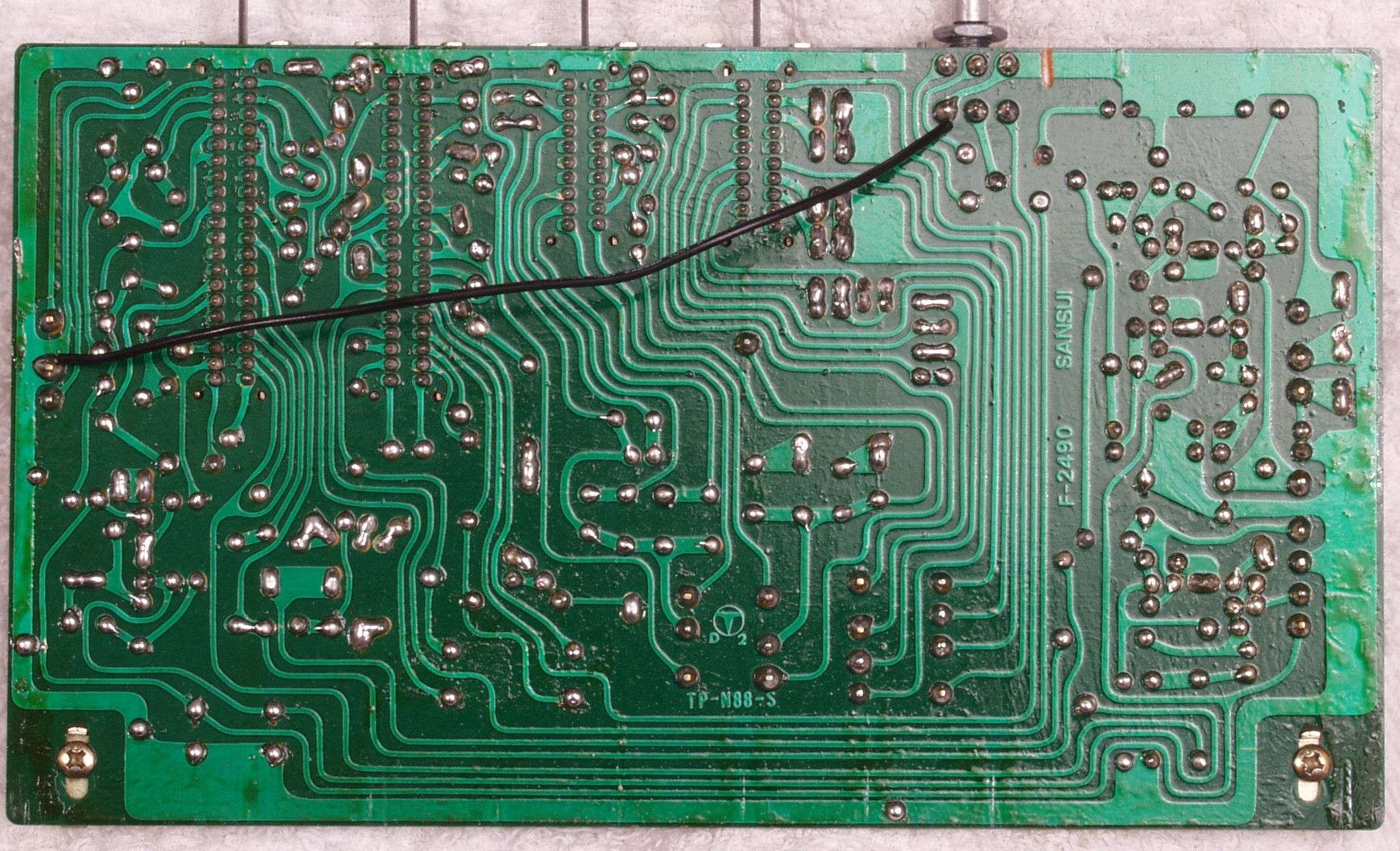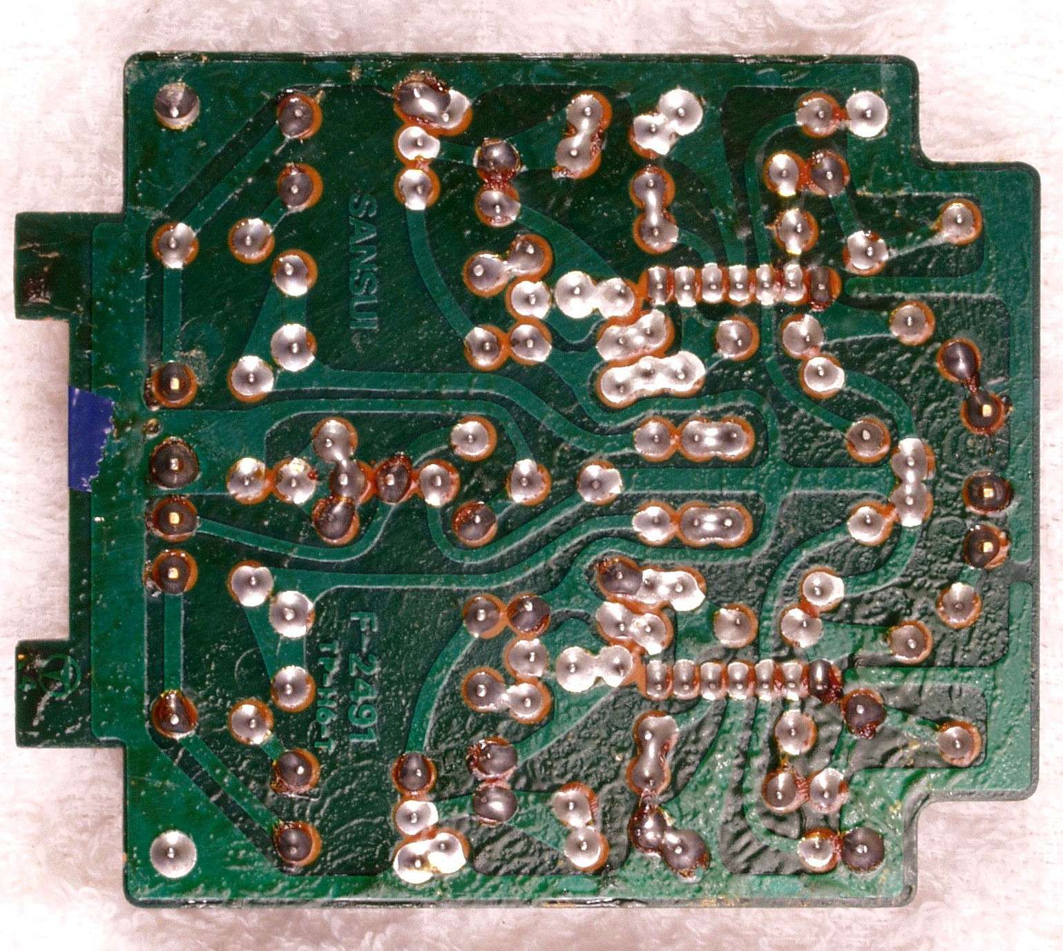 C−2C. 修理前 メイン基板裏 色が変化している所は、接点復活材を吹いた後
