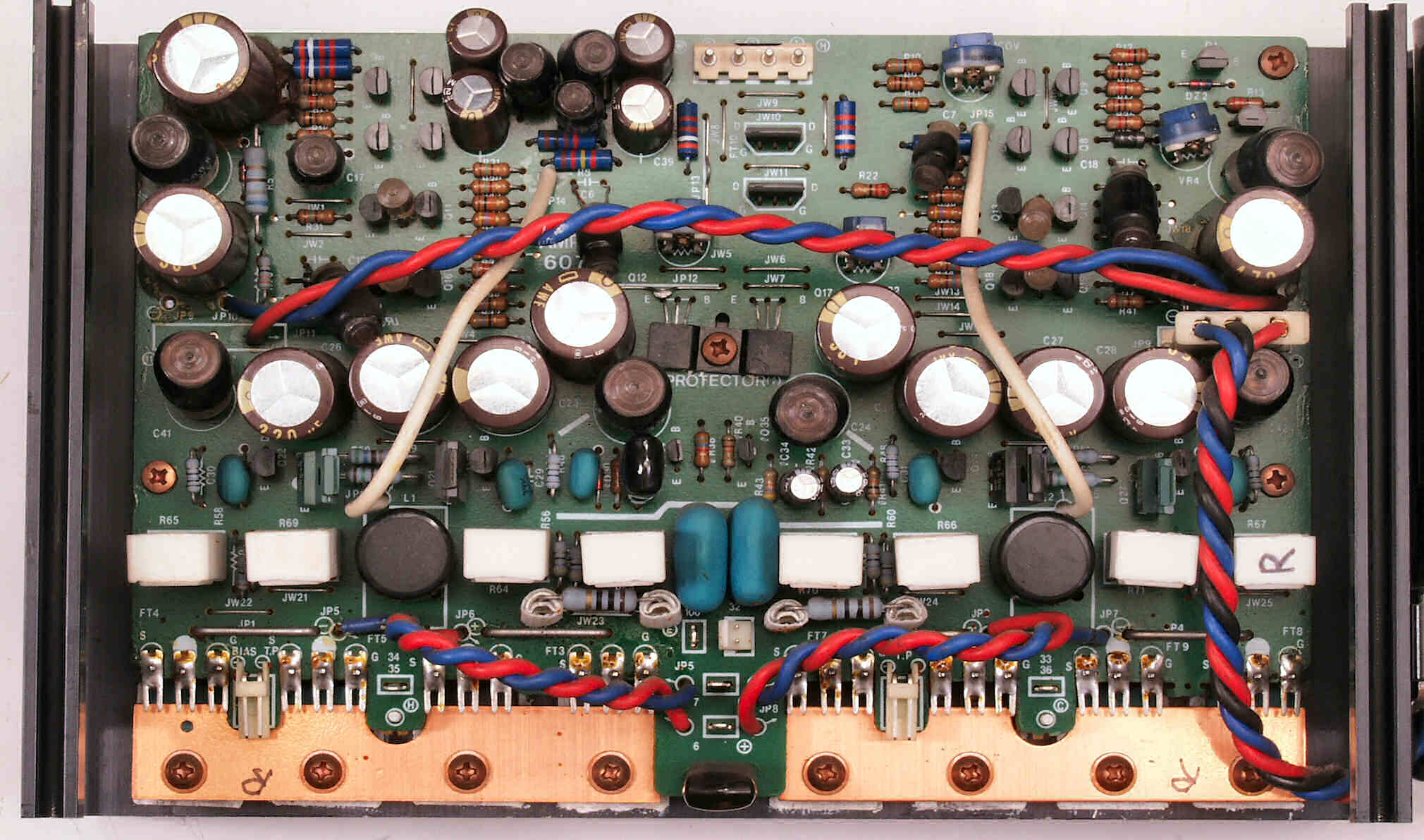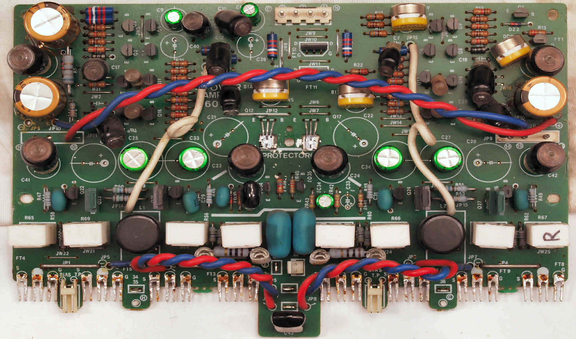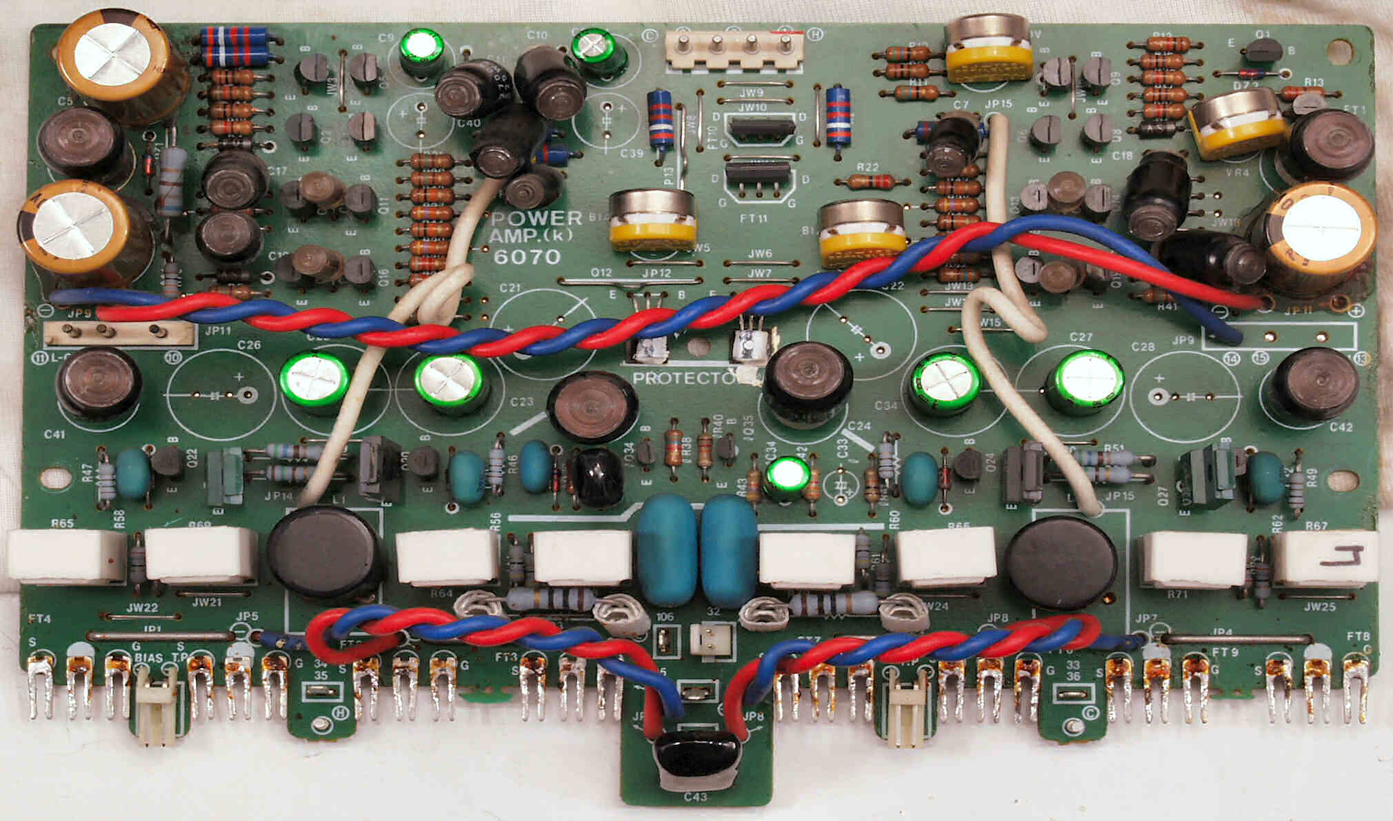 | C1D. 修理後 R側終段基板 初段FET(電界効果トランジスター)2個、半固定VR3個、電解コンデンサー17個交換 カップリング電解コンデンサーはバイポーラー電解コンデンサーに交換したので個数減少 |