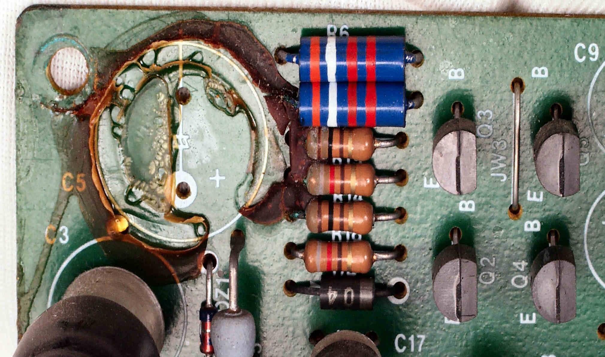 | C1C1. 修理中 R側終段基板。 電解コンデンサー接着剤が抵抗のリード線を腐食している、気長に落とす。 | ||||||||||||||||||||||||||||||||||||||||||||||||||||||||||||