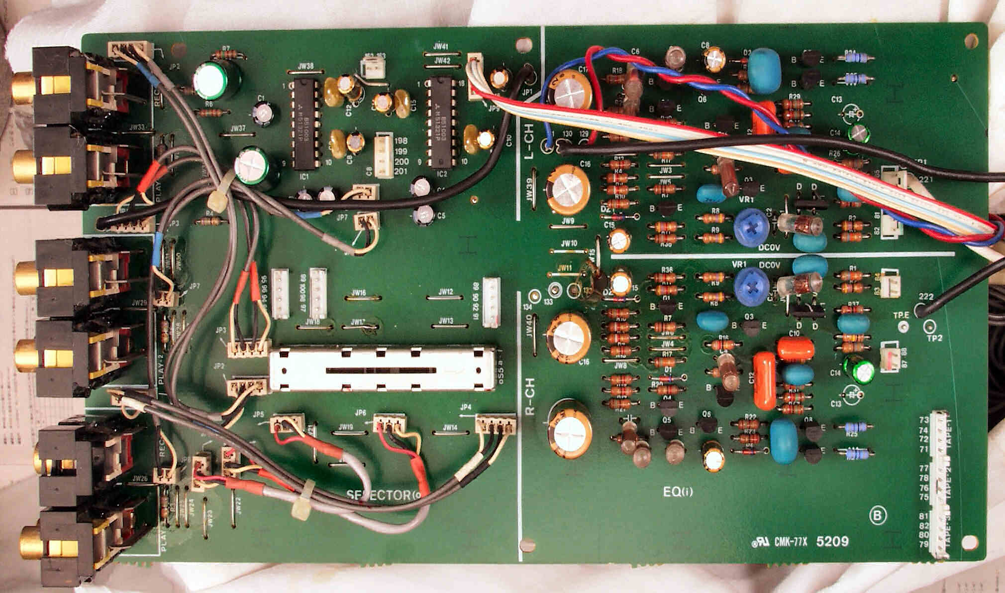| C6B. 修理後 EQ・Video SW基板 音が通る結合(カップリング)コンデンサーは、BPコンデンサーに交換したので2個→1個 電解コンデンサー23個、FET(電界効果トランジスター)2個交換 |