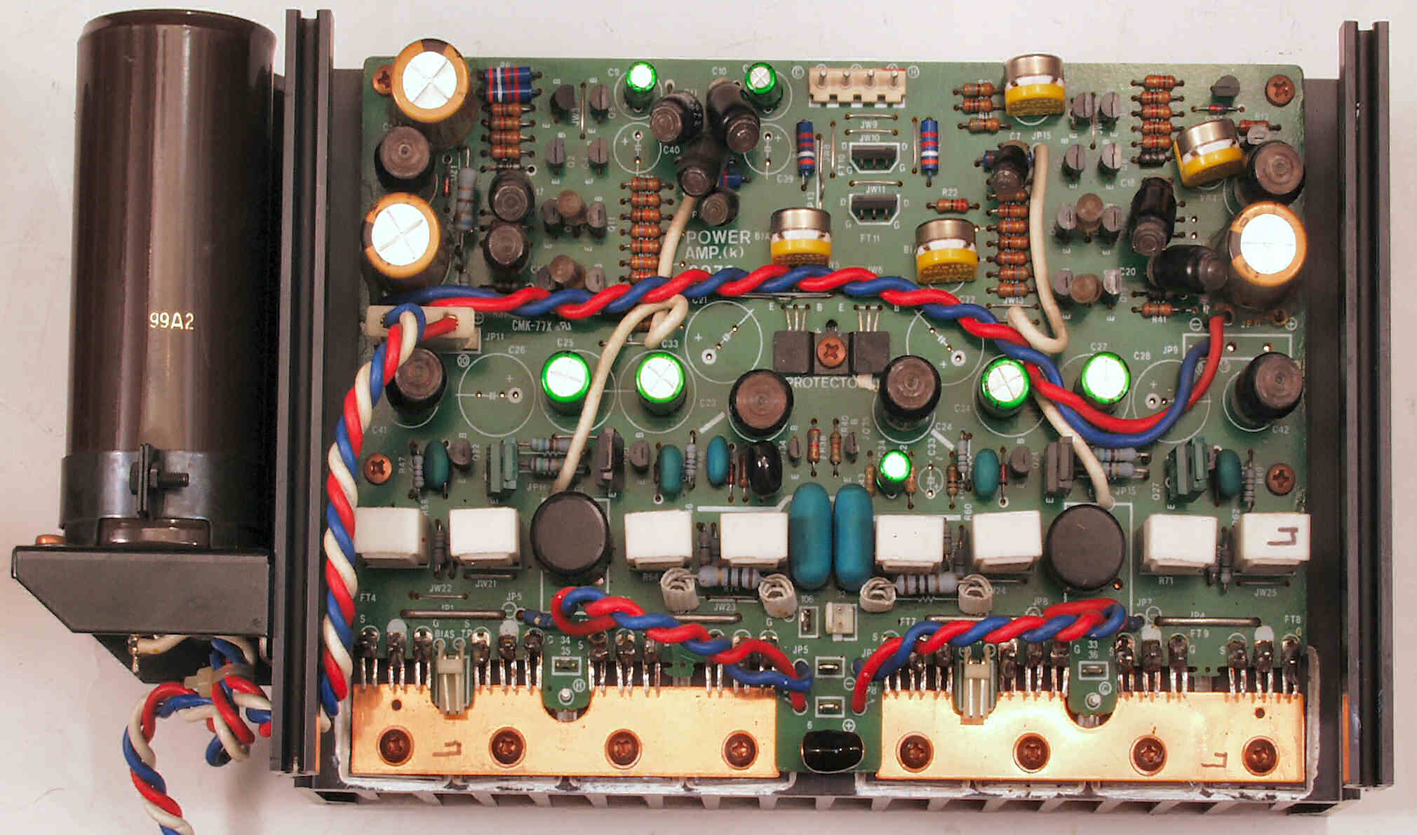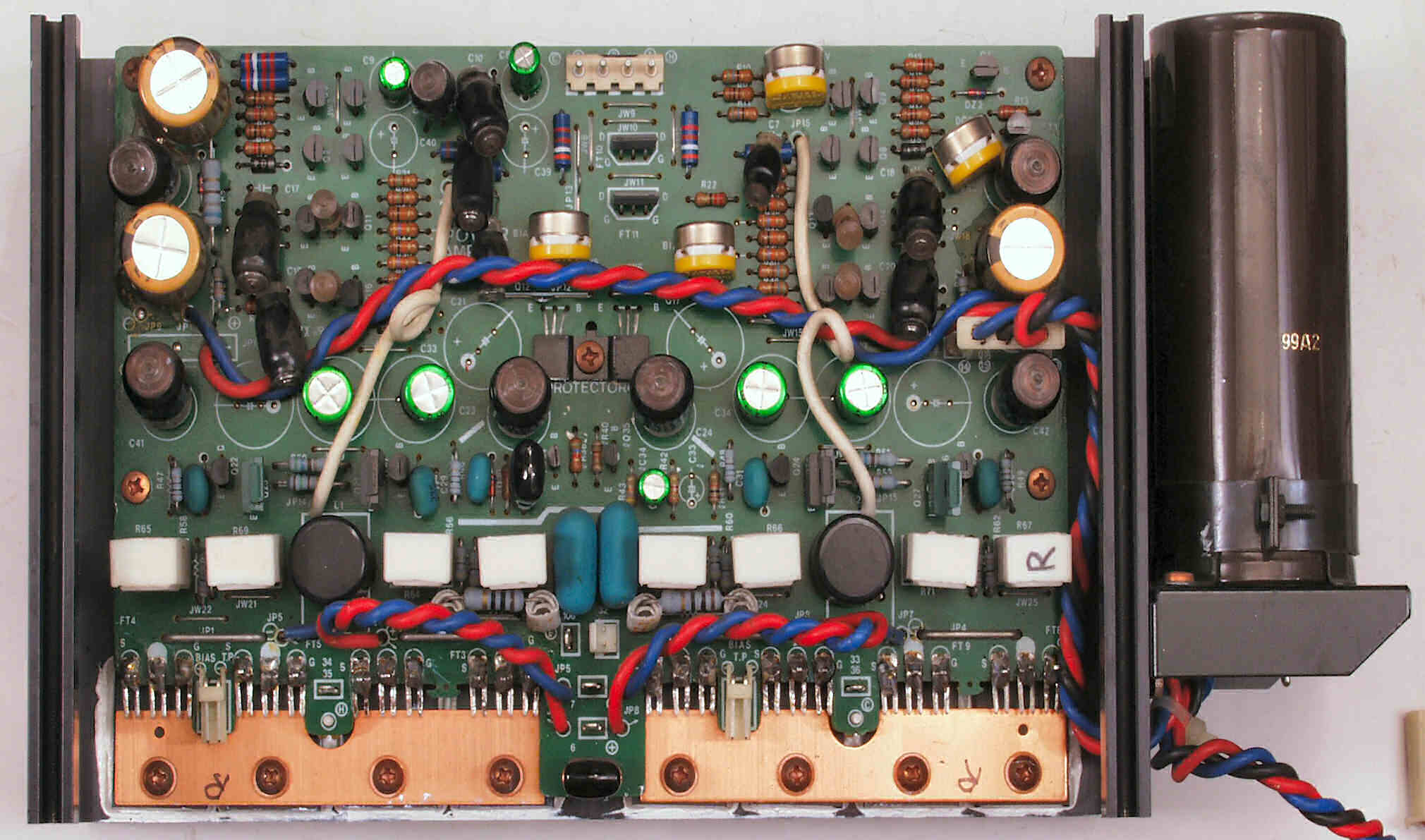 | C2D. 修理後 L側終段基板 初段FET(電解トランジスタ−)2個、半固定VR3個、電解コンデンサー17個交換 カップリング電解コンデンサーはバイポーラー電解コンデンサーに交換したので個数減少 |
