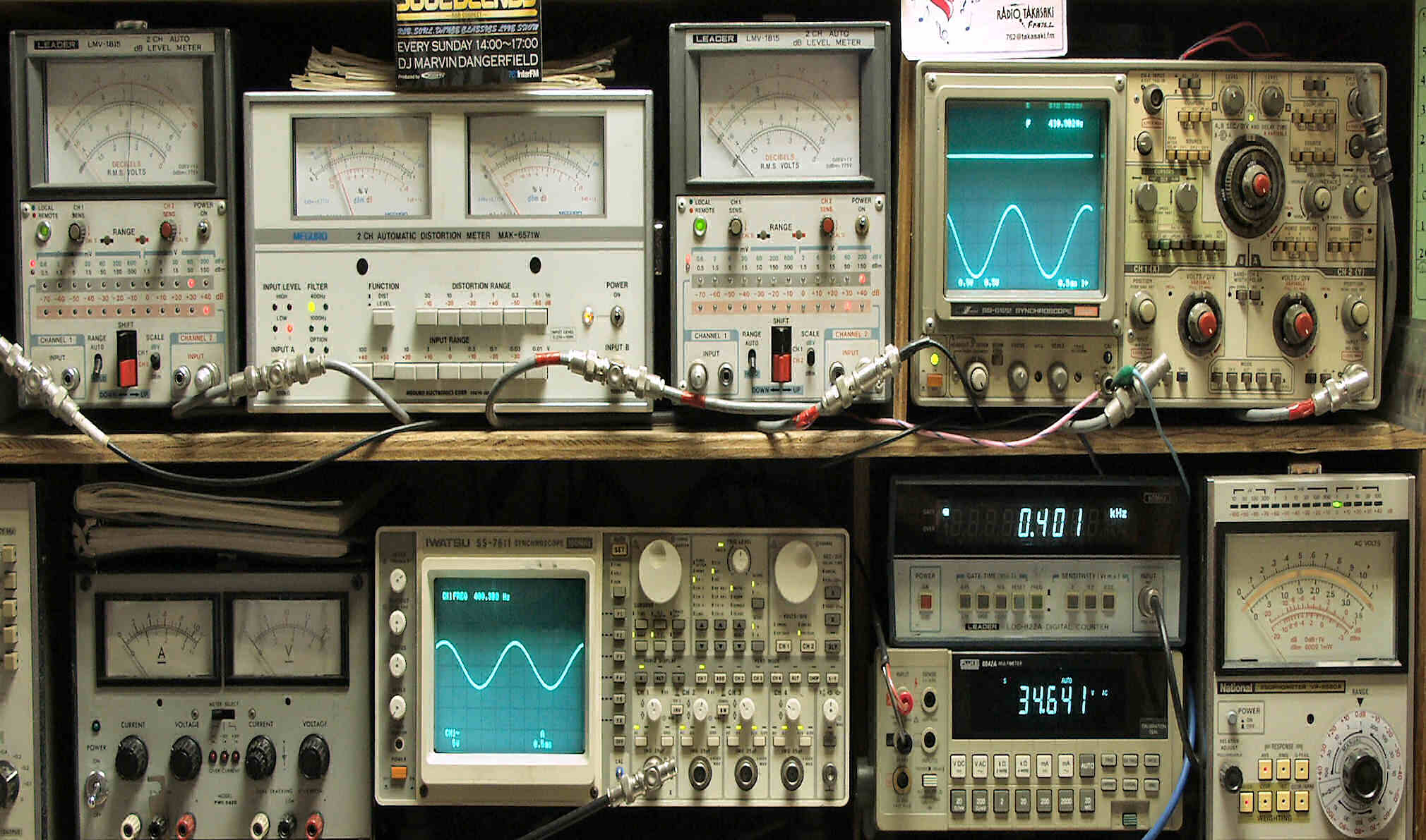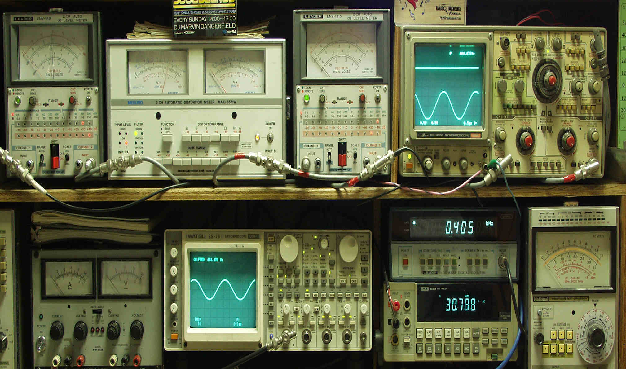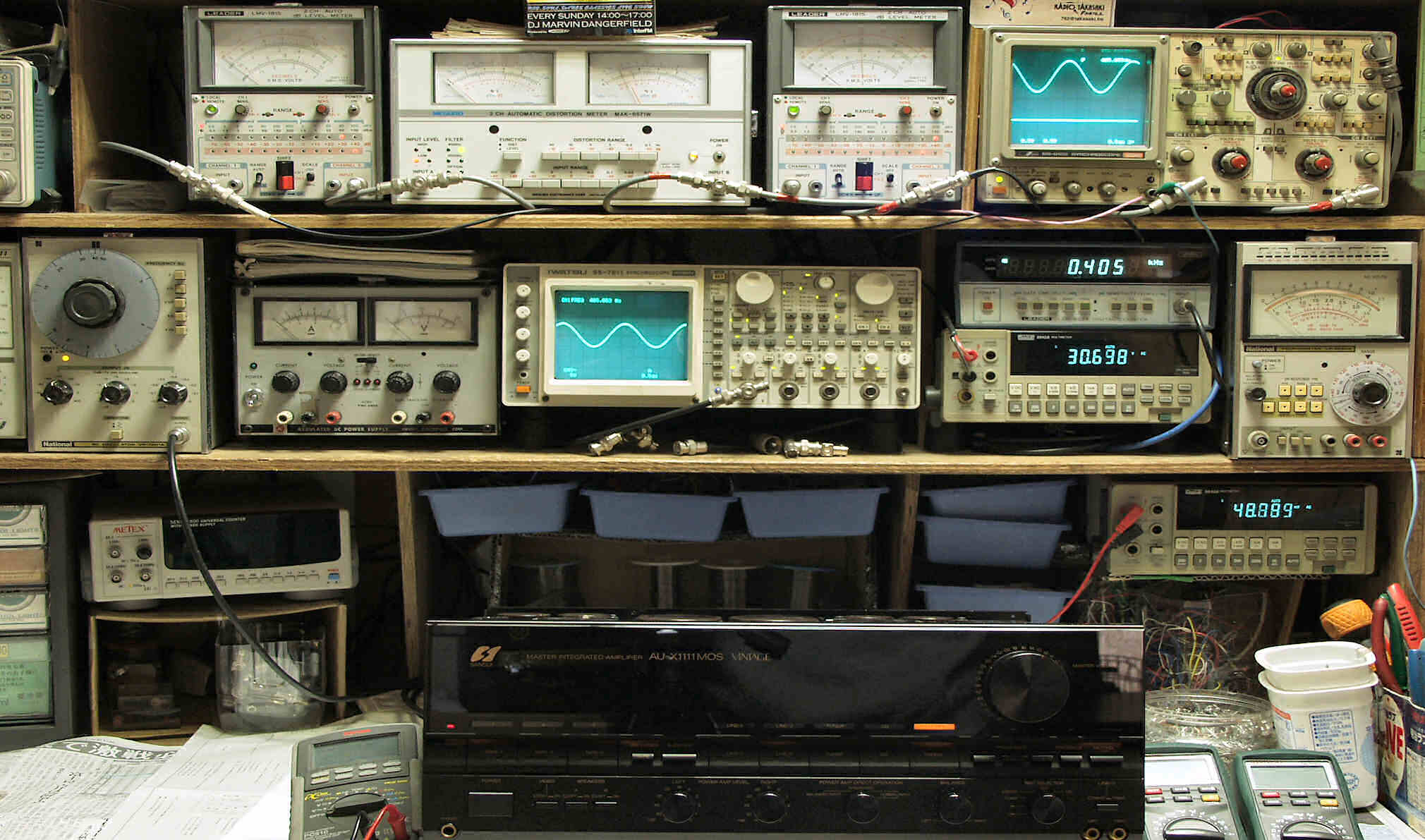 | T. 修理前・測定 T1. 出力/歪み率測定・調整 <見方> 下段左端 オーディオ発振器より400HZ・1KHZの信号を出し(歪み率=約0.003%)これをAMPに入力し、出力を測定 下段中左 オシロ=入力波形(オーディオ発振器のTTLレベル) 下段中右上=周波数計 上段左端 電圧計=L側出力電圧測定、黒針のみ使用 上段中左 歪み率計=出力の歪み率測定 左メータ=L出力、右メータ=R出力 上段中右 電圧計=R側出力電圧測定、赤針のみ使用 上段右端 オシロ=出力波形 上=R出力、下=L出力(実際にはRL電圧計の出力「Max=1V」を観測) 下段中右上 デジタル電圧計=出力電圧測定RLは切り替えて測定 |