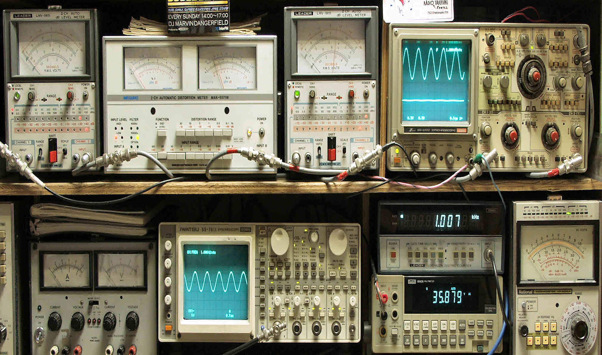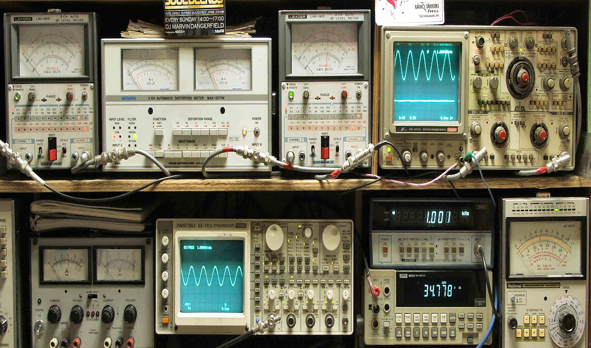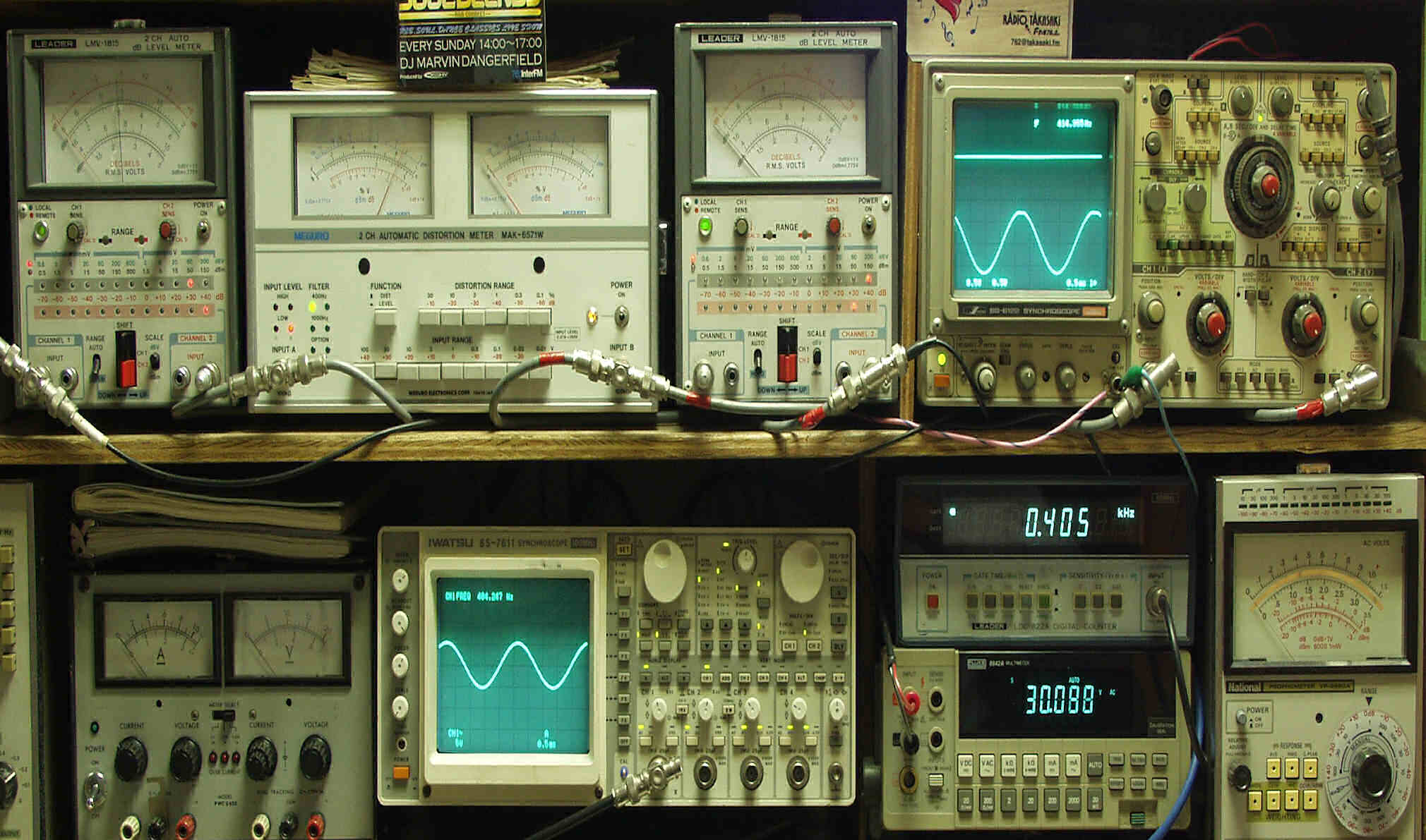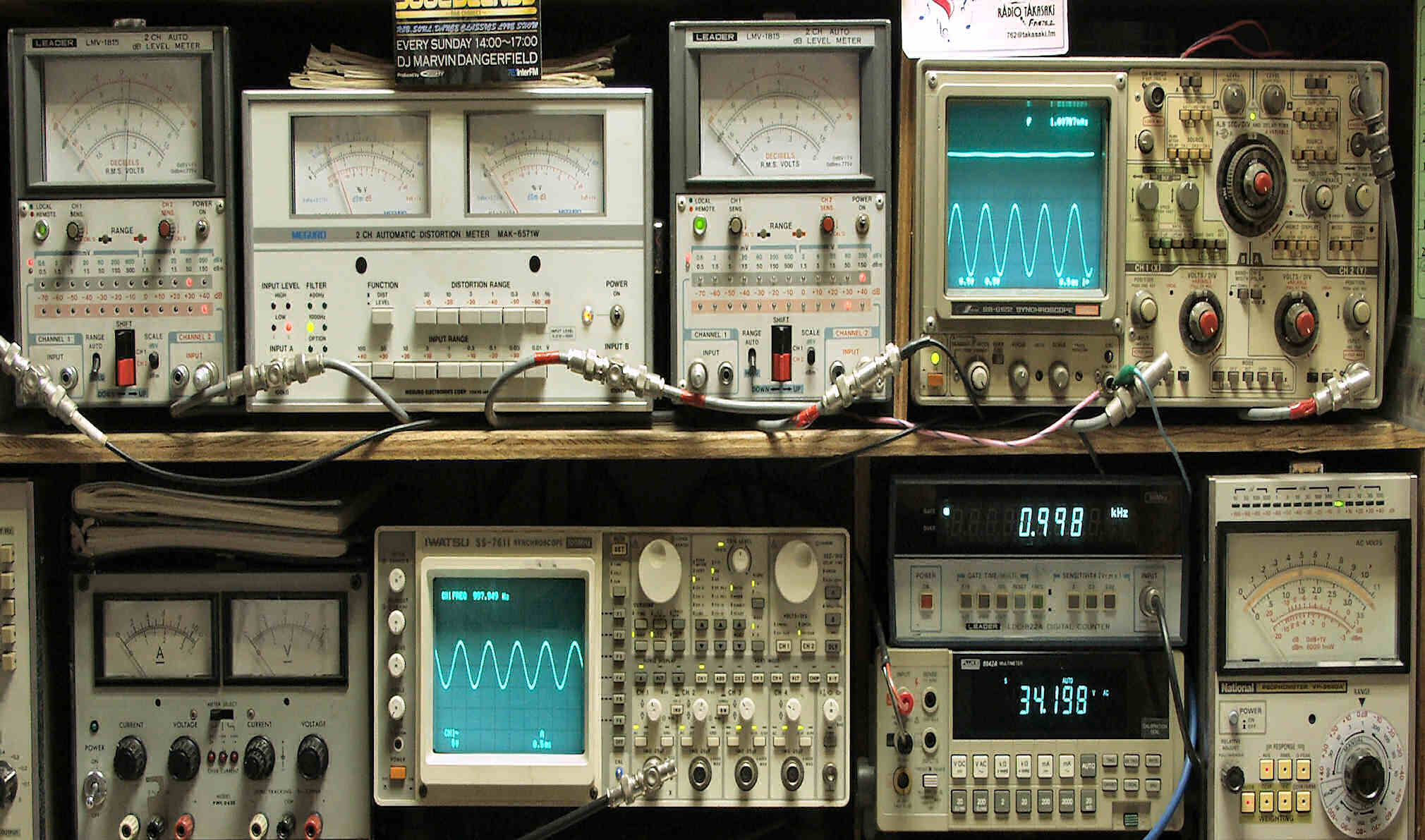 | T. 修理前・測定 T1. 出力/歪み率測定・調整 <見方> 下段左端 オーディオ発振器より400HZ・1KHZの信号を出し(歪み率=約0.003%)これをAMPに入力し、出力を測定 下段中左 オシロ=入力波形(オーディオ発振器のTTLレベル) 下段中右上=周波数計 上段左端 電圧計=L側出力電圧測定、黒針のみ使用 上段中左 歪み率計=出力の歪み率測定 左メータ=L出力、右メータ=R出力 上段中右 電圧計=R側出力電圧測定、赤針のみ使用 上段右端 オシロ=出力波形 上=R出力、下=L出力(実際にはRL電圧計の出力「Max=1V」を観測) 下段中右上 デジタル電圧計=出力電圧測定RLは切り替えて測定 |