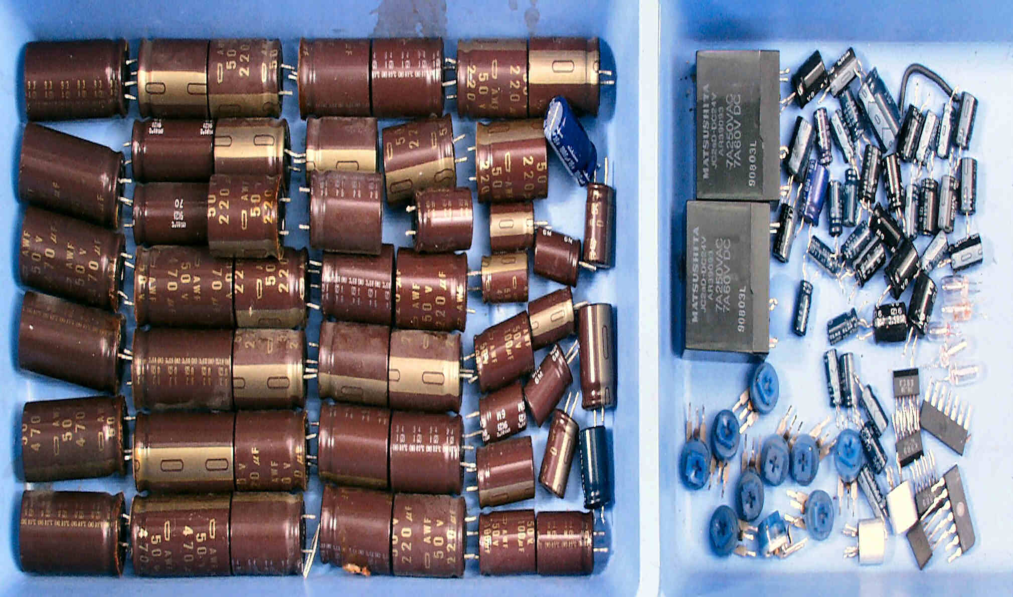 | CHB. 交換部品。 下のビニールが剥けた電解コンデンサー、左のと比較すると良く解る。 | ||||||||||||||||||||||||||||||||||||||||||||||||||||||||||||