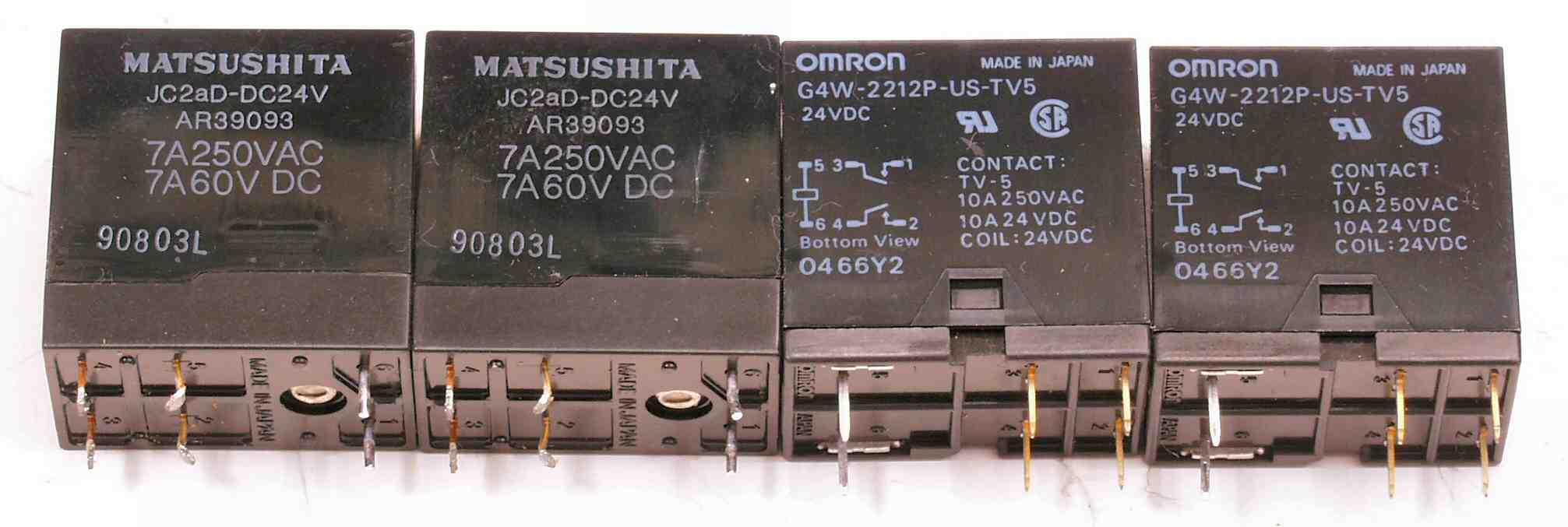 | C3B. 修理中 SP接続リレー比較 左=付いていた接点容量7A=8Ω出力だと392W定格 右=交換する接点容量10A=8Ω出力だと800W定格 |