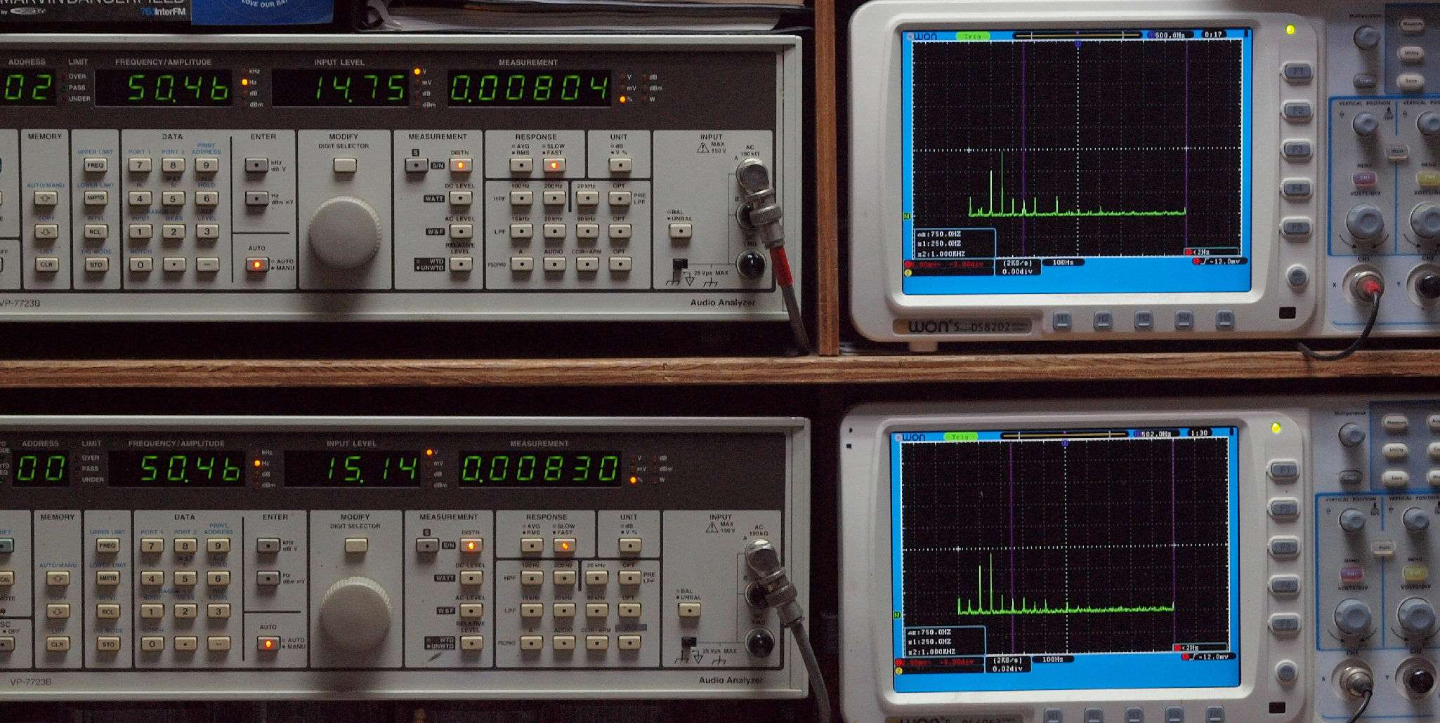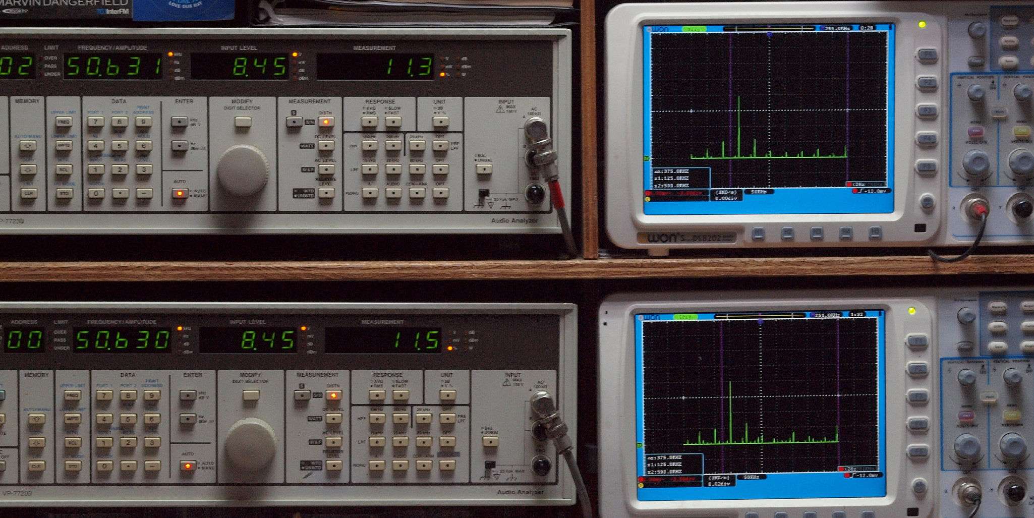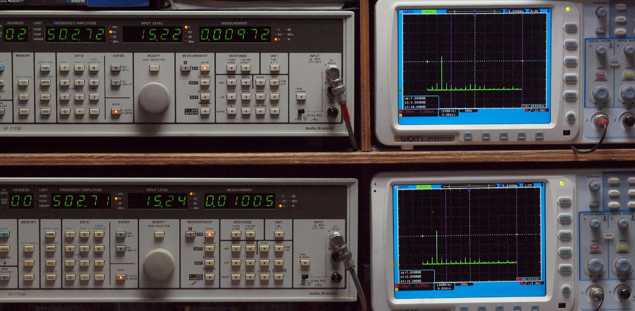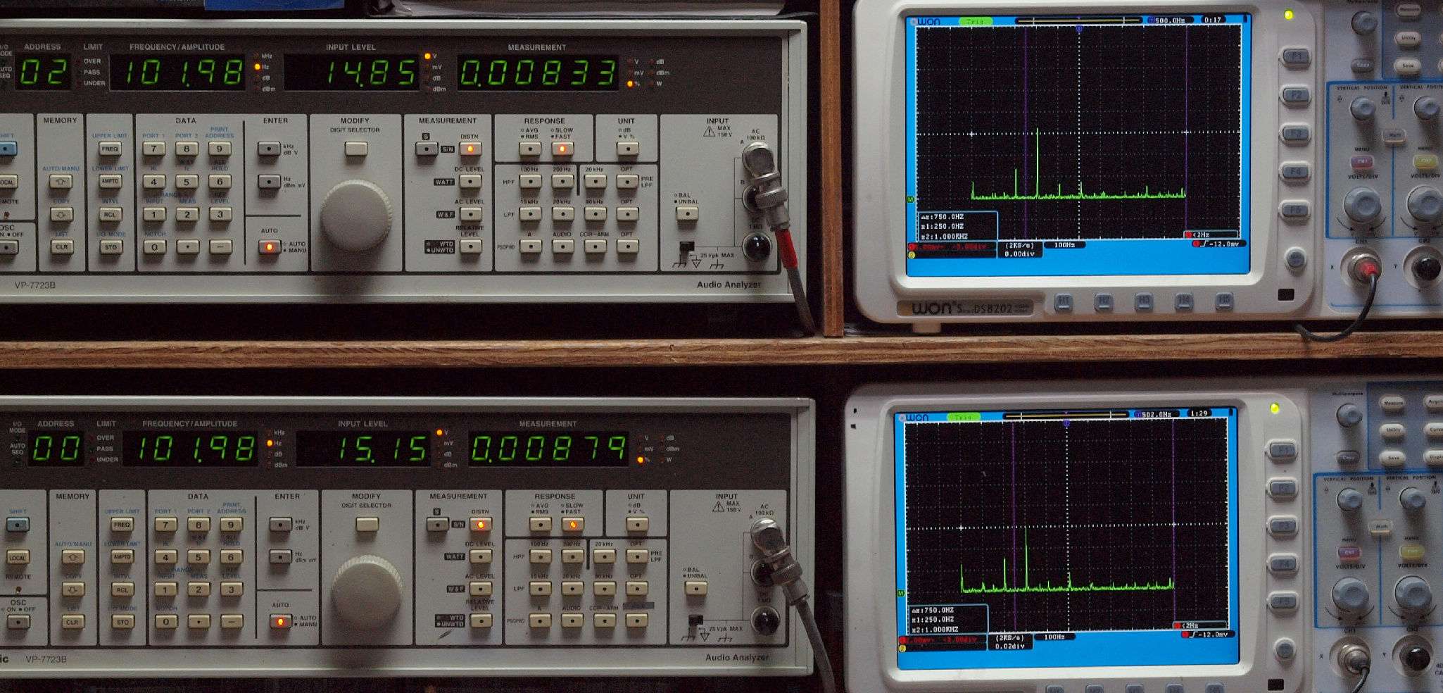 | E. 調整・測定。 画像をクリックすると、大きく(横幅2050ドット)表示されます。 E1. 出力・歪み率測定・調整。 「見方」。 上段中 右側SP出力を「Audio Analyzer Panasonic VP−7723B」により測定。 表示LED、 左端=メモリーNo、 中左=周波数測定、 中右=出力電圧測定、 右端=歪み率測定。 上段右端 VP−7723Bの基本波除去出力を「owon SDS8202(200MHZ)」で「FFT分析」表示。 下段中 左側SP出力を「Audio Analyzer Panasonic VP−7723B」により測定。 表示LED、 左端=メモリーNo、 中左=周波数測定、 中右=出力電圧測定、 右端=歪み率測定。 下段右端 VP−7723Bの基本波除去出力を「owon SDS6062(200MHZ)」で「FFT分析」表示。 下段左端 オーディオ発振器 VP−7201A より50Hz〜100kHzの信号を出し(歪み率=約0.003%)、ATT+分配器を通し、AMPに入力。 よって、ダイアル設定出力レベルより低くなります。測定機器の仕様や整備の様子はこちら、「VP−7723B」「VP−7201A」。 FFT画面の見方はこちら。 |