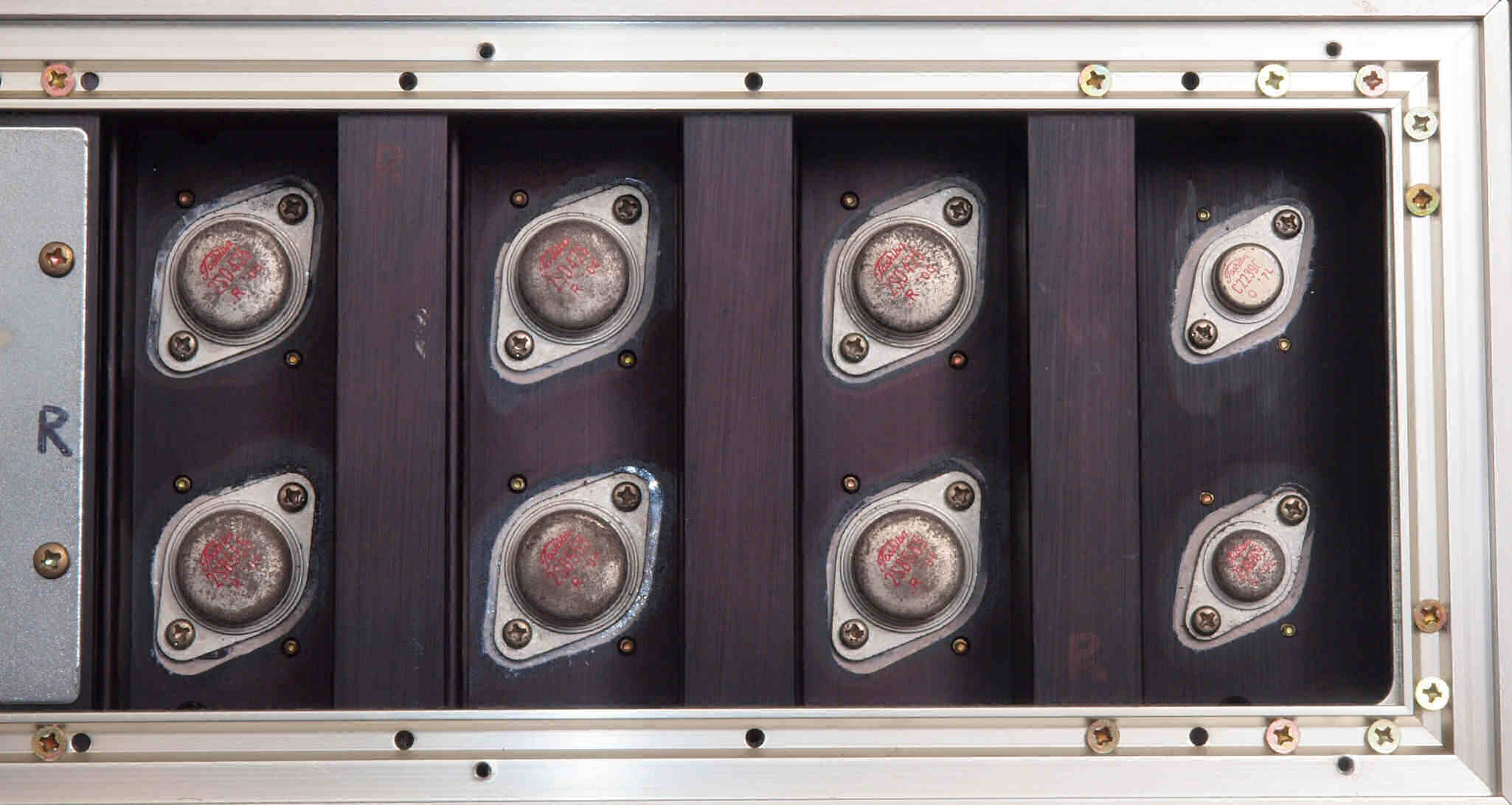 | B1. 点検中 R側終段TR(トランジスター)。 2SD425/2SB555の3パラレル接続。左右で異なる! | |
